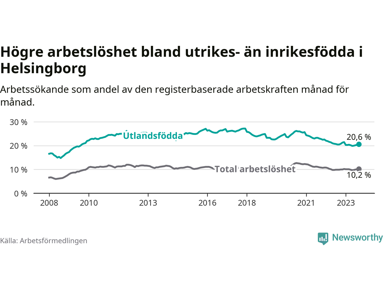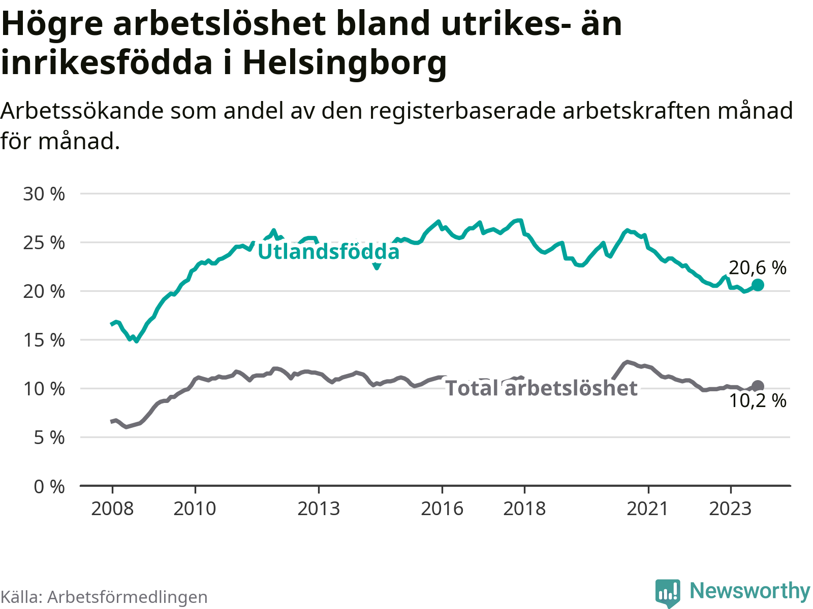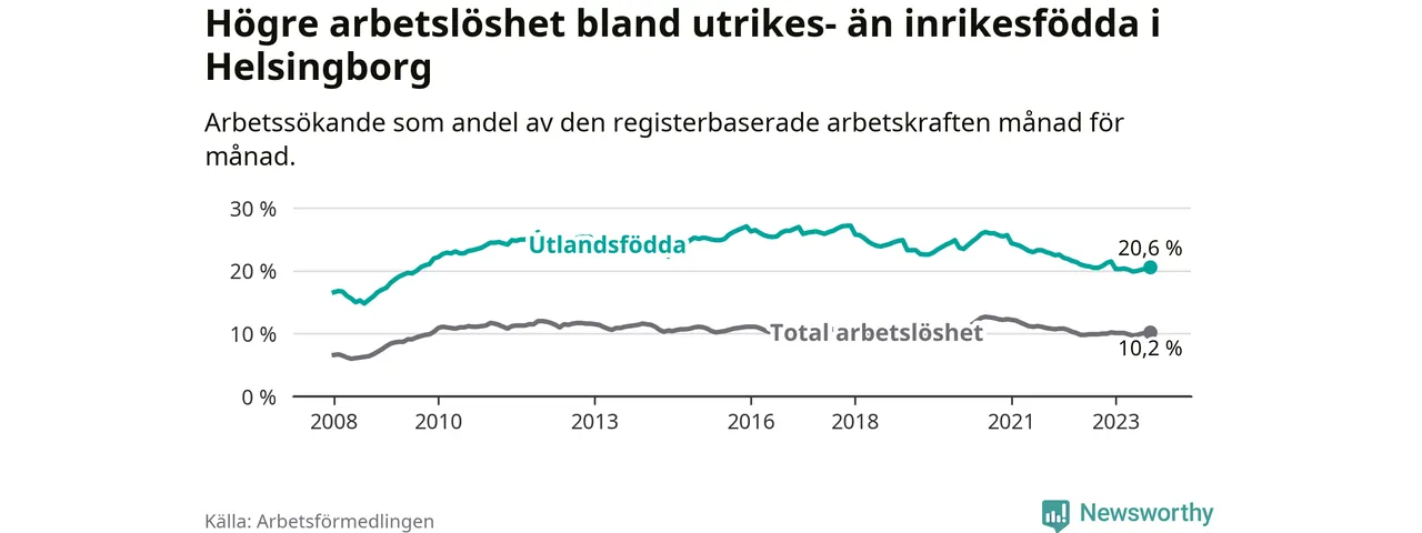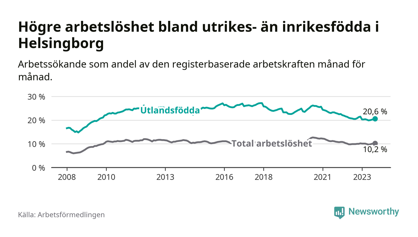 Arbetslösheten bland utlandsfödda var 20,6 procent i Helsingborg under september månad, motsvarande 5 058 av 24 553 personer. Det är 0,1 procentenheter fler än vid samma tidpunkt i fjol (+436 om man räknar personer). Den senaste månadens uppgång innebär ett trendbrott. Under de 30 föregående månaderna hade arbetslösheten bland utlandsfödda varit lägre än motsvarande tidpunkt året innan.