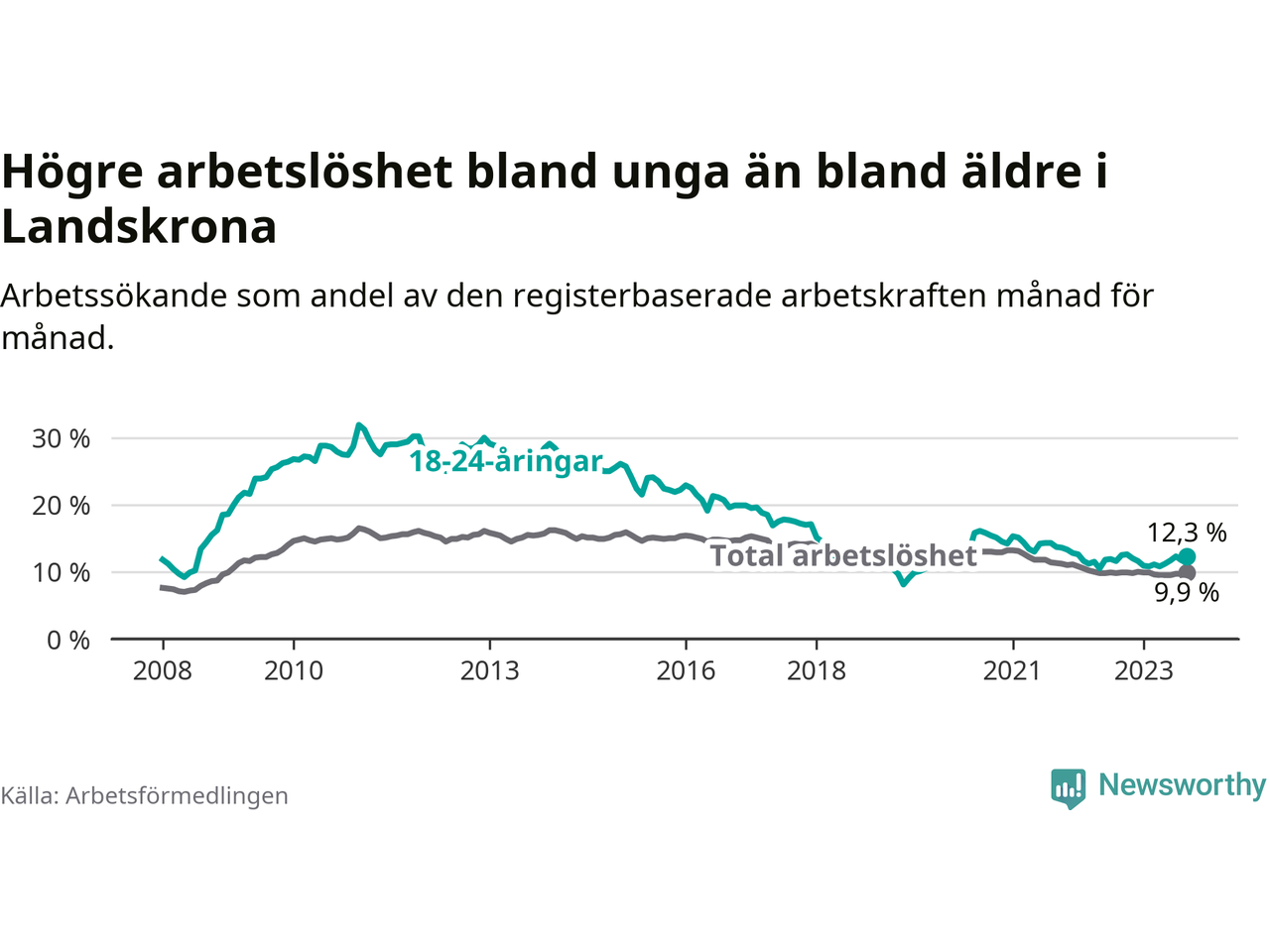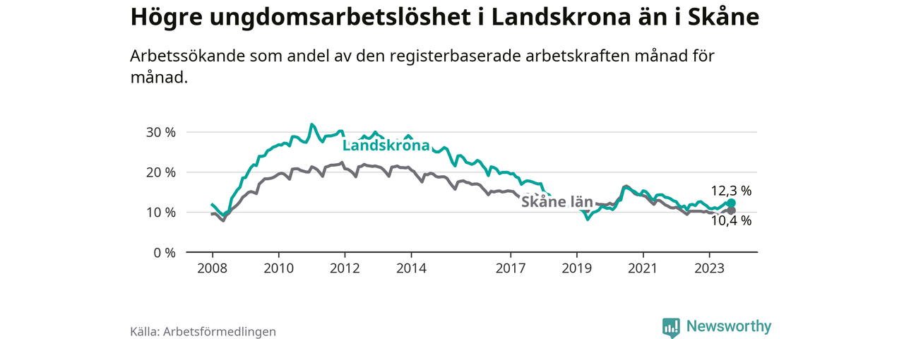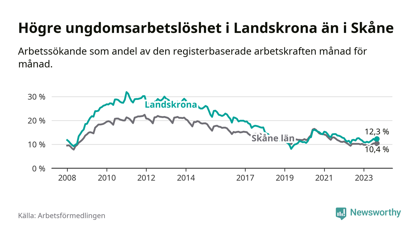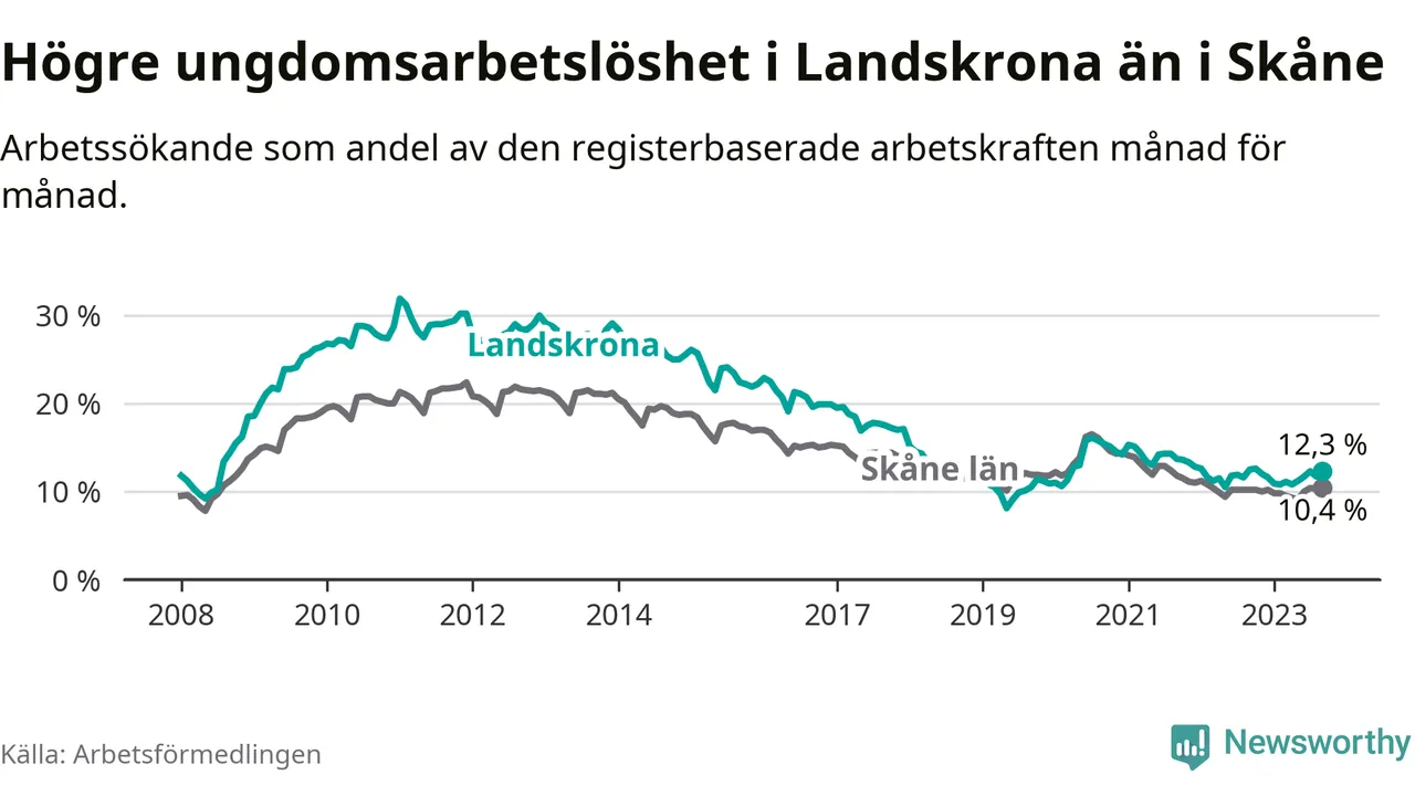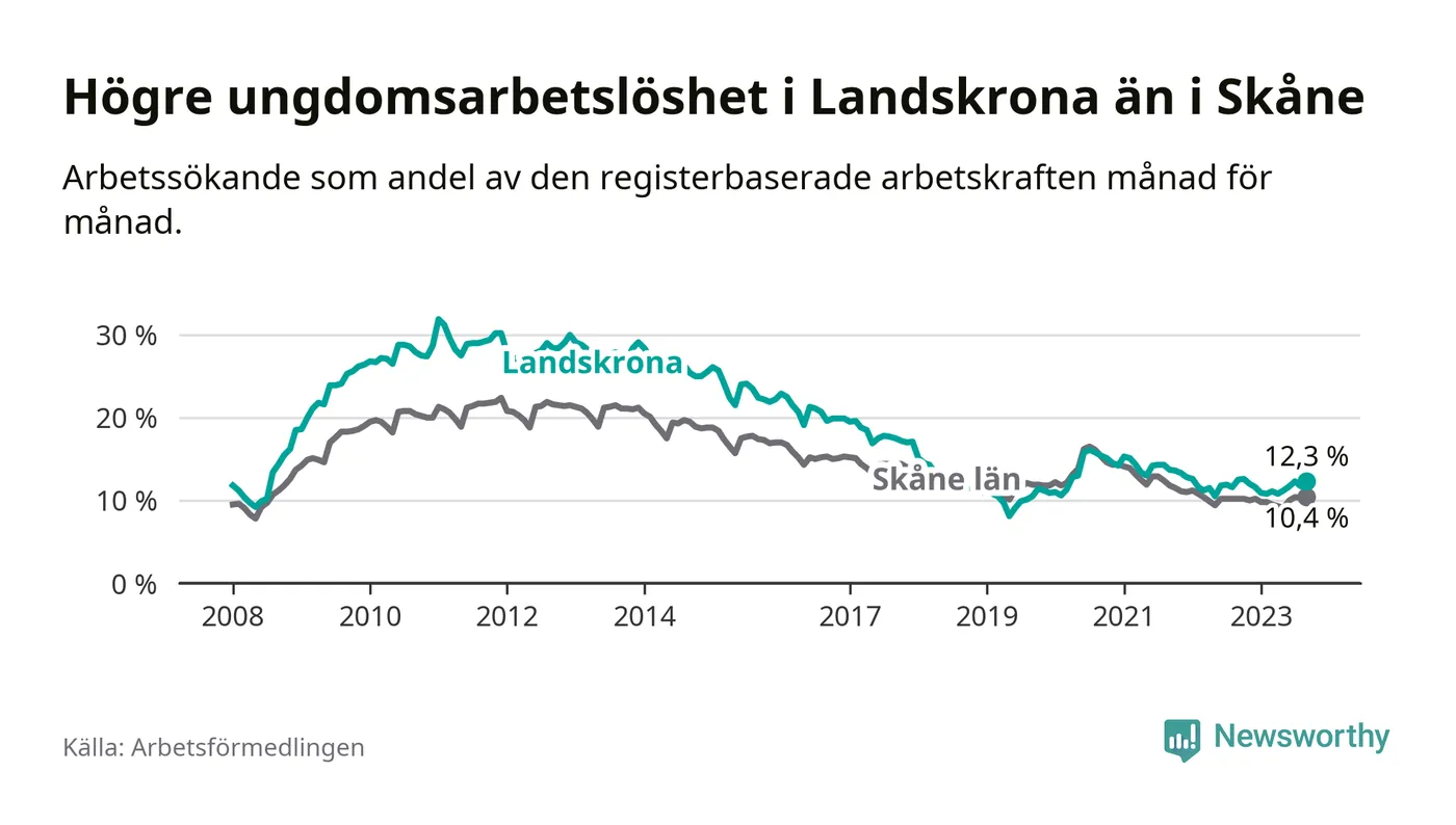 Precis som den totala arbetslösheten ligger ungdomsarbetslösheten i Landskrona högre än i Skåne som helhet. Skillnaden mellan kommunen och länet är 1,9 procentenheter.