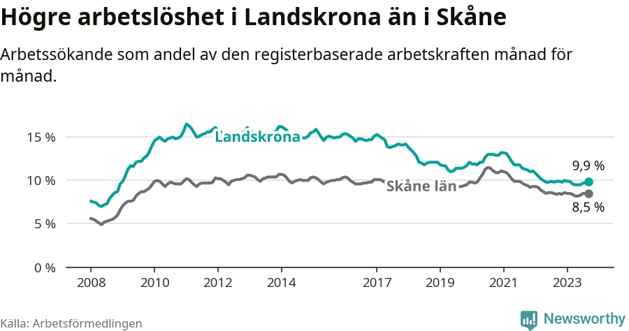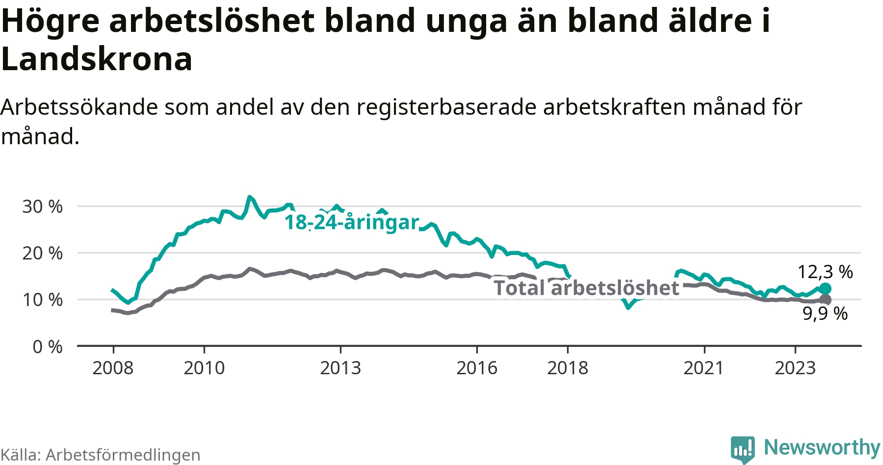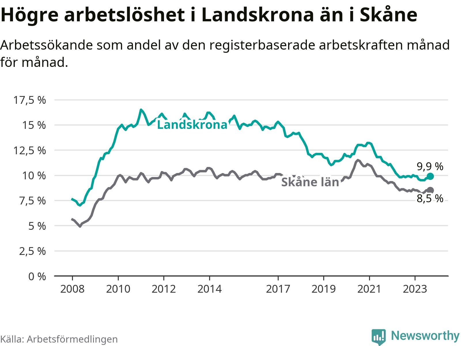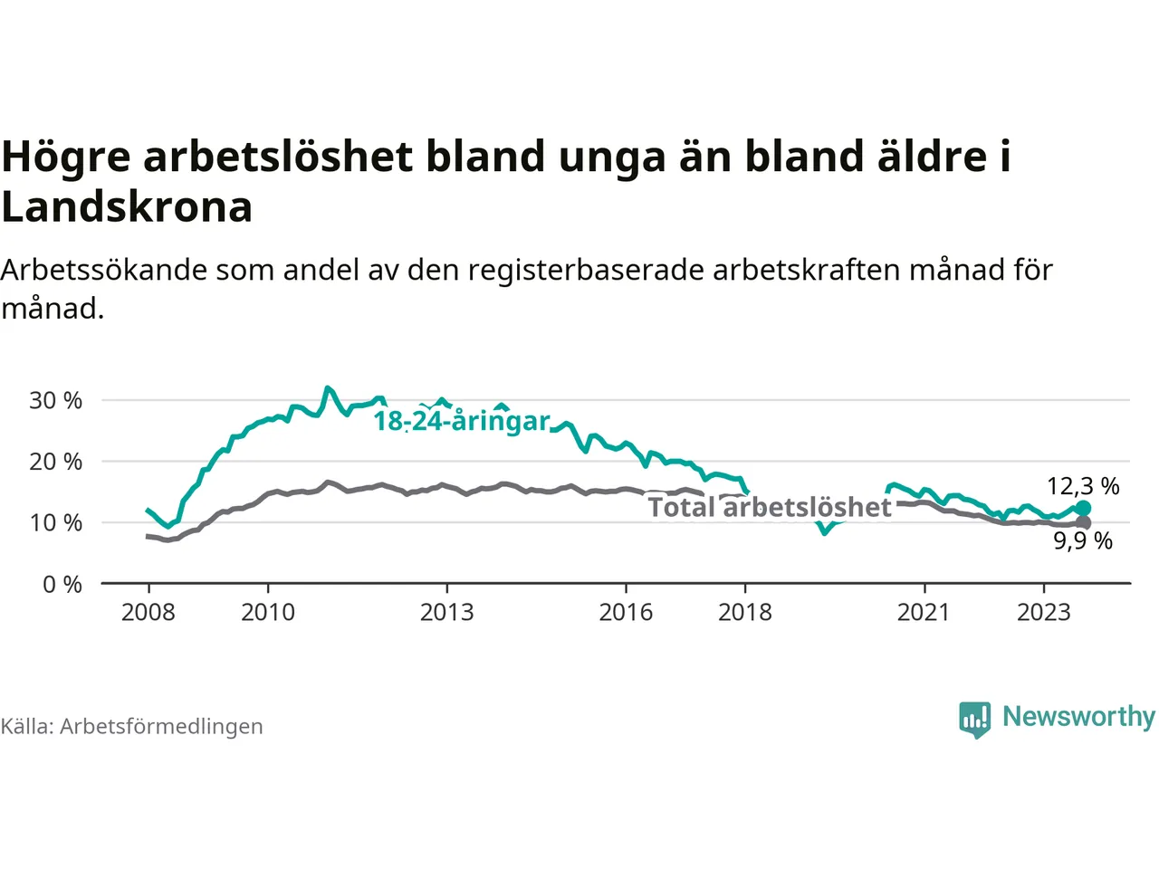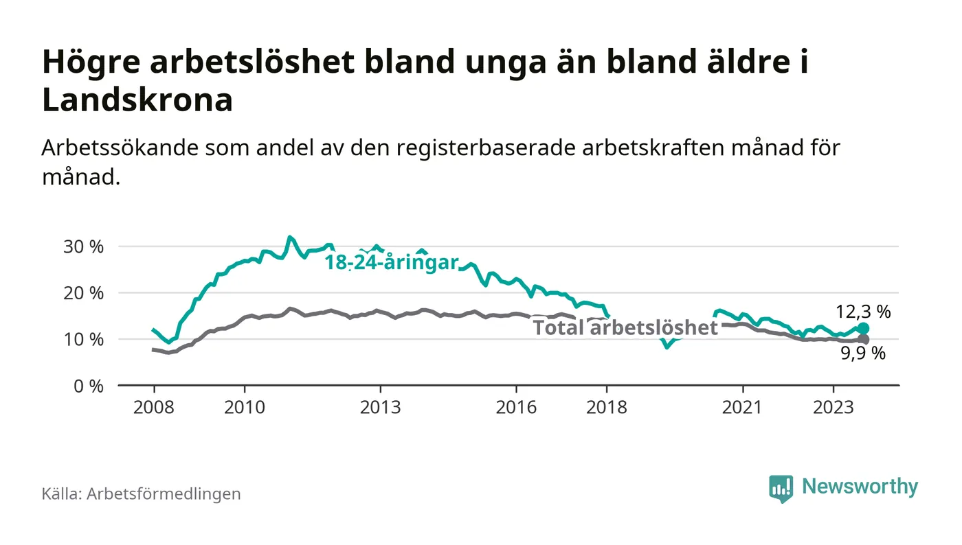 Precis som den totala arbetslösheten ligger ungdomsarbetslösheten i Landskrona högre än i Skåne som helhet. Skillnaden mellan kommunen och länet är 1,9 procentenheter.
