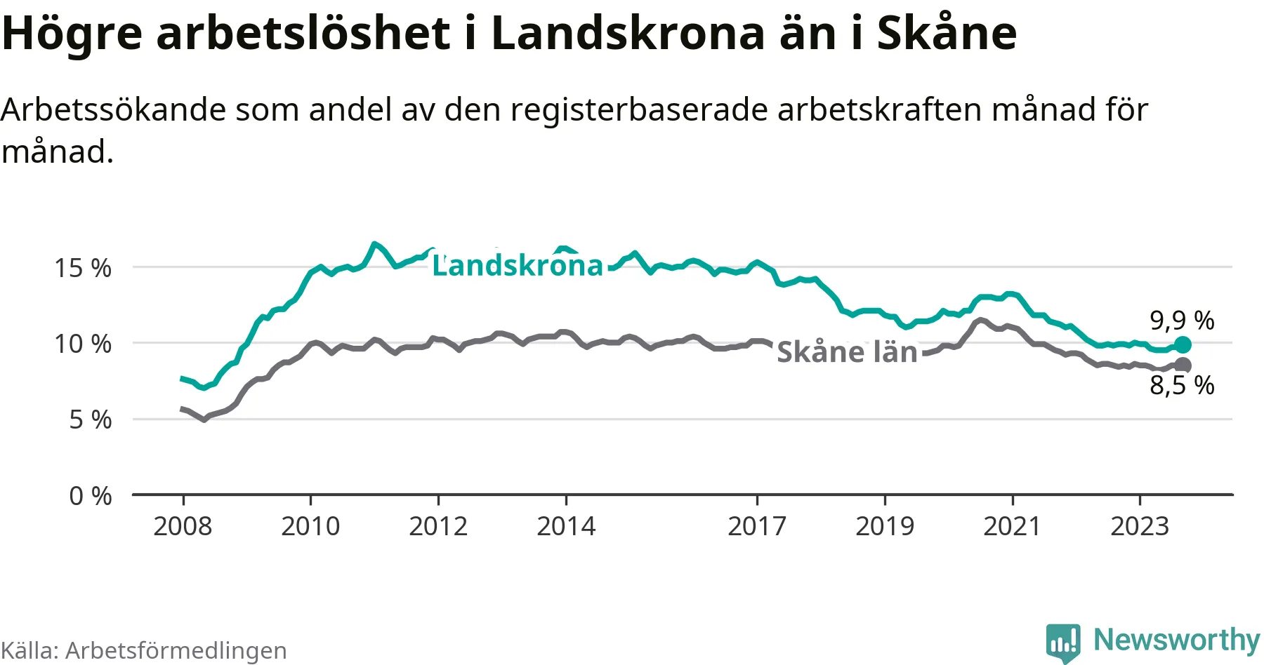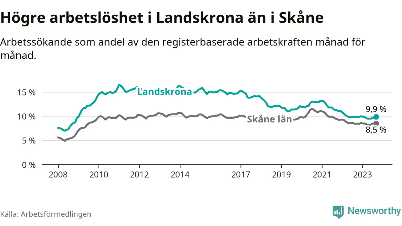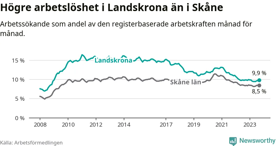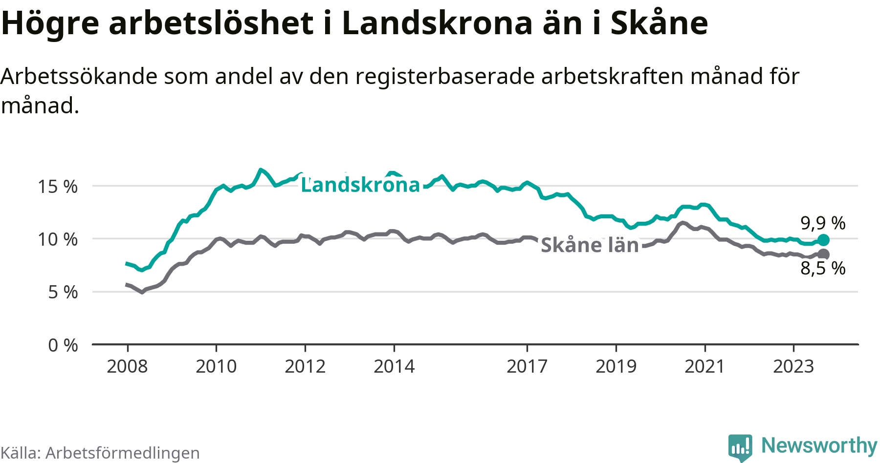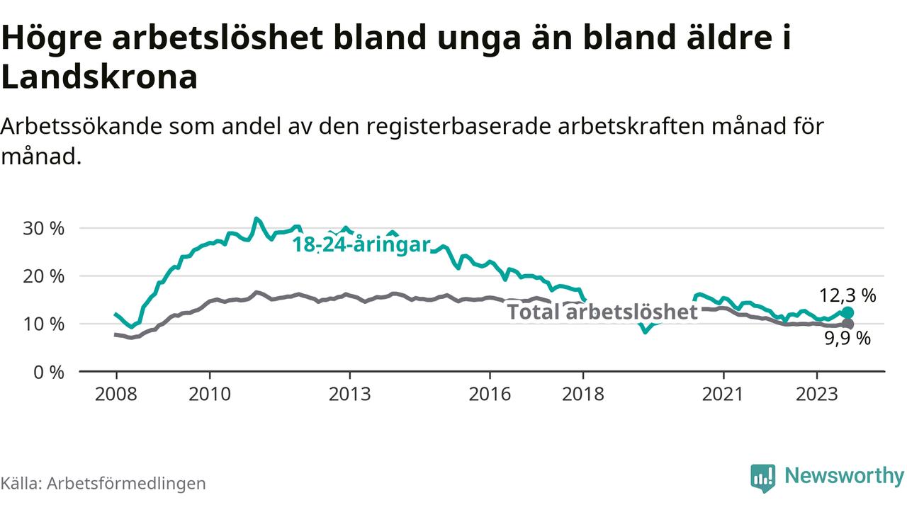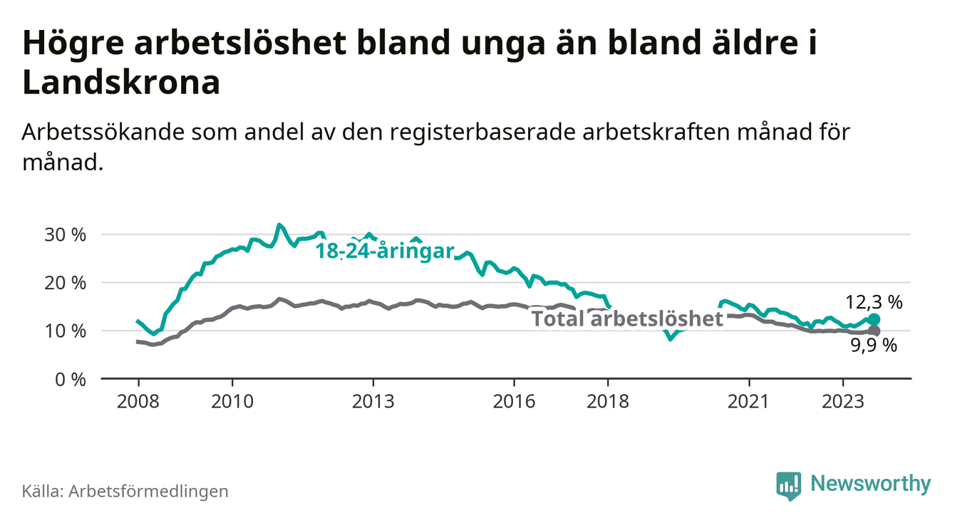 Precis som den totala arbetslösheten ligger ungdomsarbetslösheten i Landskrona högre än i Skåne som helhet. Skillnaden mellan kommunen och länet är 1,9 procentenheter.