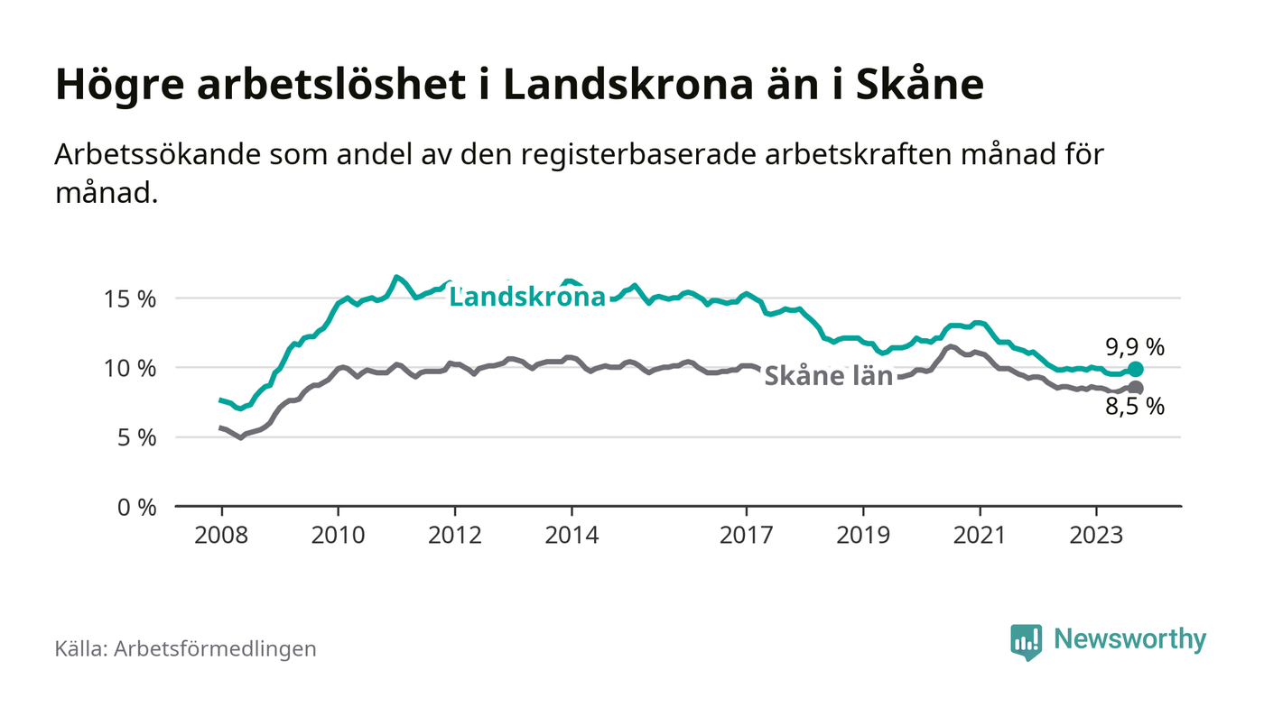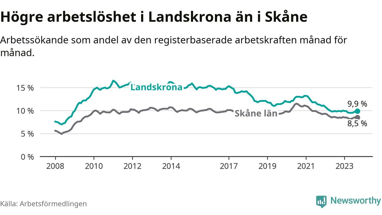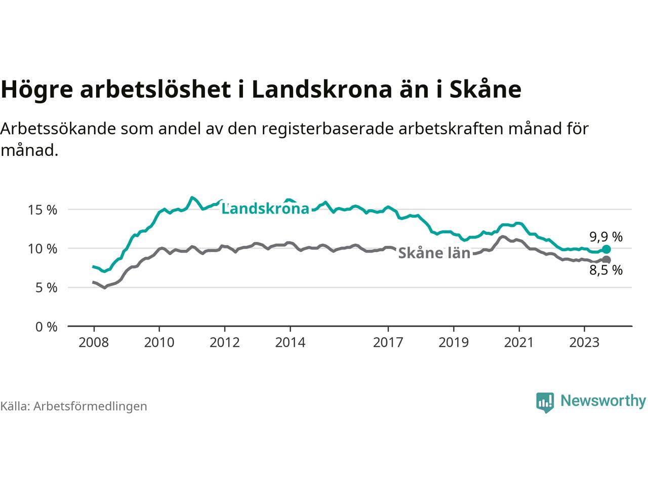 Arbetslösheten i Landskrona ligger över nivån i hela Skåne län (9,9 procent i kommunen, jämfört med 8,5 procent i hela länet). Vellinge har den lägsta arbetslösheten i länet (3,3 procent), medan Malmö har den högsta (12,2 procent). För att Landskrona skulle komma ner i samma arbetslöshetsnivå som Vellinge skulle 1 461 personer behöva sysselsättas.