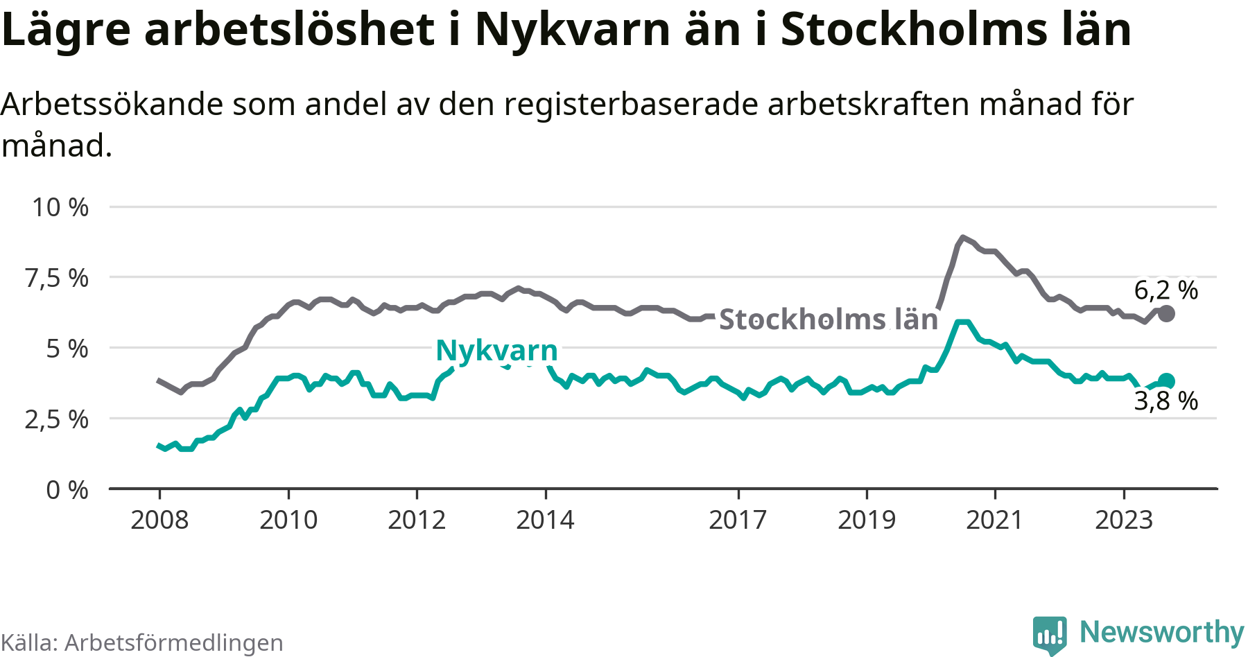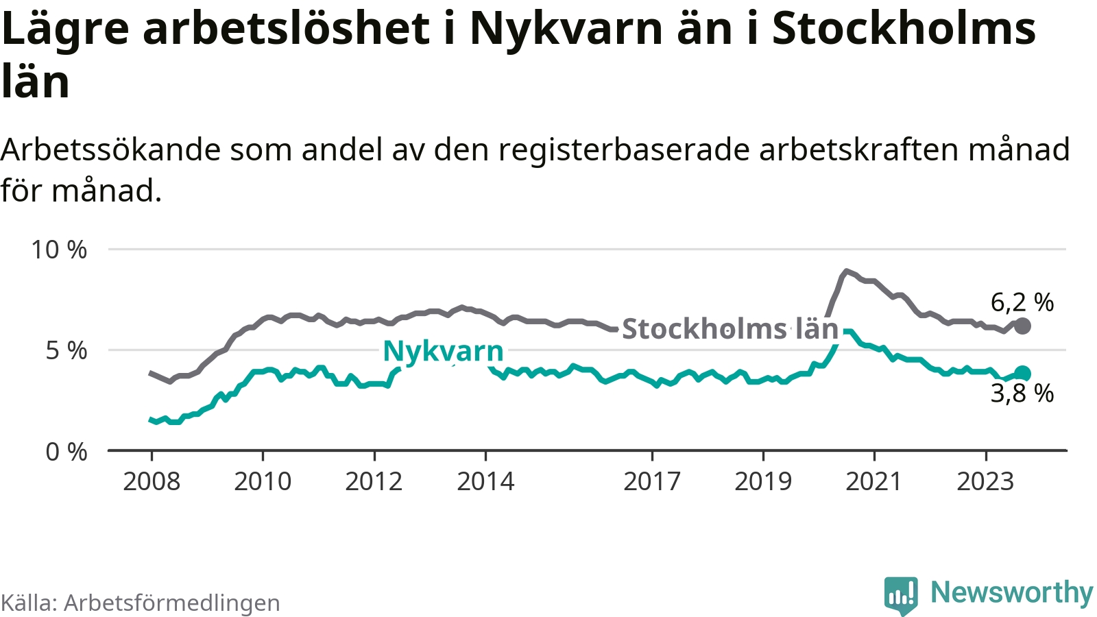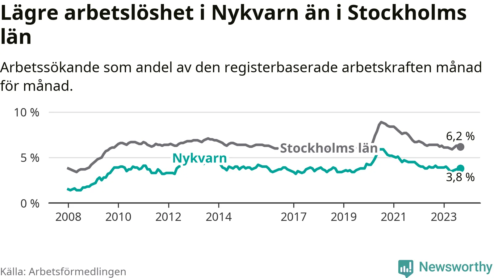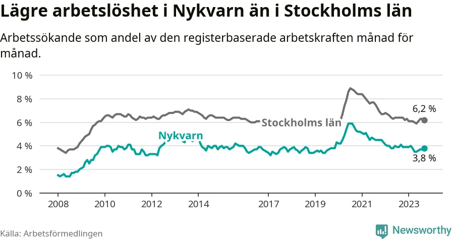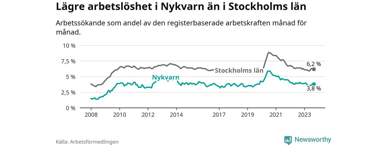 Nykvarn hade redan tidigare lägre arbetslöshet än snittet i hela Stockholms län och nu växer klyftan (3,8 procent i kommunen, jämfört med 6,2 procent i hela länet). Vaxholm har den lägsta arbetslösheten i länet (3,1 procent), medan Botkyrka har den högsta (10,5 procent). För att Nykvarn skulle komma ner i samma arbetslöshetsnivå som Vaxholm skulle 41 personer behöva sysselsättas.