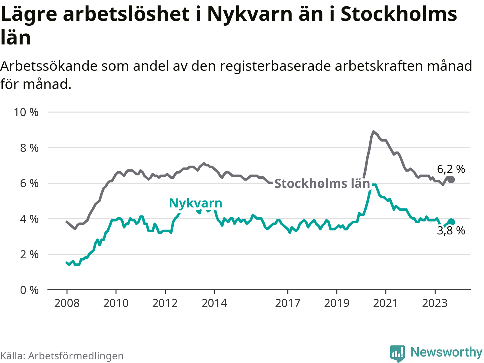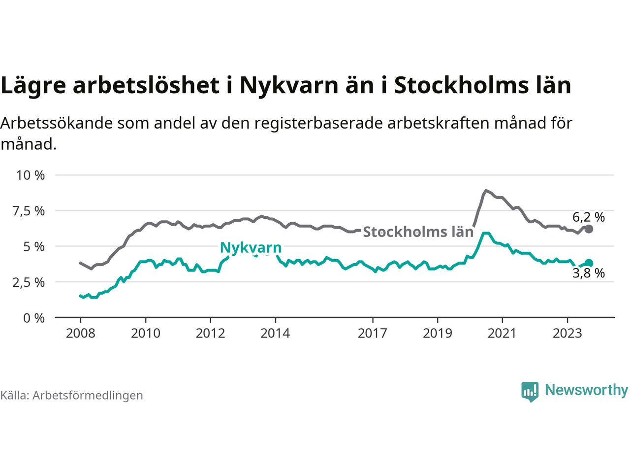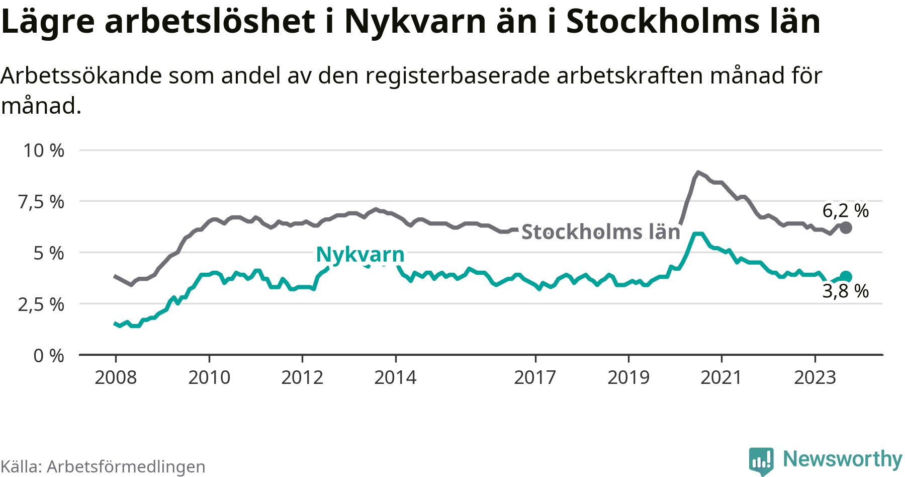 Nykvarn hade redan tidigare lägre arbetslöshet än snittet i hela Stockholms län och nu växer klyftan (3,8 procent i kommunen, jämfört med 6,2 procent i hela länet). Vaxholm har den lägsta arbetslösheten i länet (3,1 procent), medan Botkyrka har den högsta (10,5 procent). För att Nykvarn skulle komma ner i samma arbetslöshetsnivå som Vaxholm skulle 41 personer behöva sysselsättas.