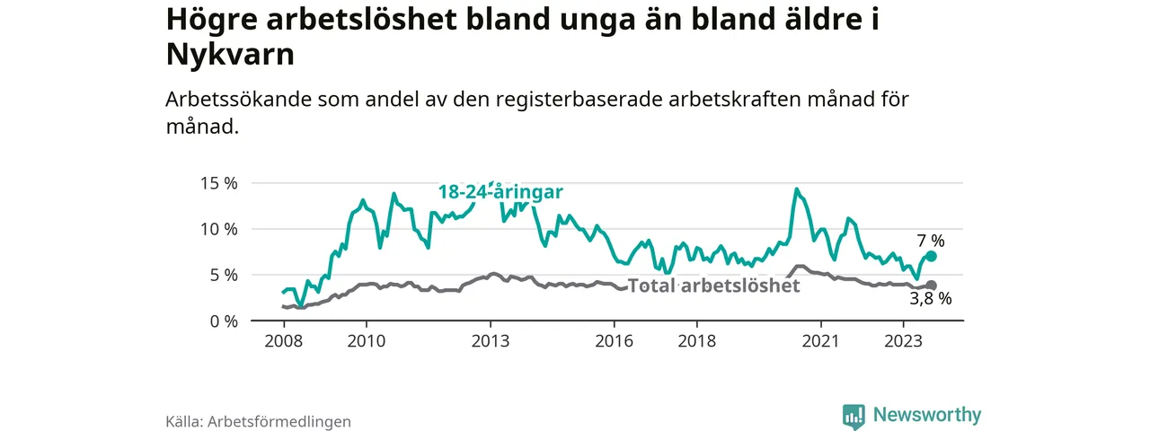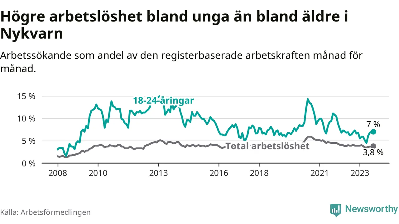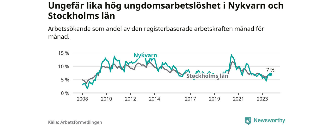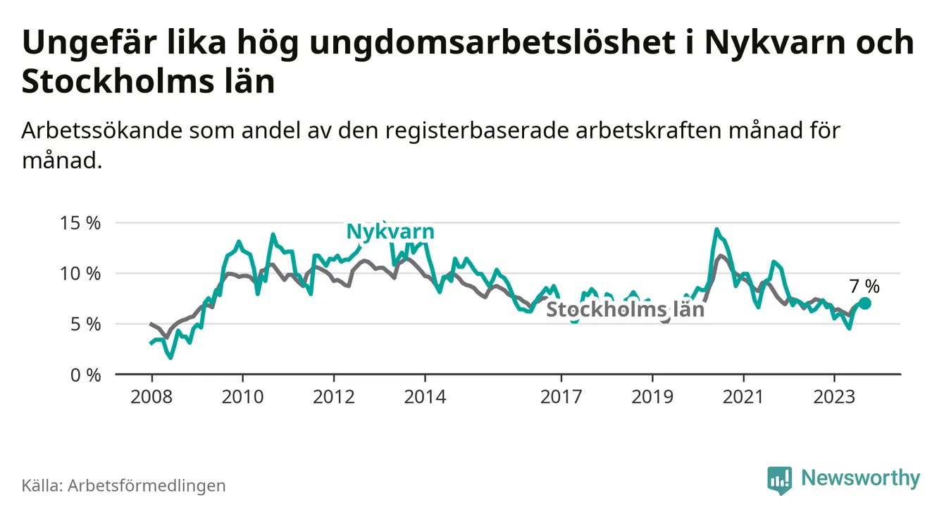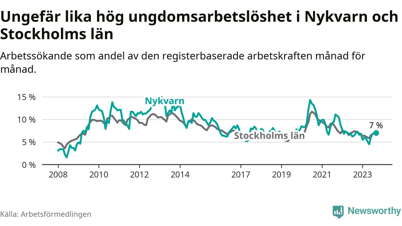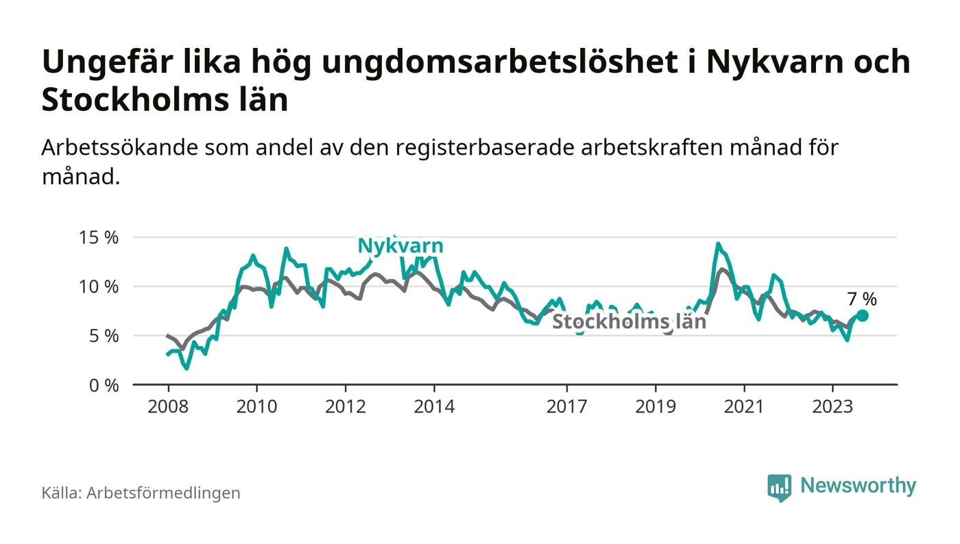 Medan Nykvarn har lägre total arbetslöshet än Stockholms län, ligger ungdomsarbetslösheten på i stort sett samma nivå.
