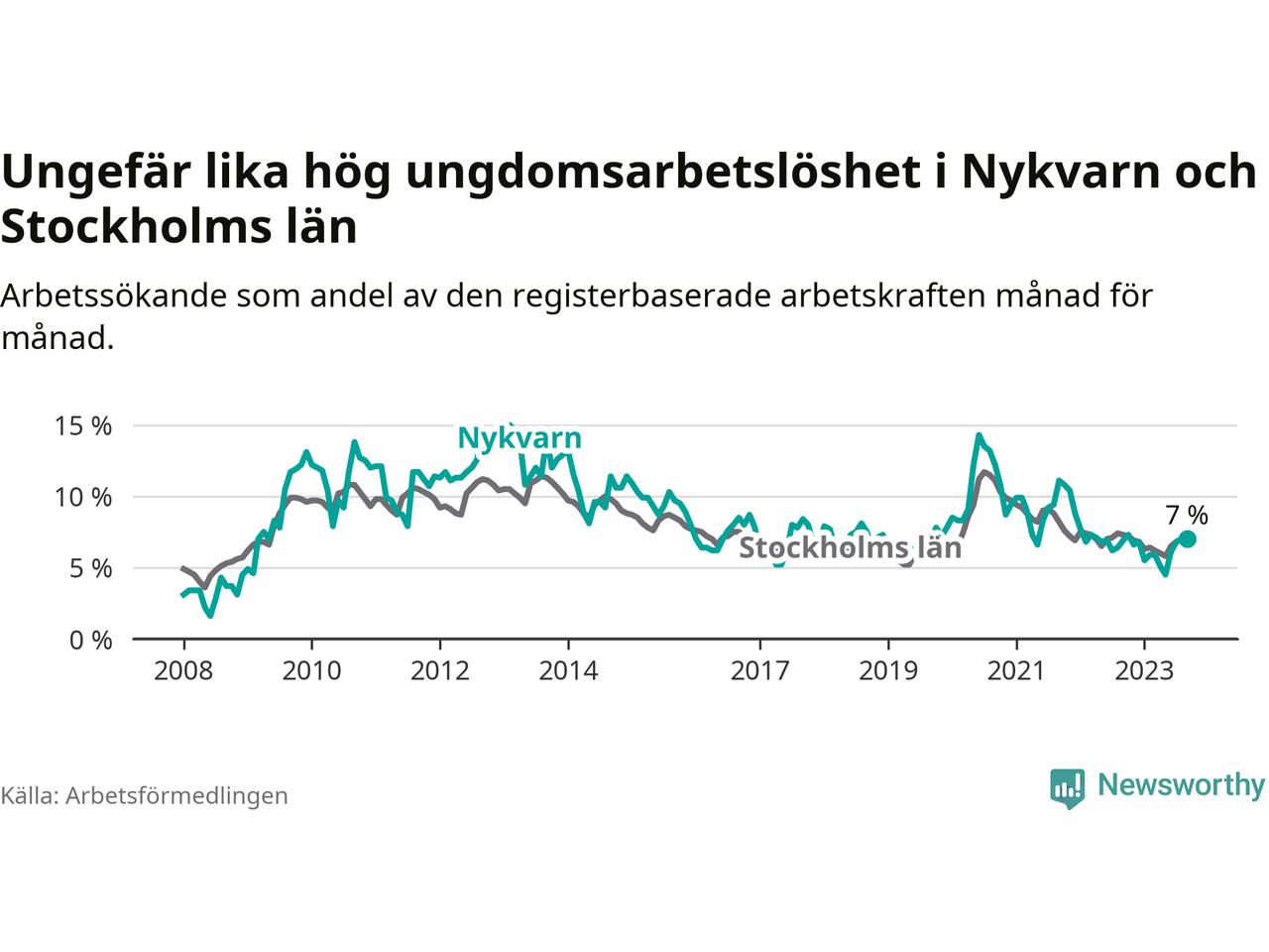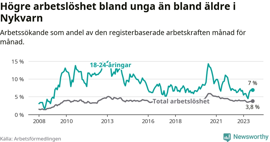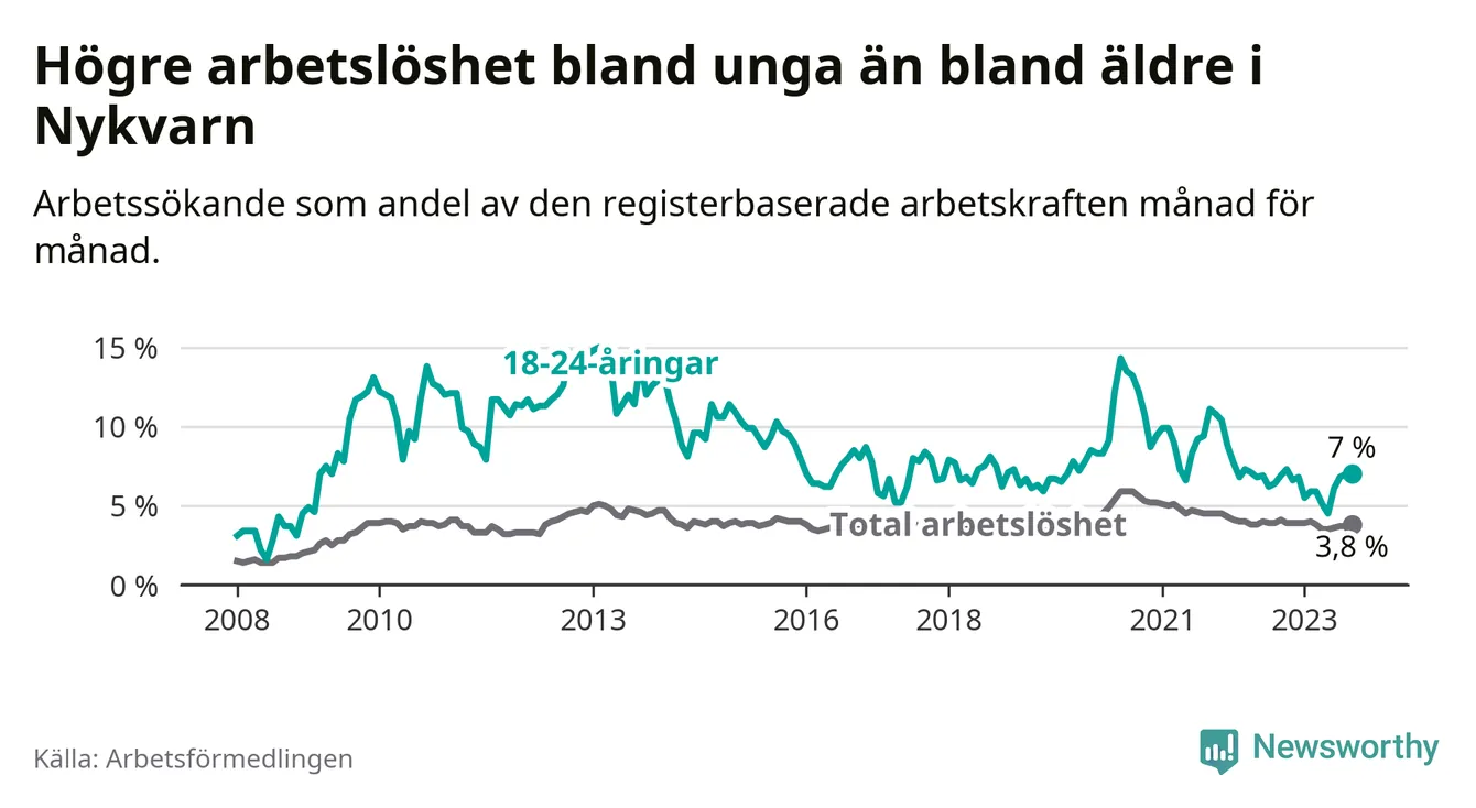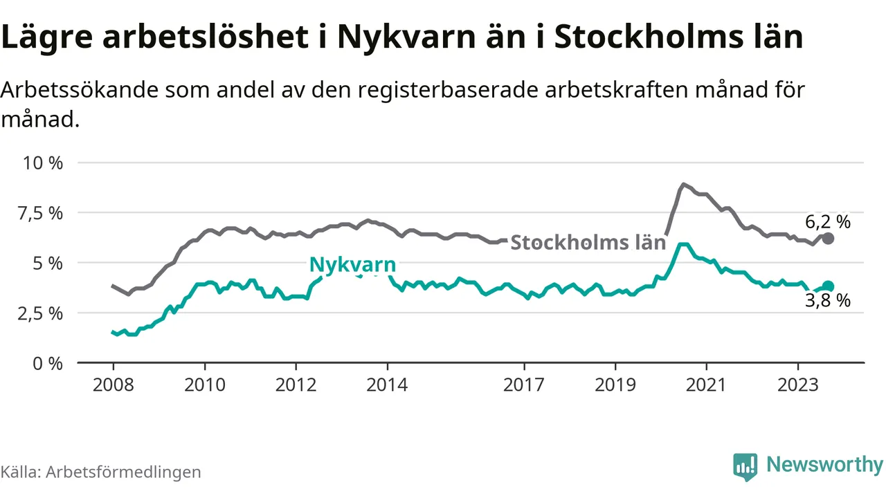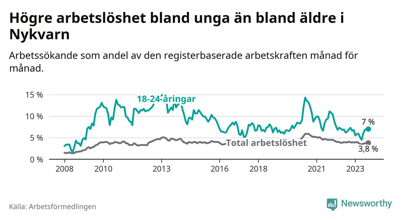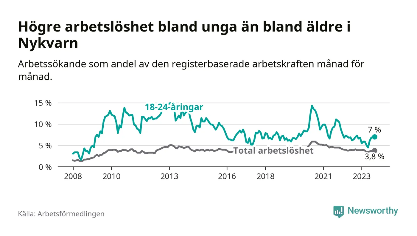 Medan Nykvarn har lägre total arbetslöshet än Stockholms län, ligger ungdomsarbetslösheten på i stort sett samma nivå.
