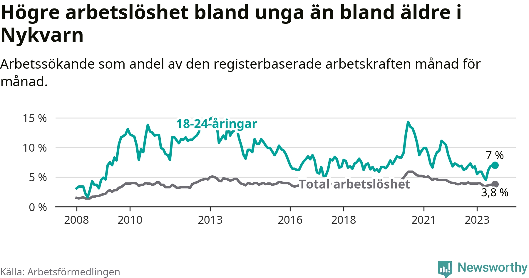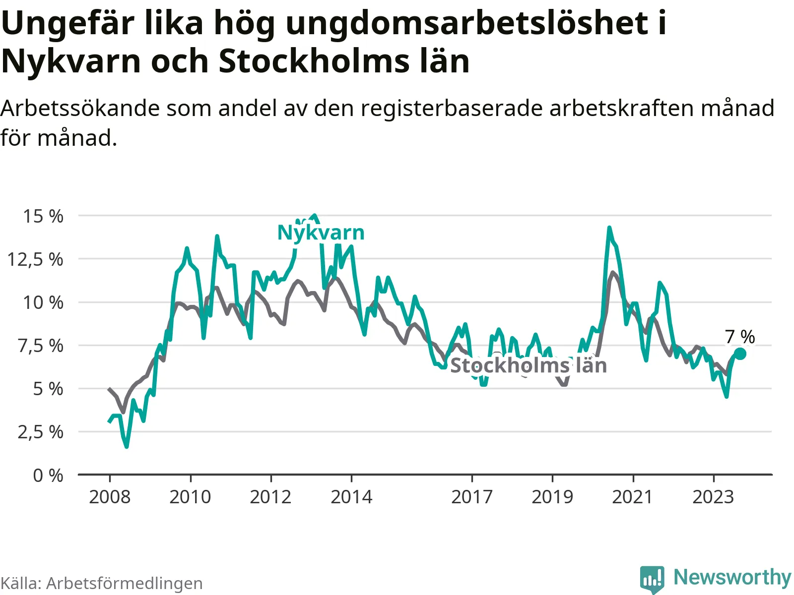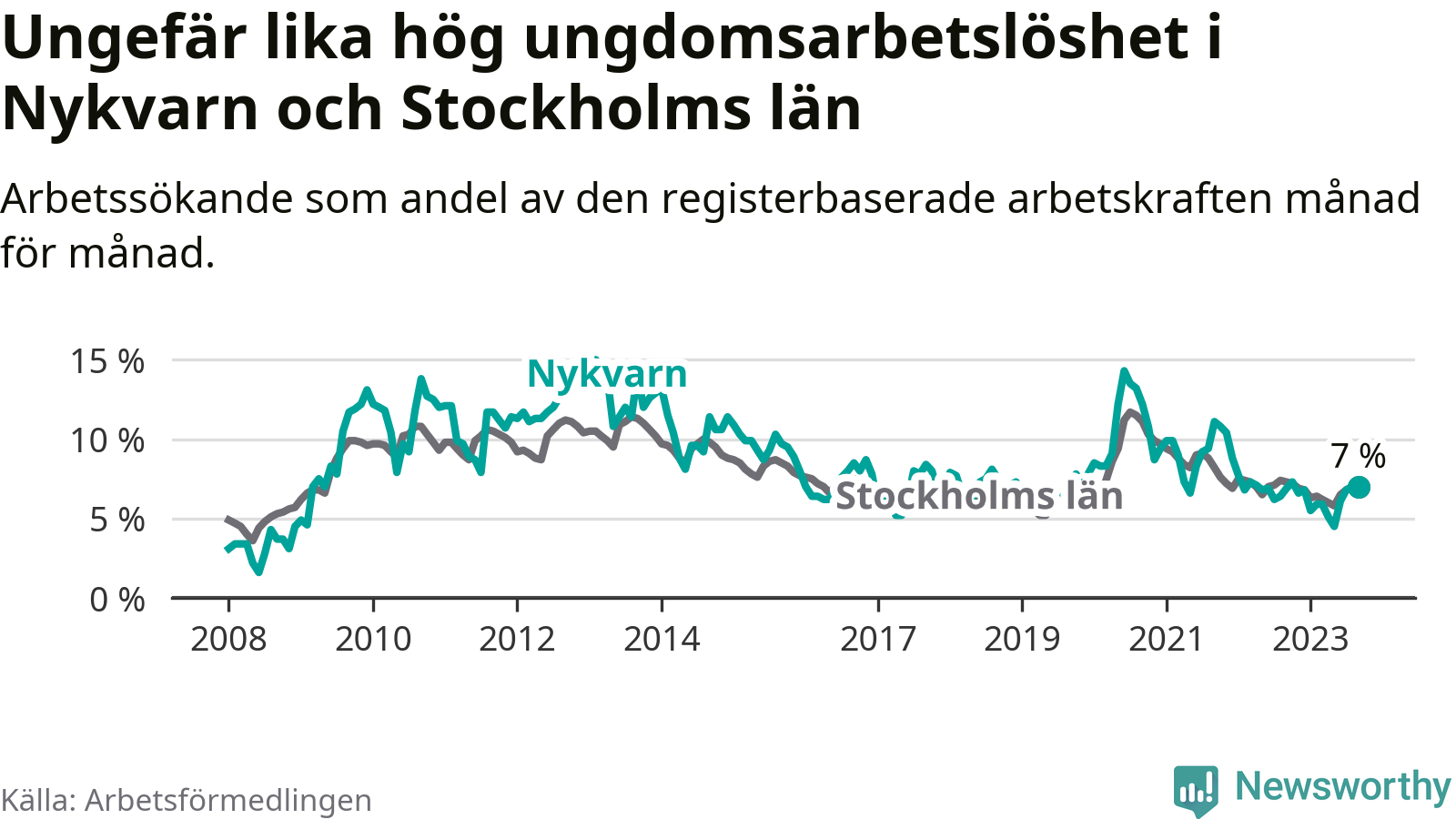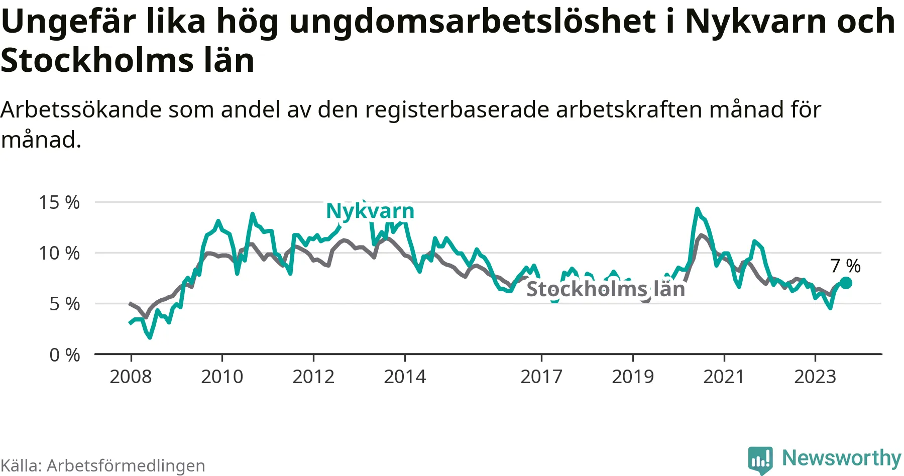 Medan Nykvarn har lägre total arbetslöshet än Stockholms län, ligger ungdomsarbetslösheten på i stort sett samma nivå.