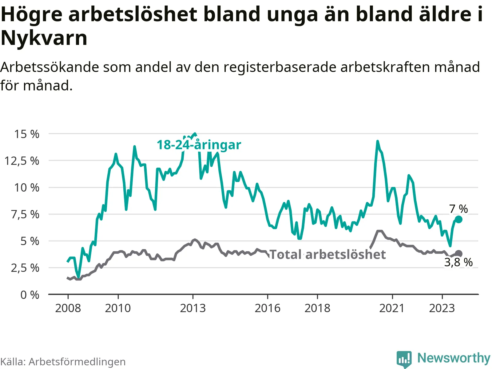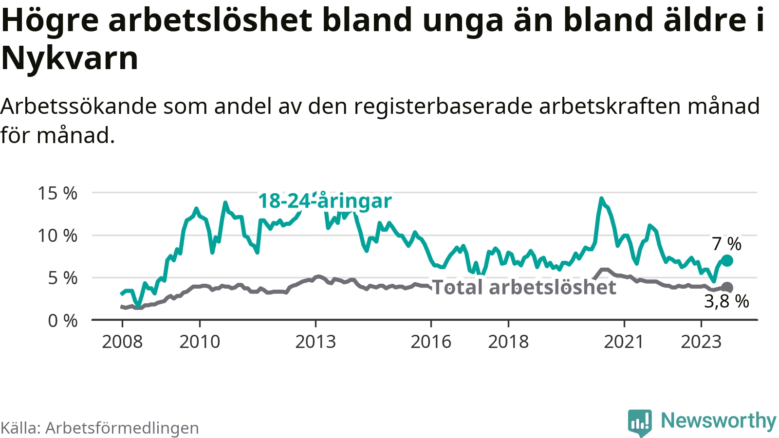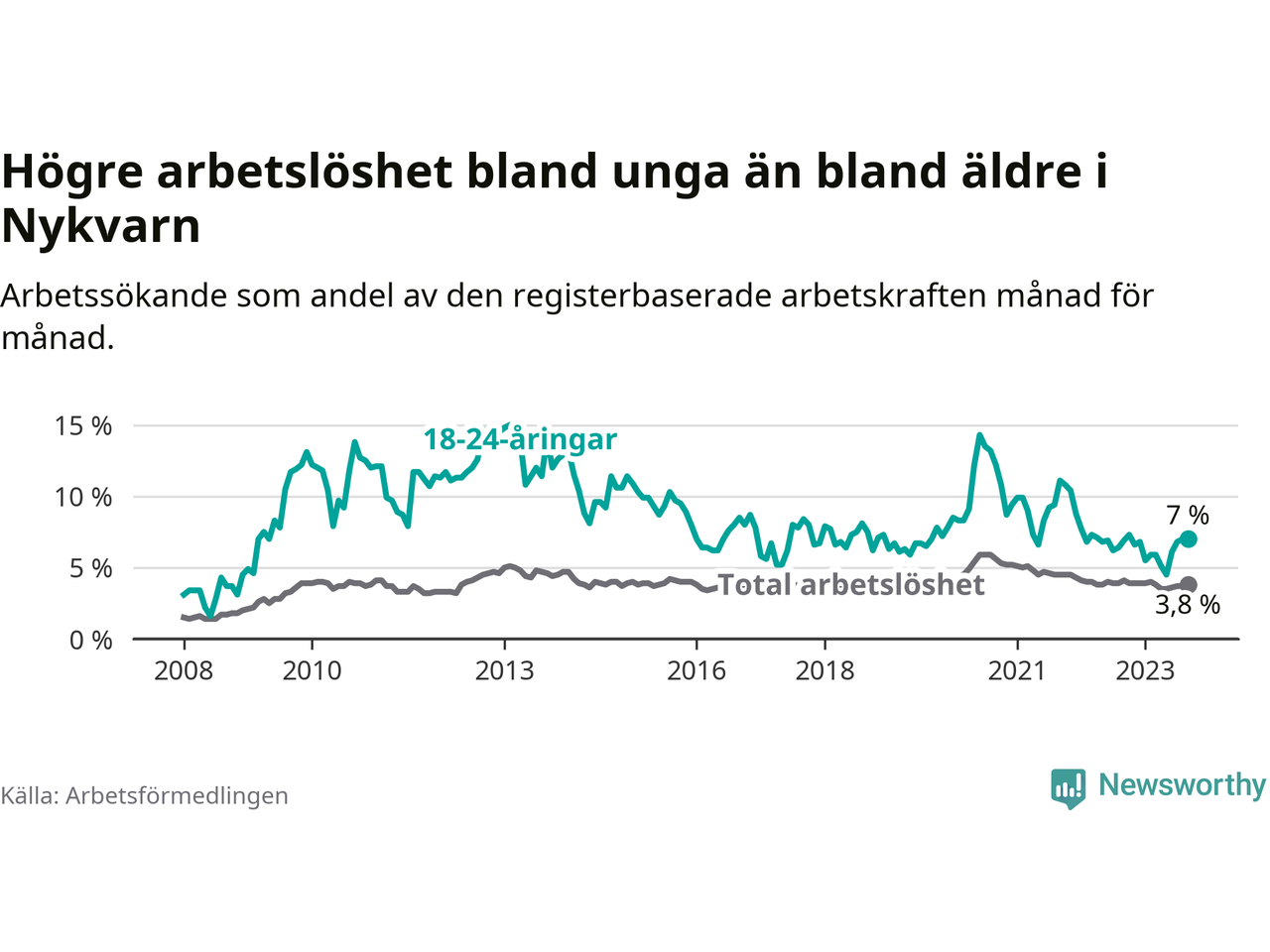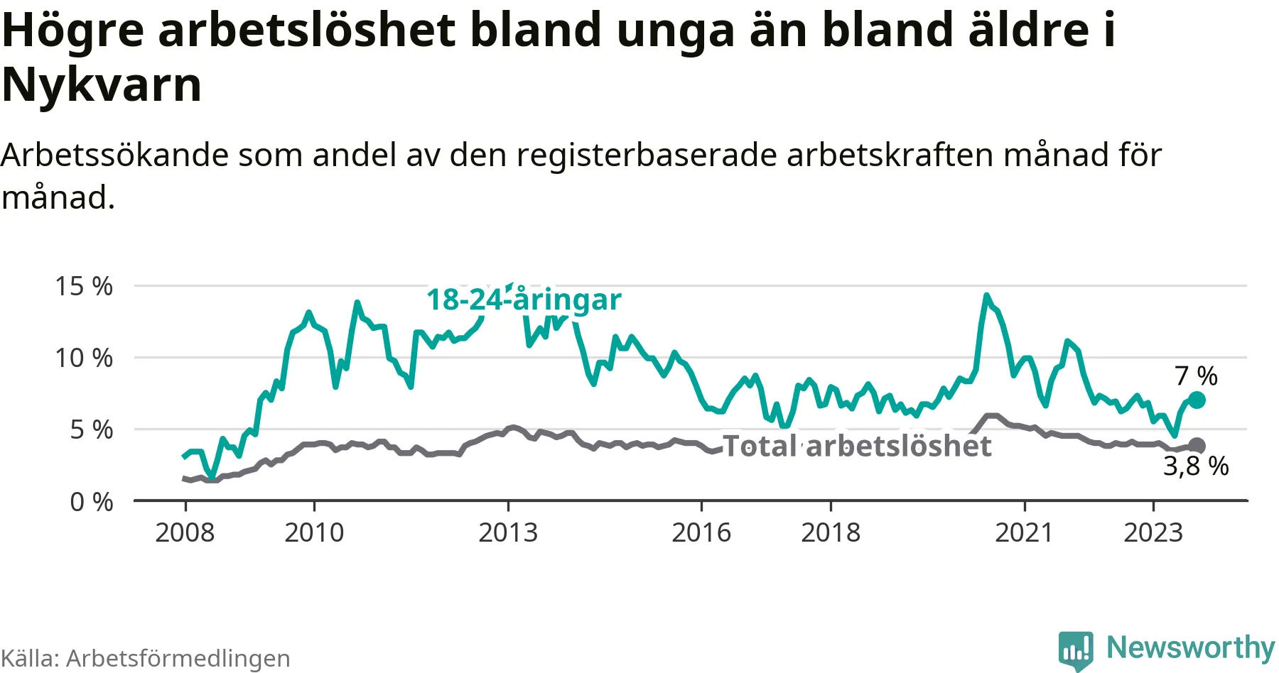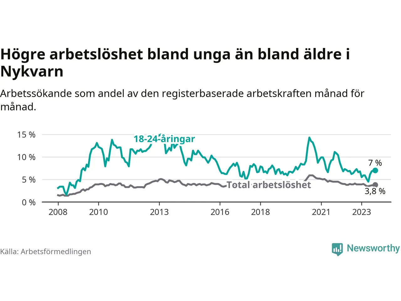 Medan Nykvarn har lägre total arbetslöshet än Stockholms län, ligger ungdomsarbetslösheten på i stort sett samma nivå.