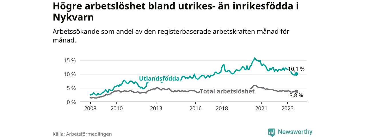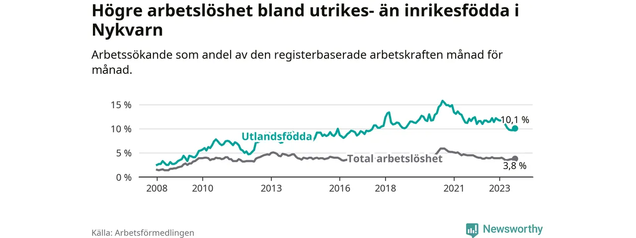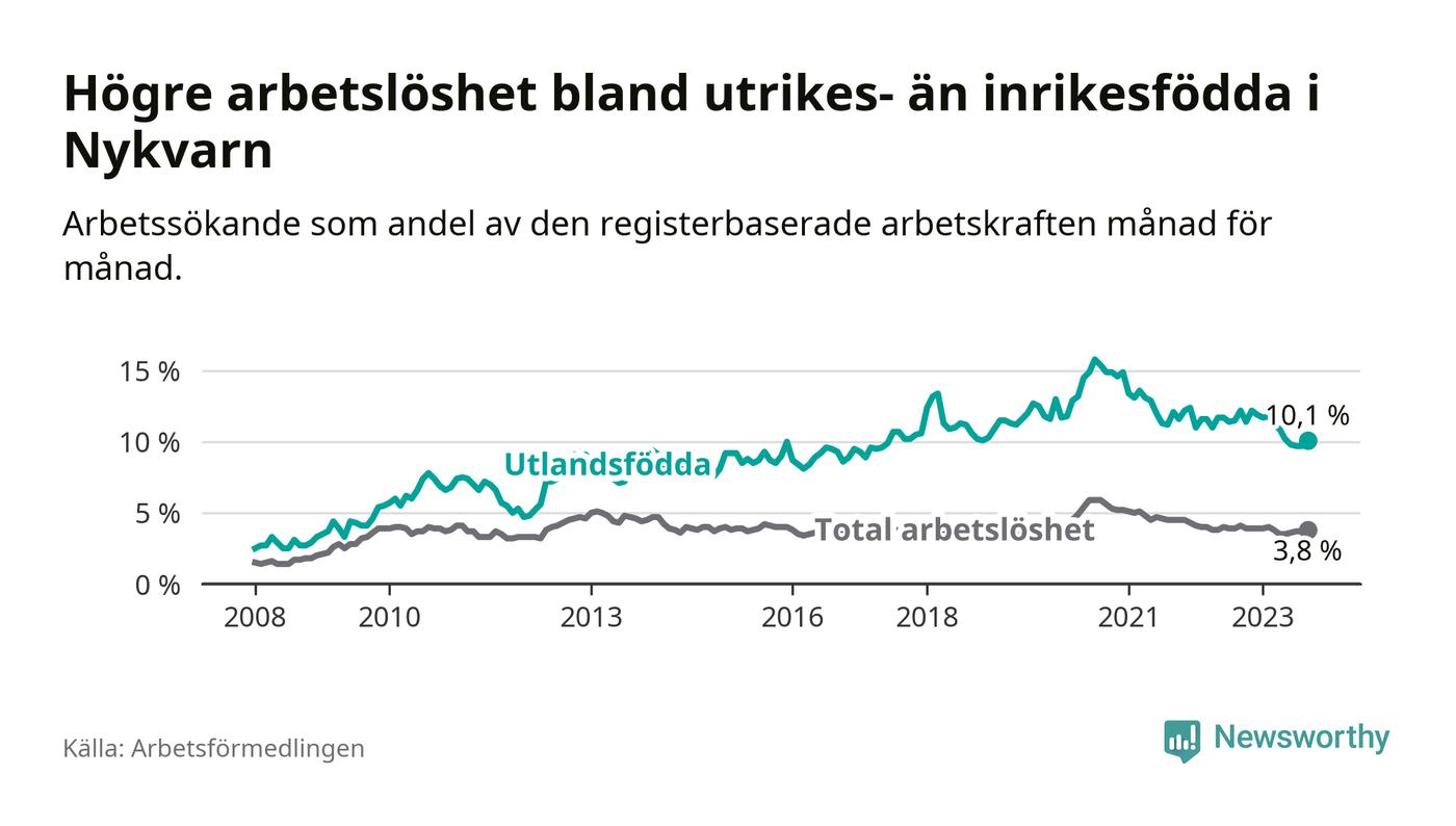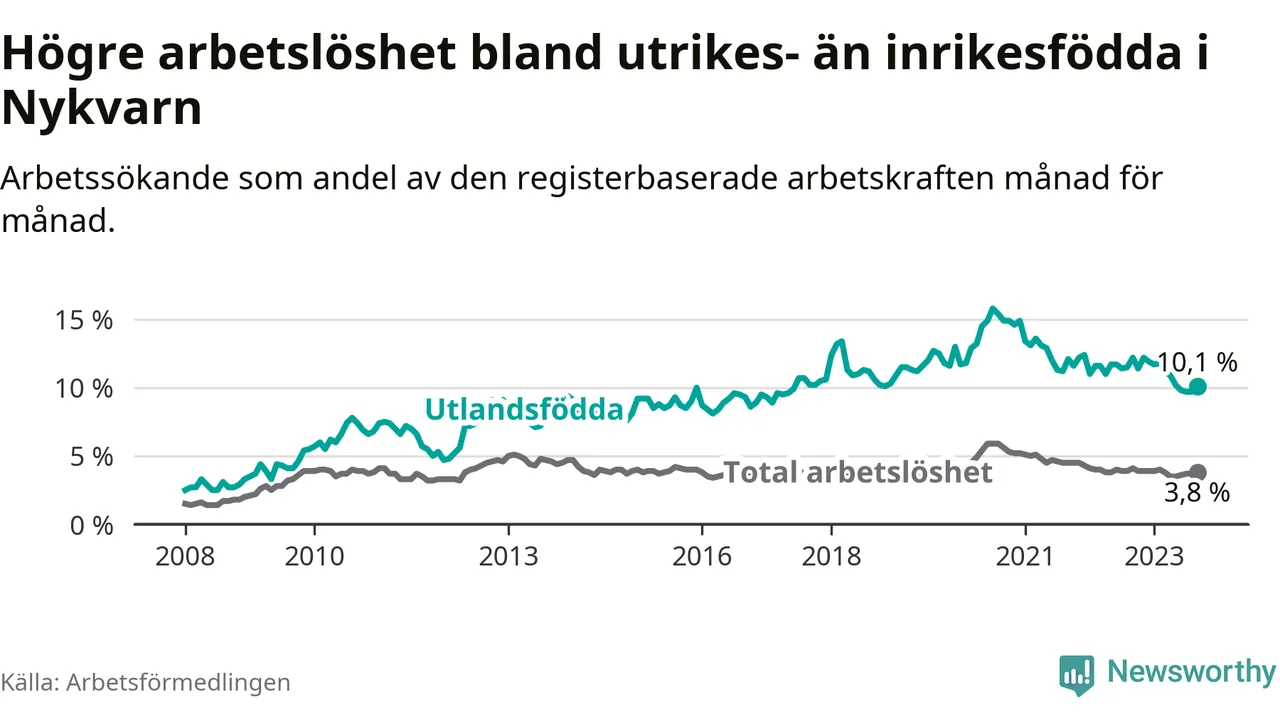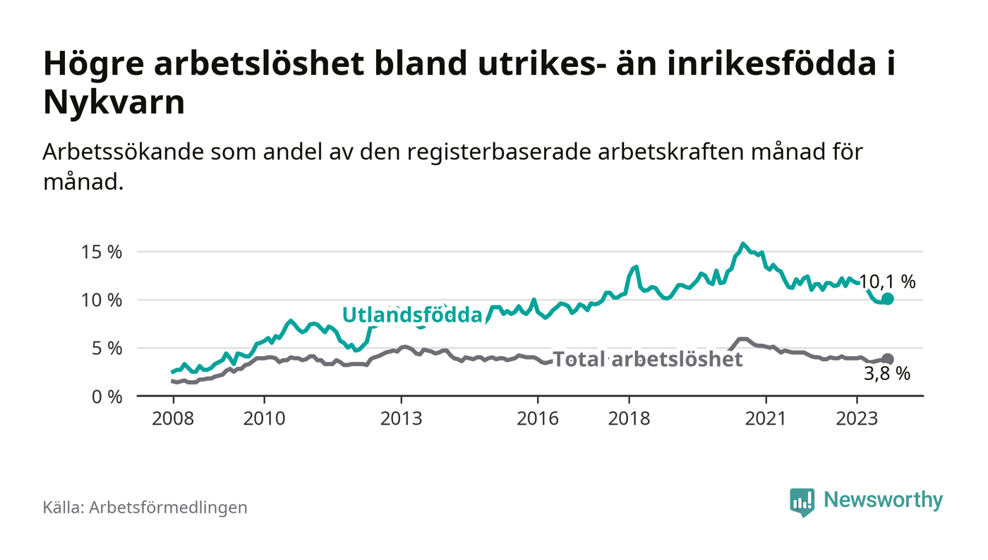 Skillnaden i arbetslöshet mellan utrikesfödda och hela befolkningen är 6,3 procentenheter i Nykvarn. Det är en betydligt mindre skillnad än för ett år sedan (−1,8 procentenheter).