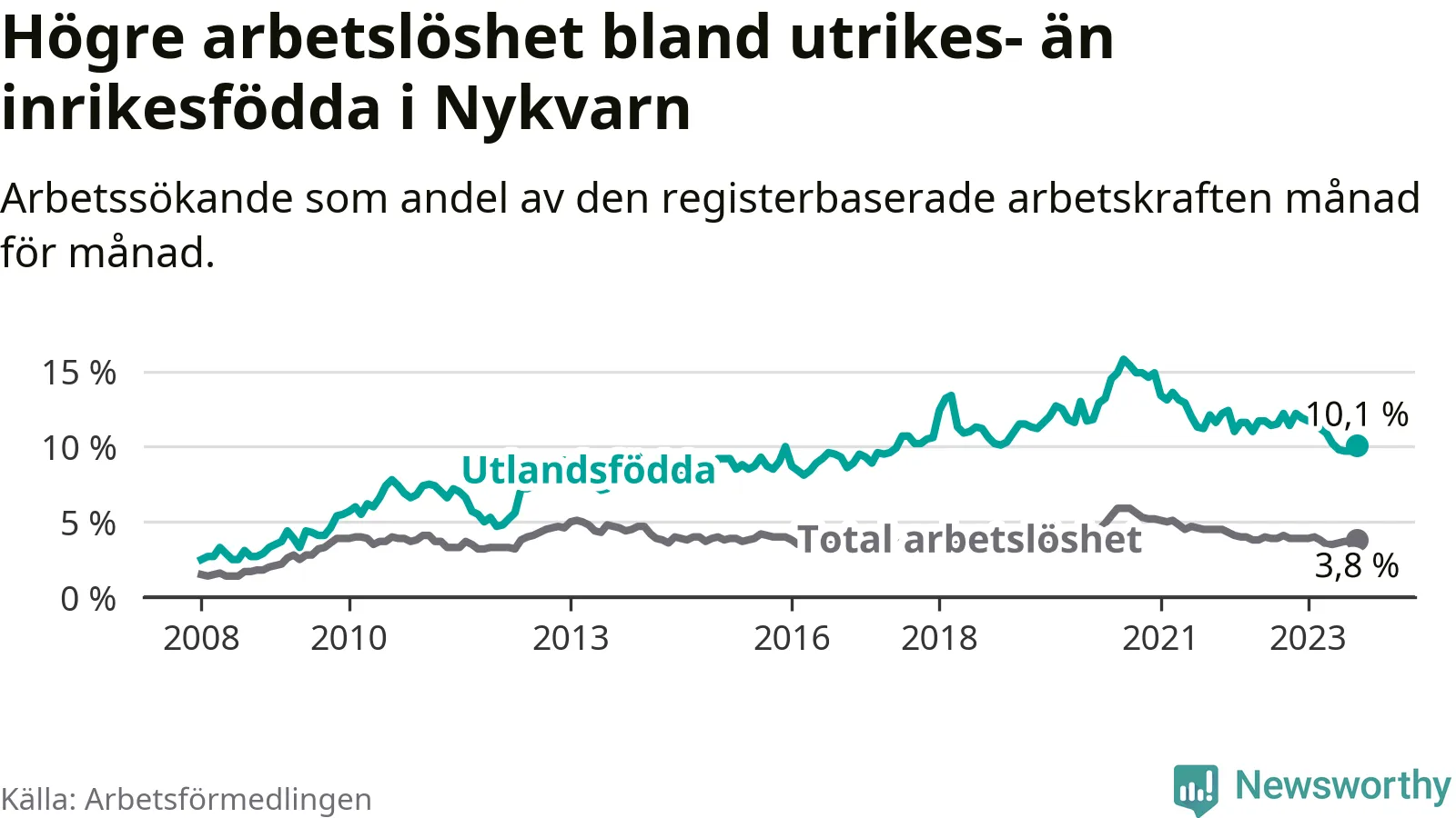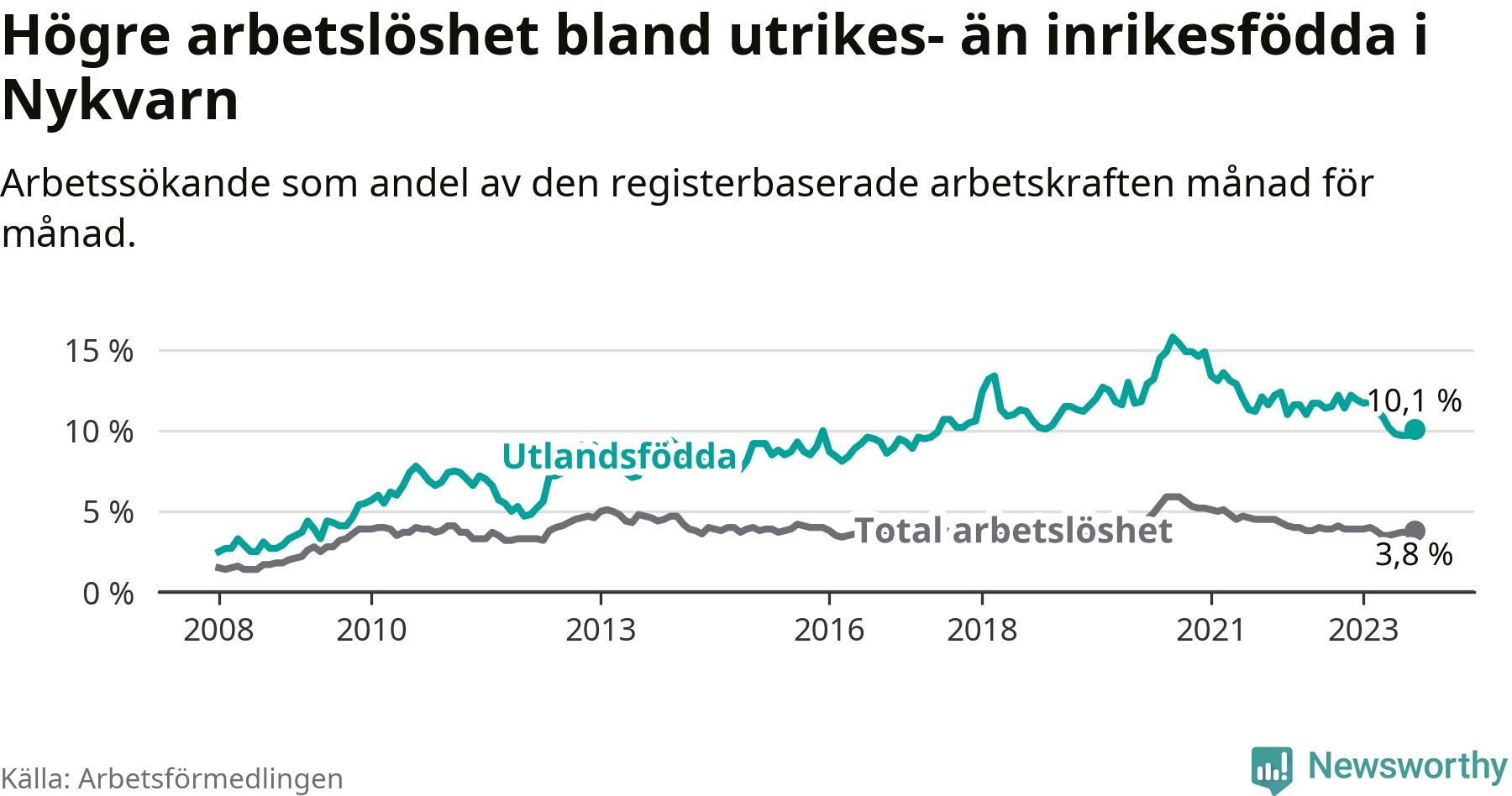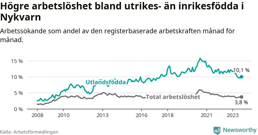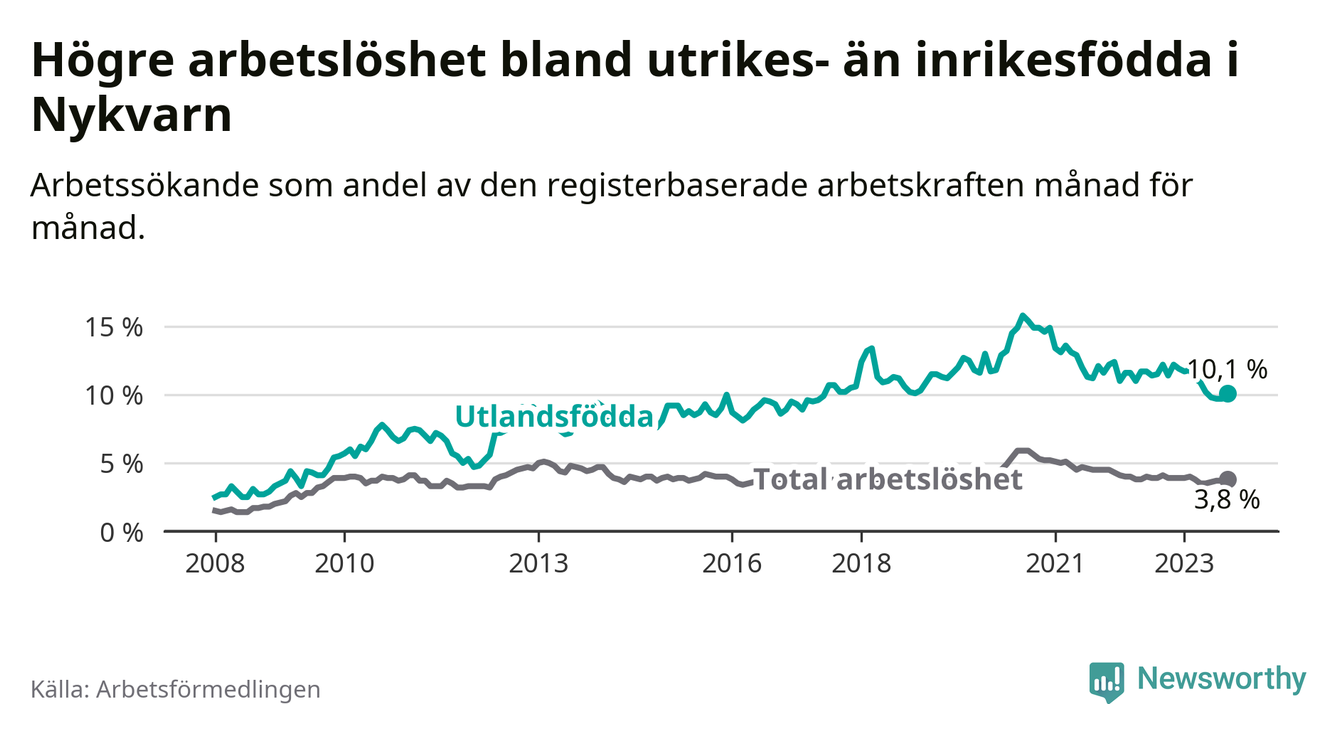 Skillnaden i arbetslöshet mellan utrikesfödda och hela befolkningen är 6,3 procentenheter i Nykvarn. Det är en betydligt mindre skillnad än för ett år sedan (−1,8 procentenheter).