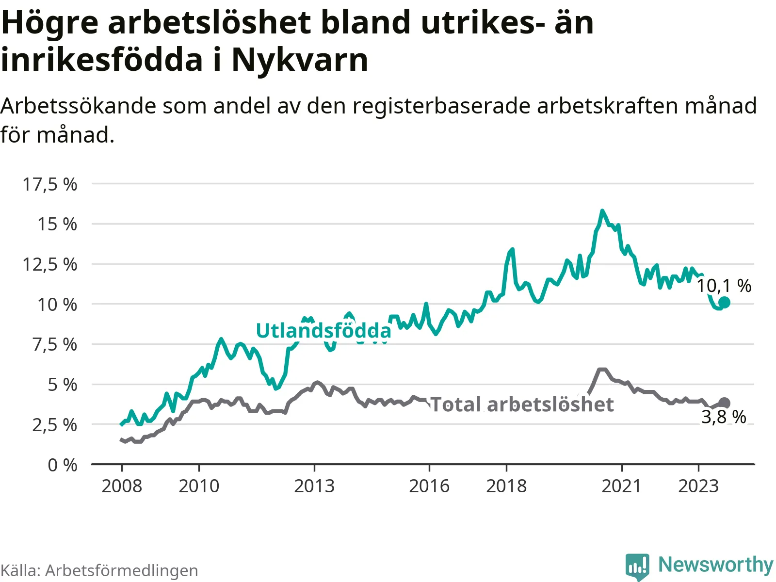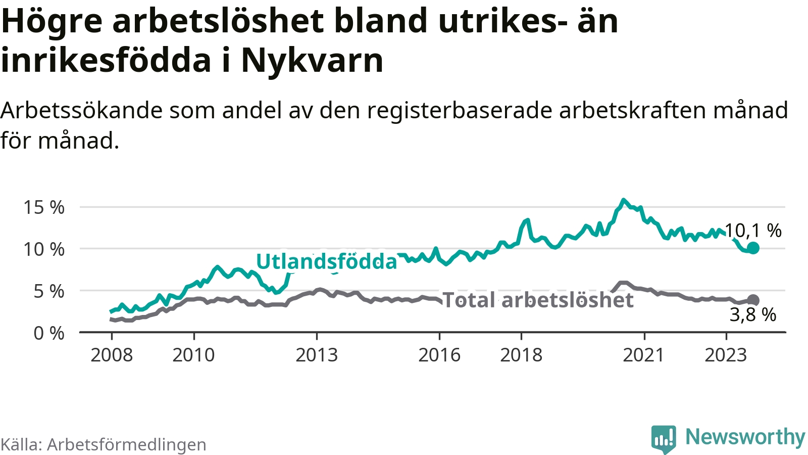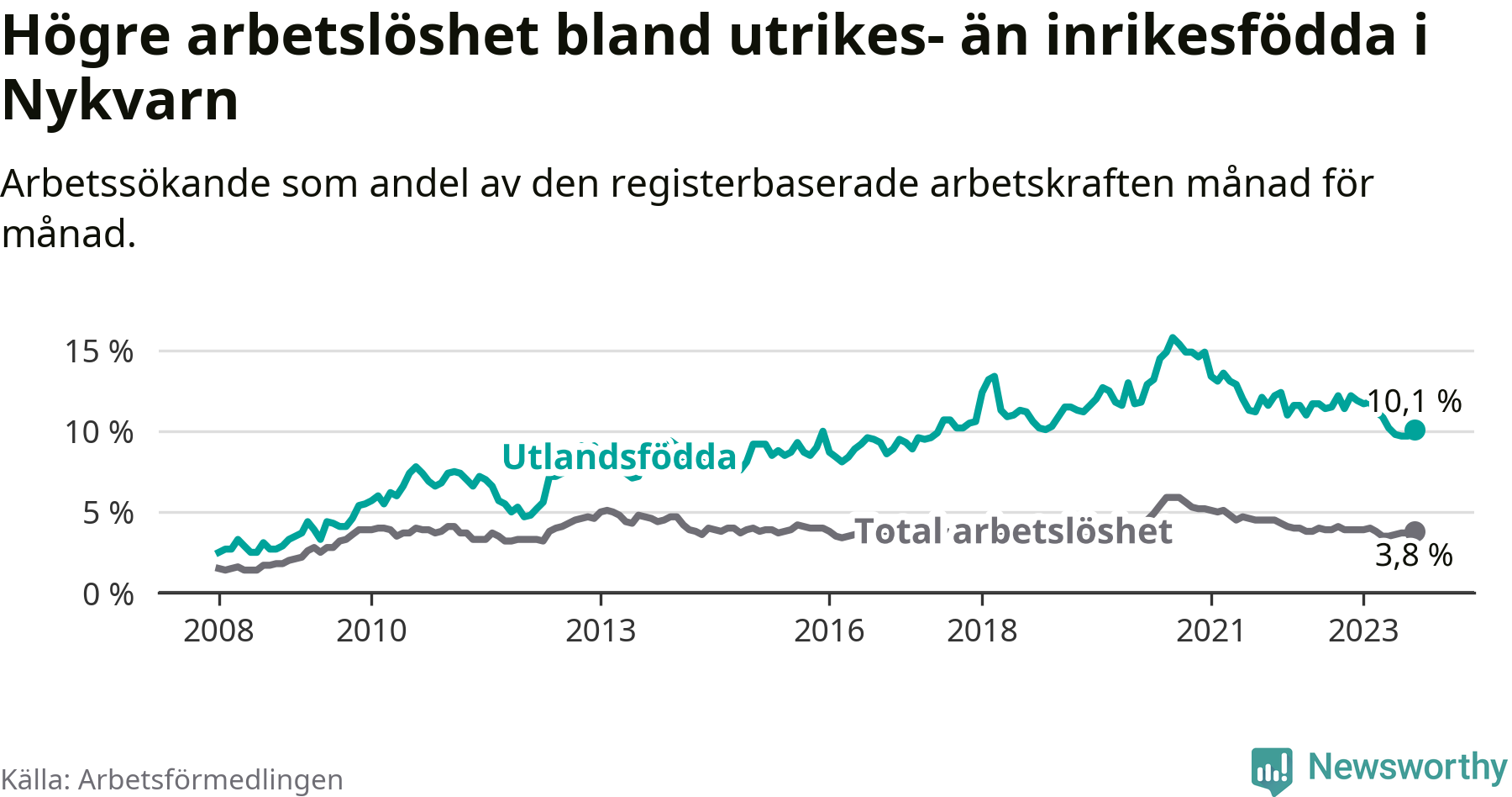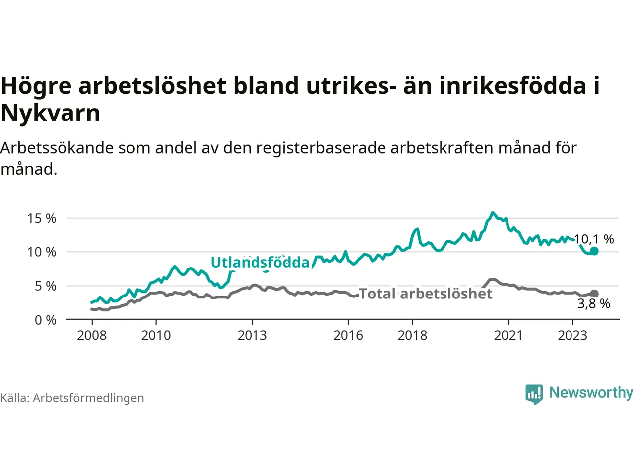 Skillnaden i arbetslöshet mellan utrikesfödda och hela befolkningen är 6,3 procentenheter i Nykvarn. Det är en betydligt mindre skillnad än för ett år sedan (−1,8 procentenheter).