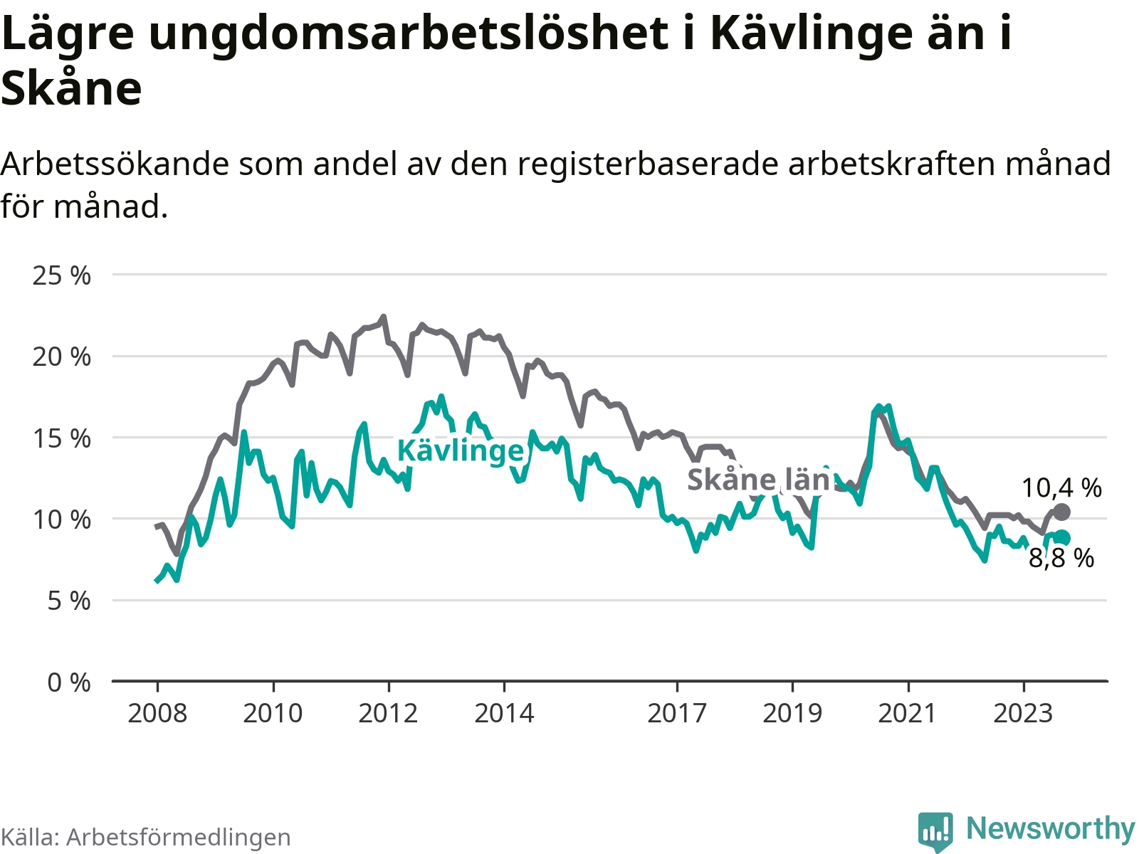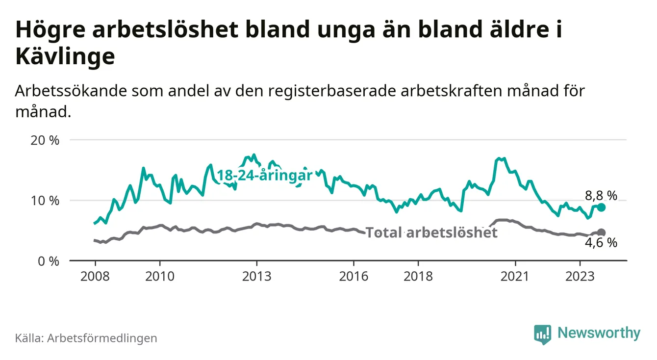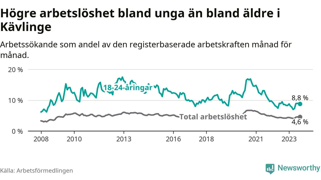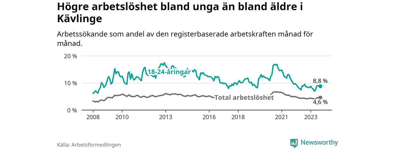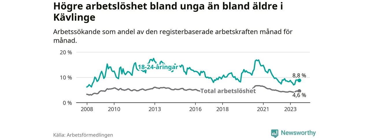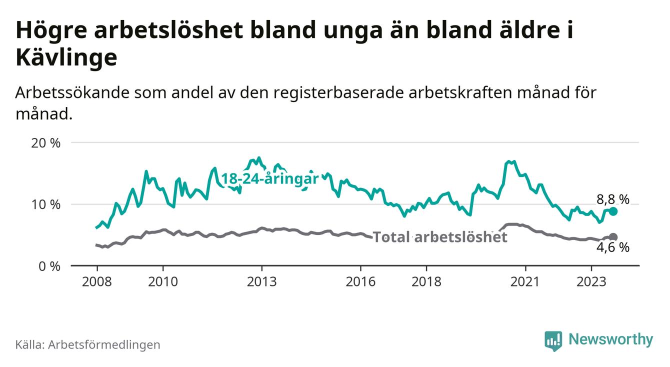 Graf: Arbetslöshet bland unga i Kävlinge kommun och Skåne län