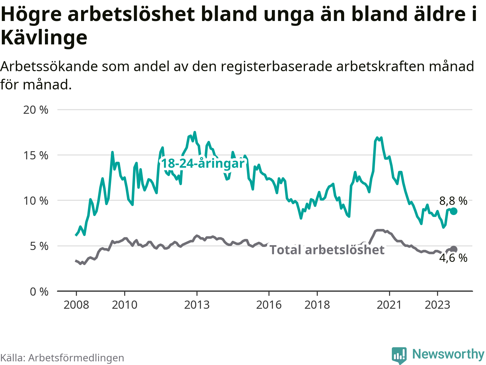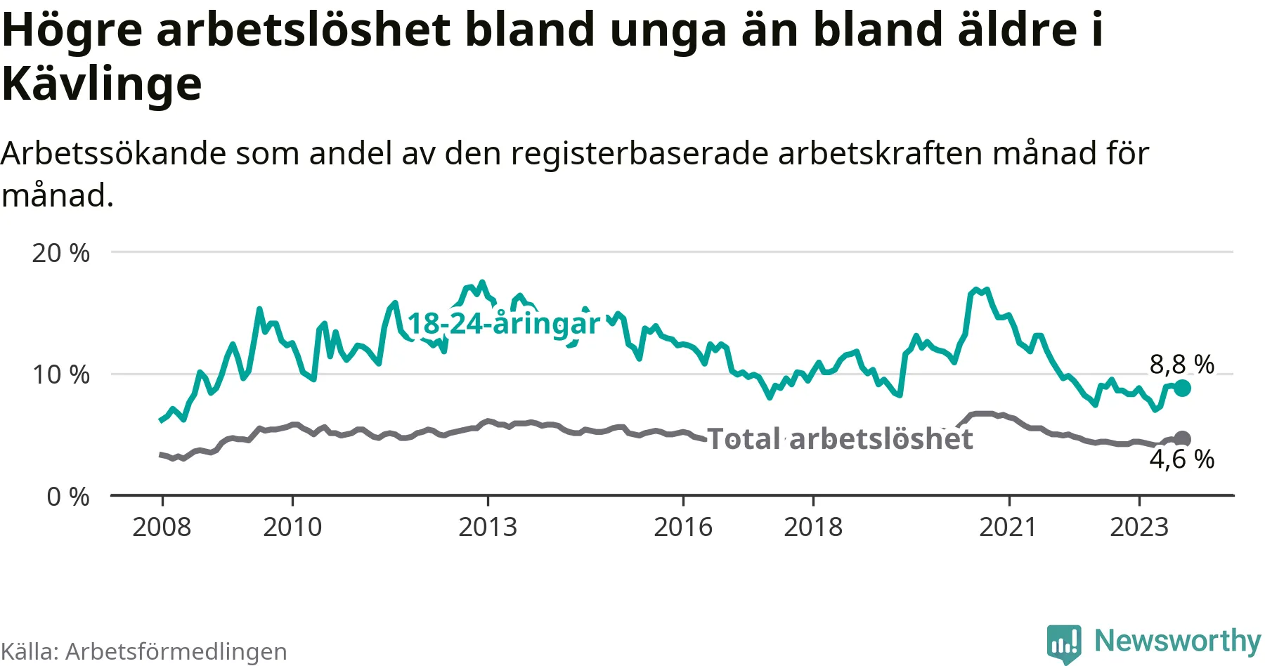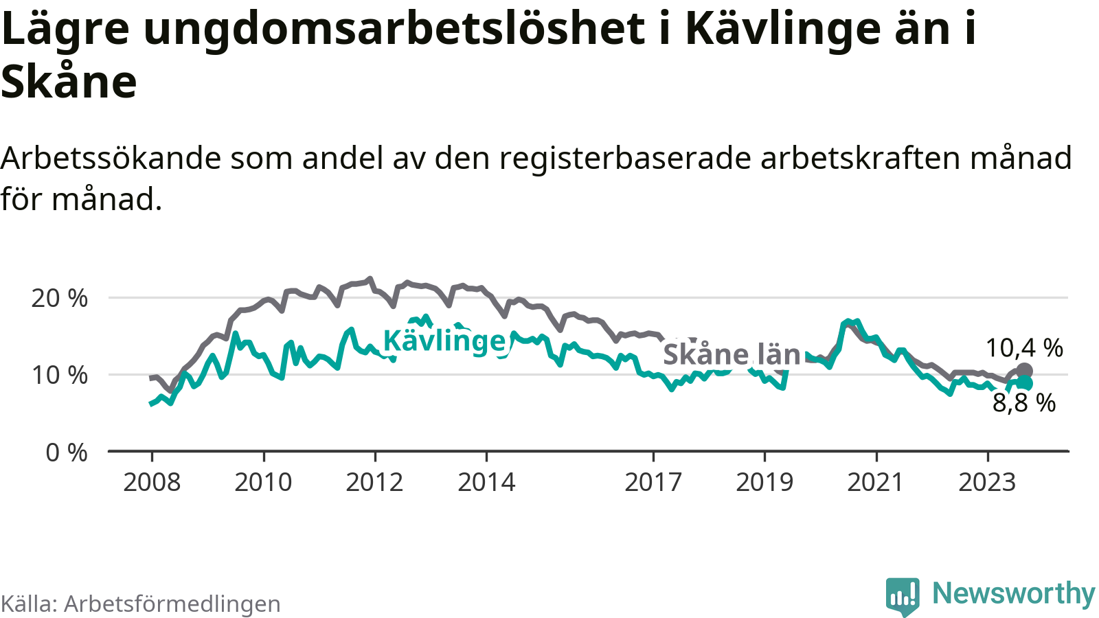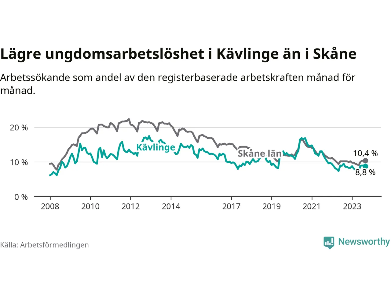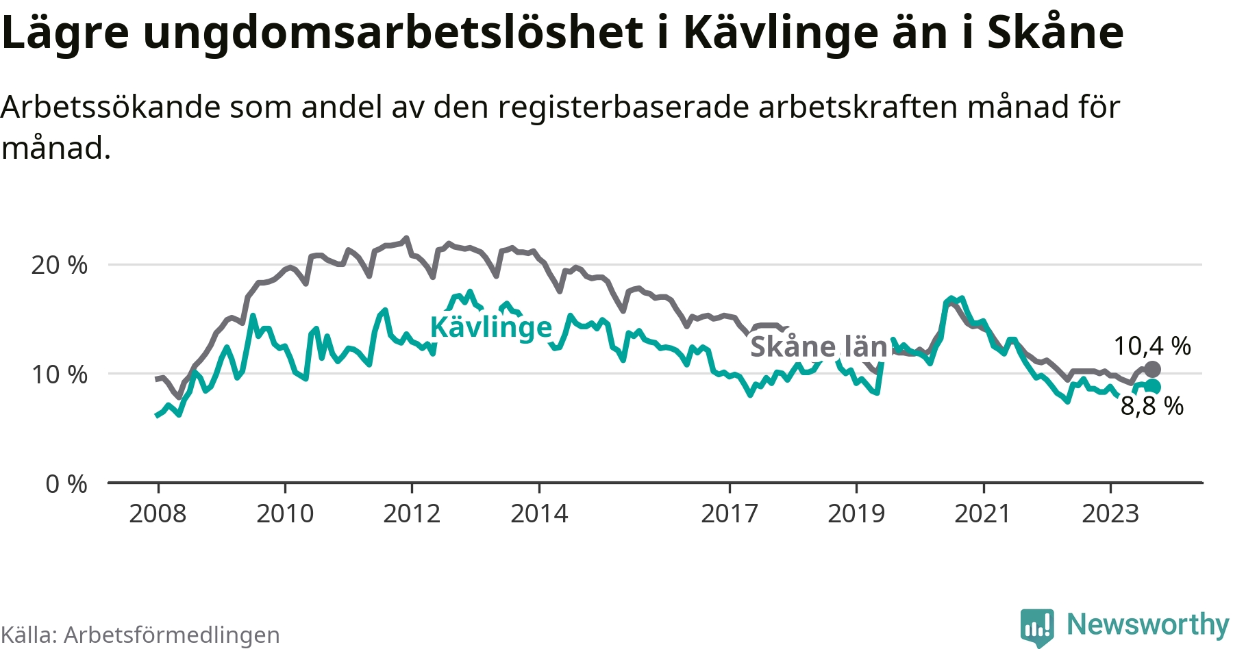 Graf: Arbetslöshet bland unga i Kävlinge kommun och Skåne län