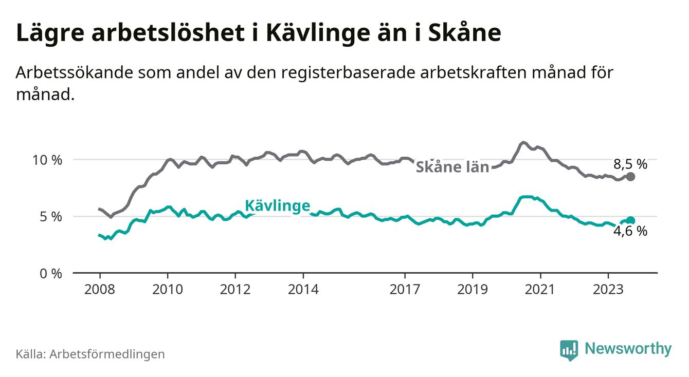 Även om arbetslösheten i Kävlinge alltså ökar, så ligger den fortfarande under snittet i hela Skåne län (4,6 procent i kommunen, jämfört med 8,5 procent i hela länet). Vellinge har den lägsta arbetslösheten i länet (3,3 procent), medan Malmö har den högsta (12,2 procent). För att Kävlinge skulle komma ner i samma arbetslöshetsnivå som Vellinge skulle 209 personer behöva sysselsättas.