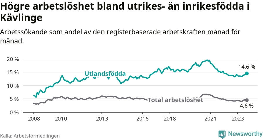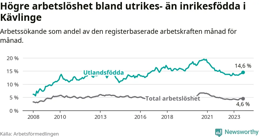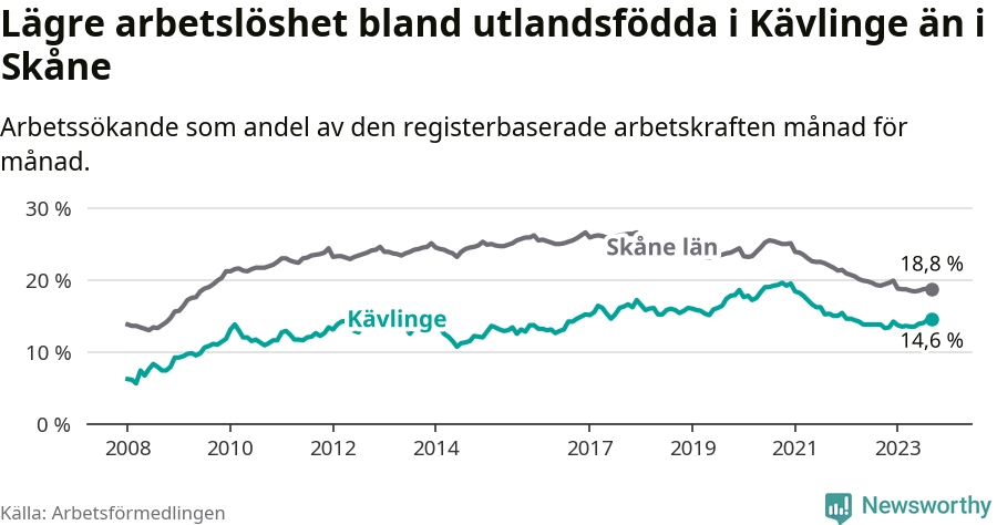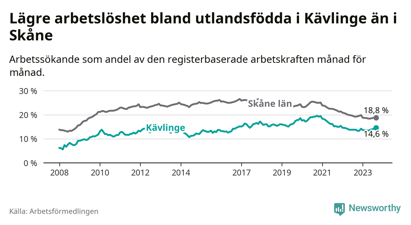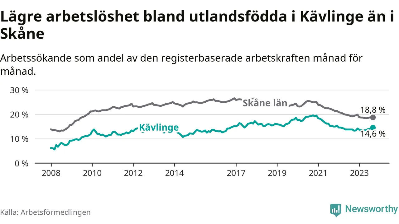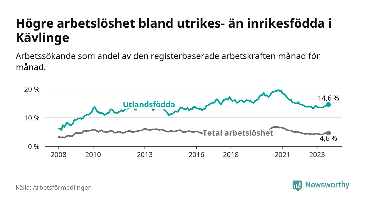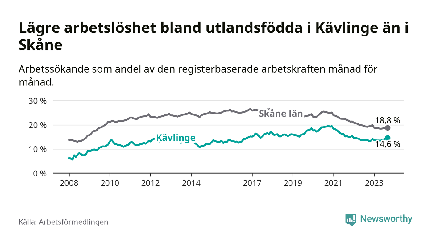 Arbetslösheten bland utlandsfödda var 14,6 procent i Kävlinge under september månad, motsvarande 306 av 2 096 personer. Det är 0,8 procentenheter fler än vid samma tidpunkt i fjol (+41 om man räknar personer).