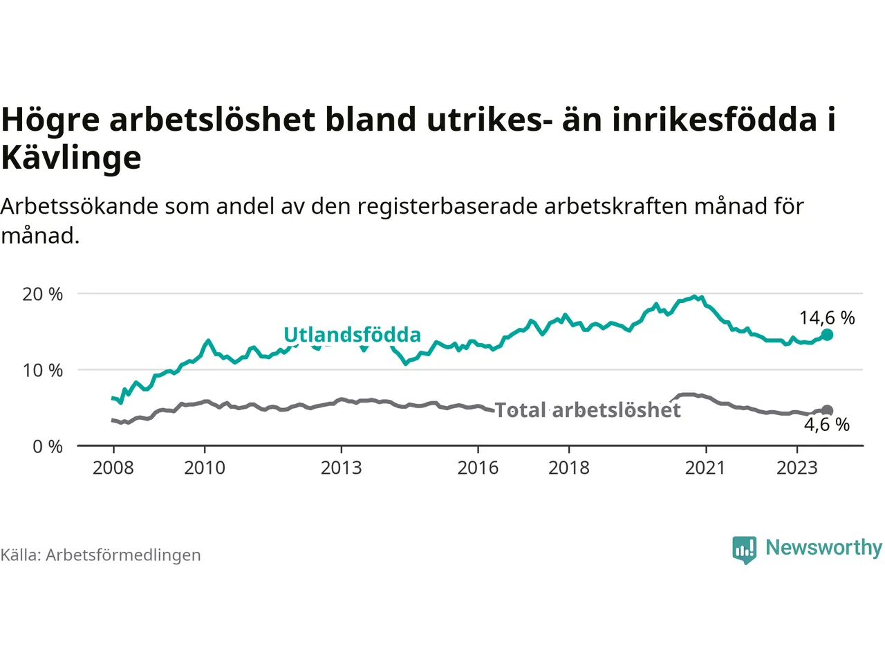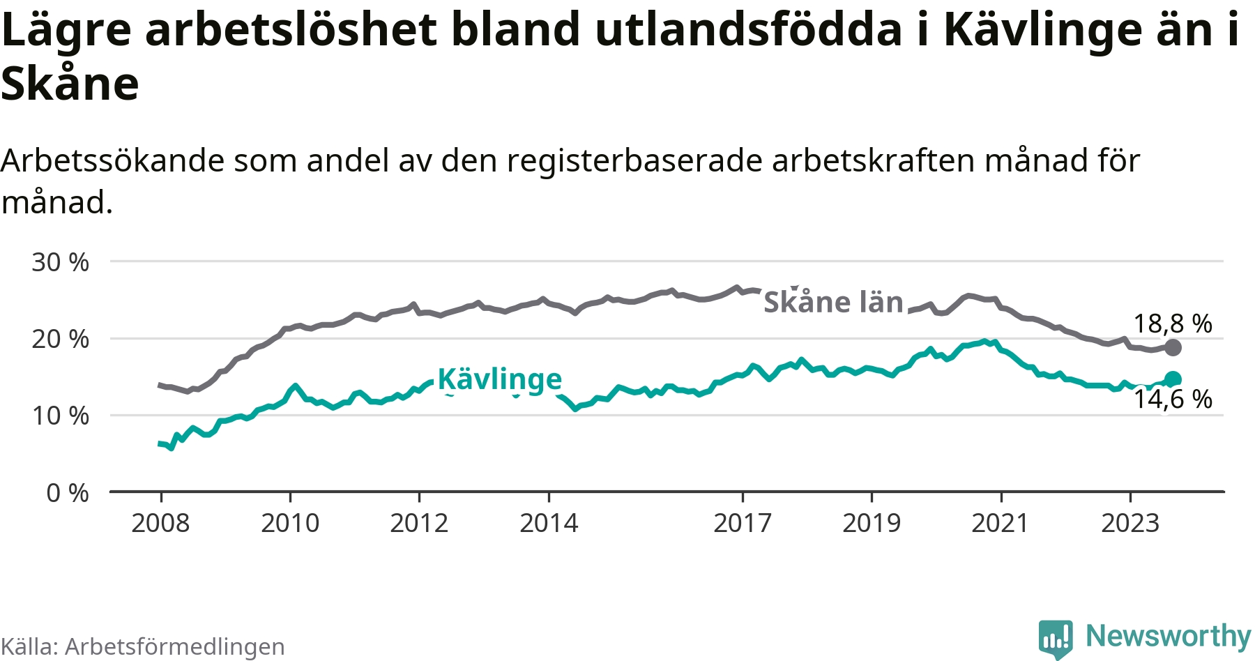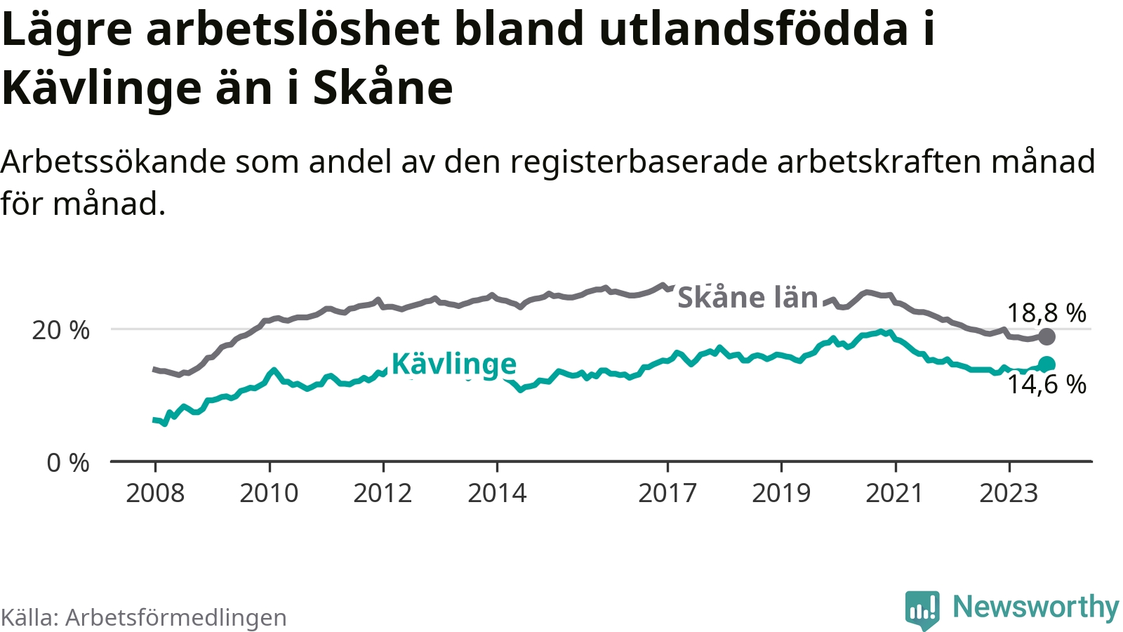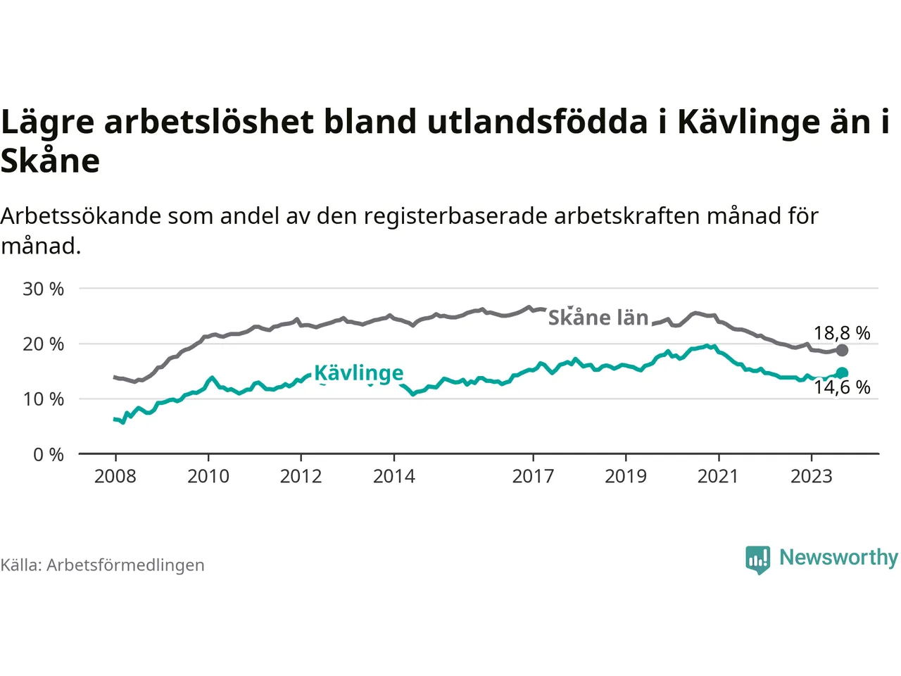 Arbetslösheten bland utlandsfödda var 14,6 procent i Kävlinge under september månad, motsvarande 306 av 2 096 personer. Det är 0,8 procentenheter fler än vid samma tidpunkt i fjol (+41 om man räknar personer).