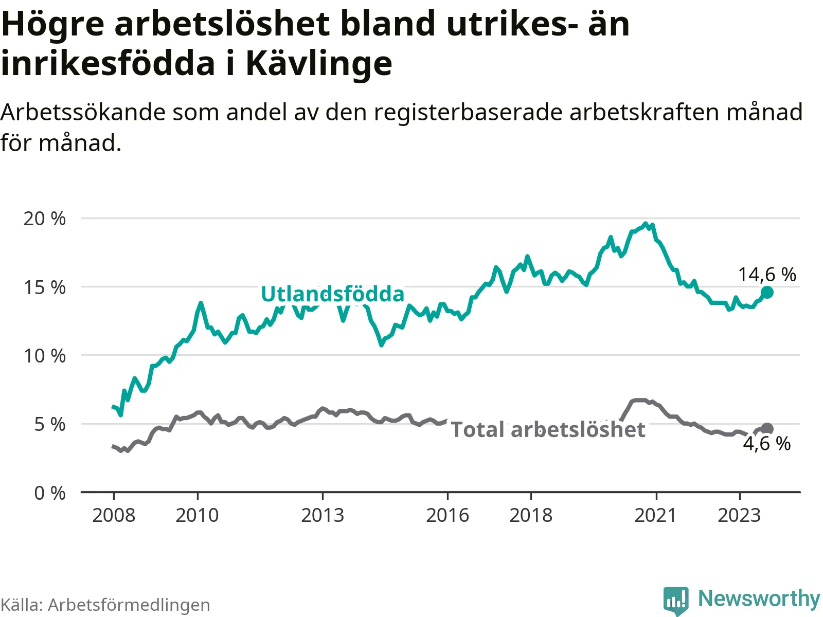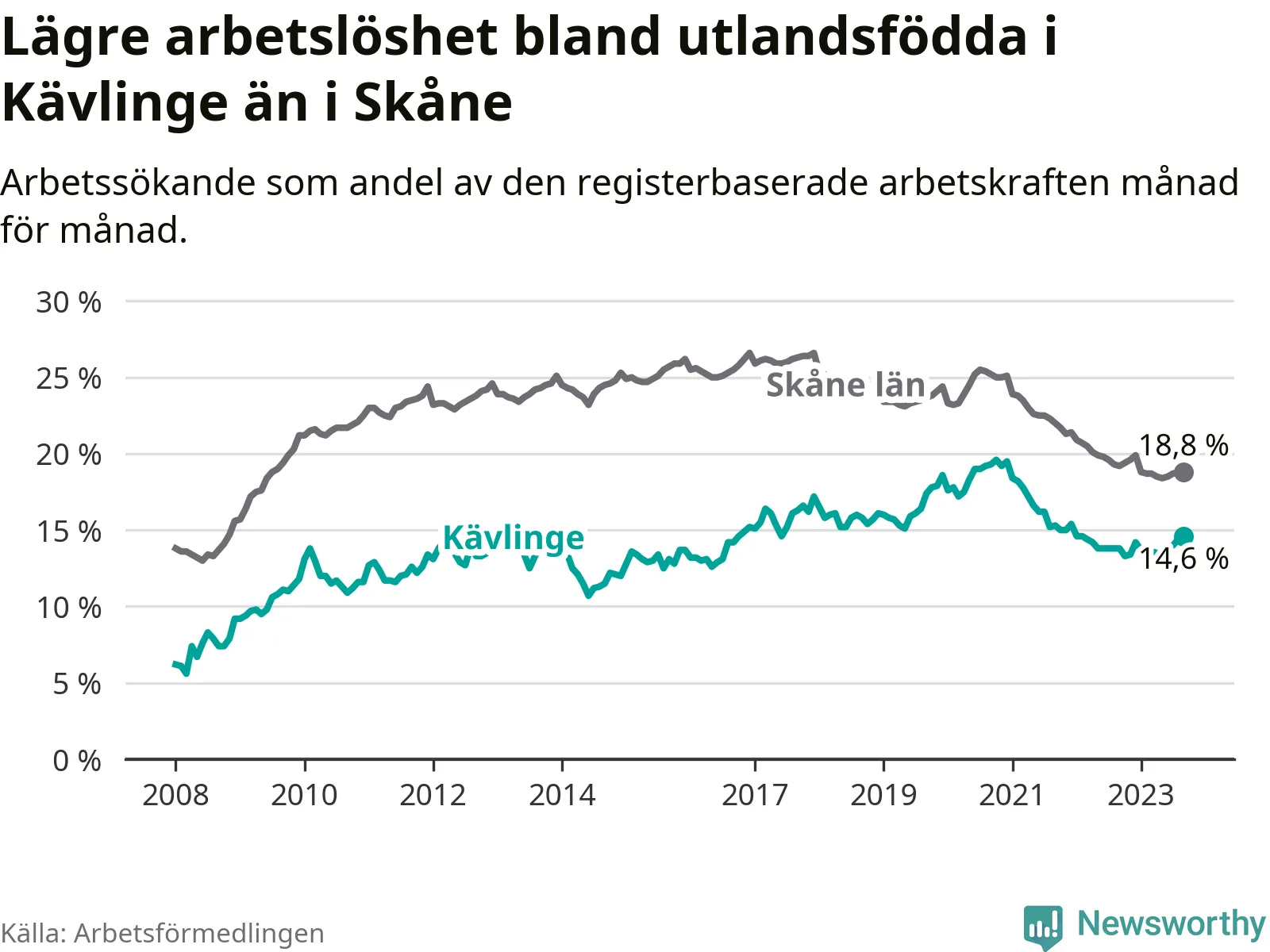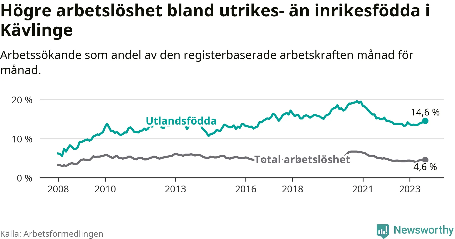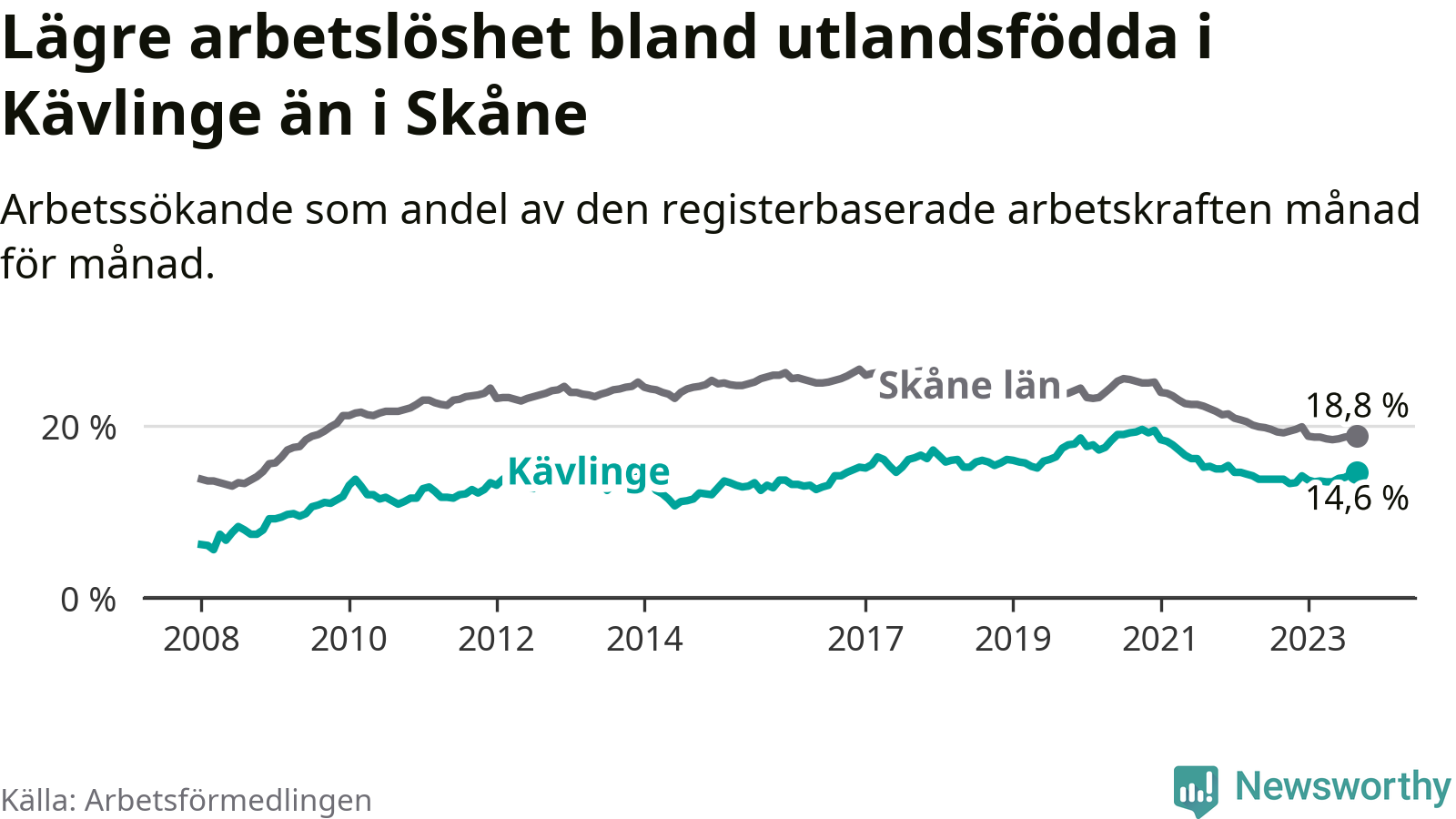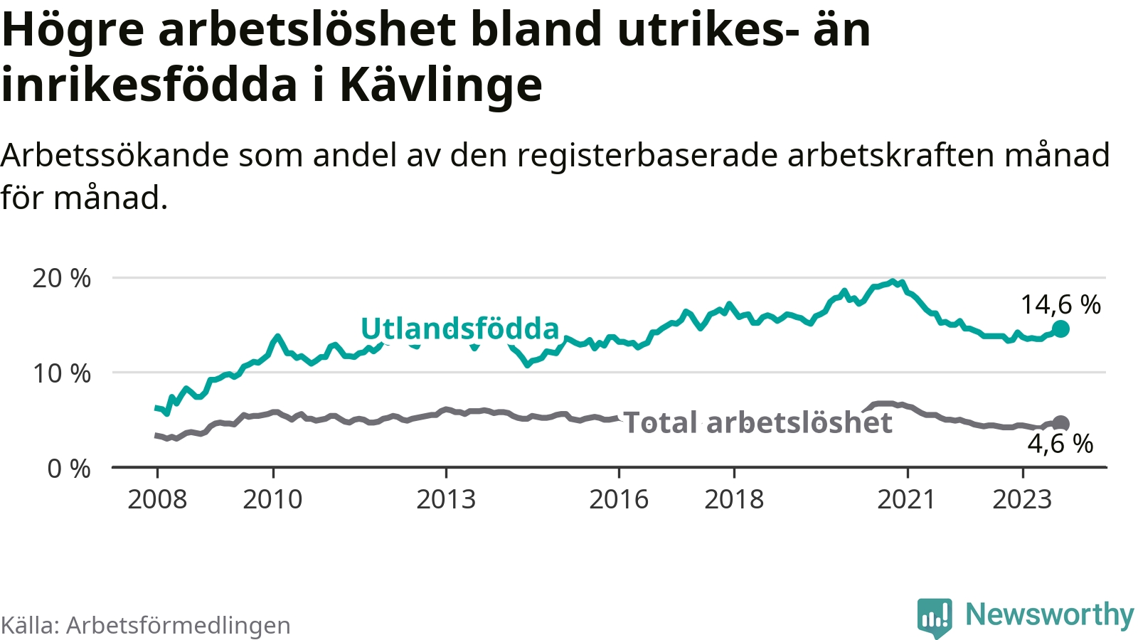 Arbetslösheten bland utlandsfödda var 14,6 procent i Kävlinge under september månad, motsvarande 306 av 2 096 personer. Det är 0,8 procentenheter fler än vid samma tidpunkt i fjol (+41 om man räknar personer).