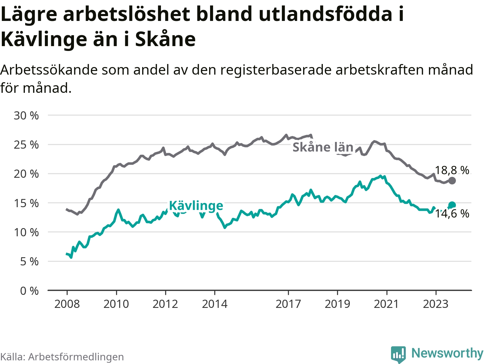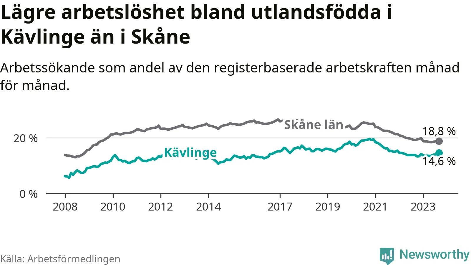 Graf: Arbetslöshet bland utrikesfödda i Kävlinge kommun och Skåne län