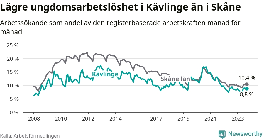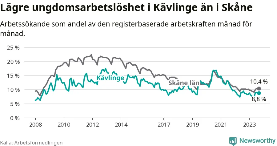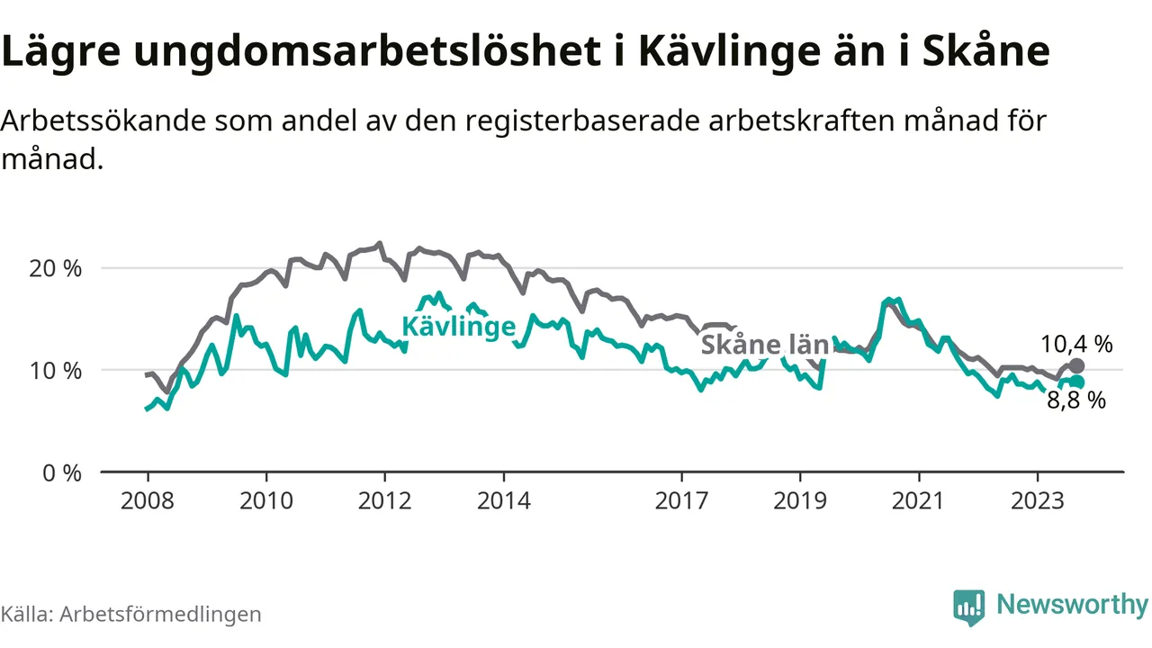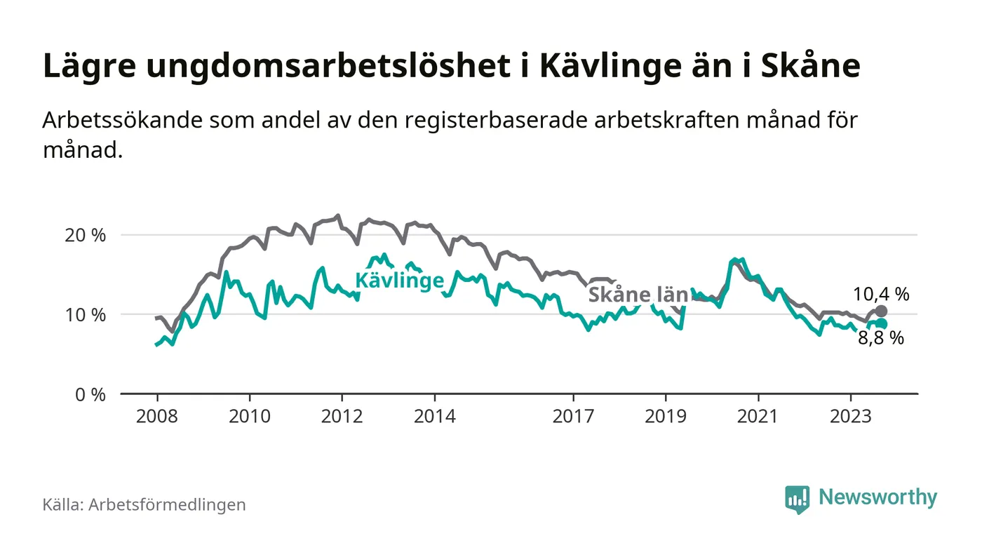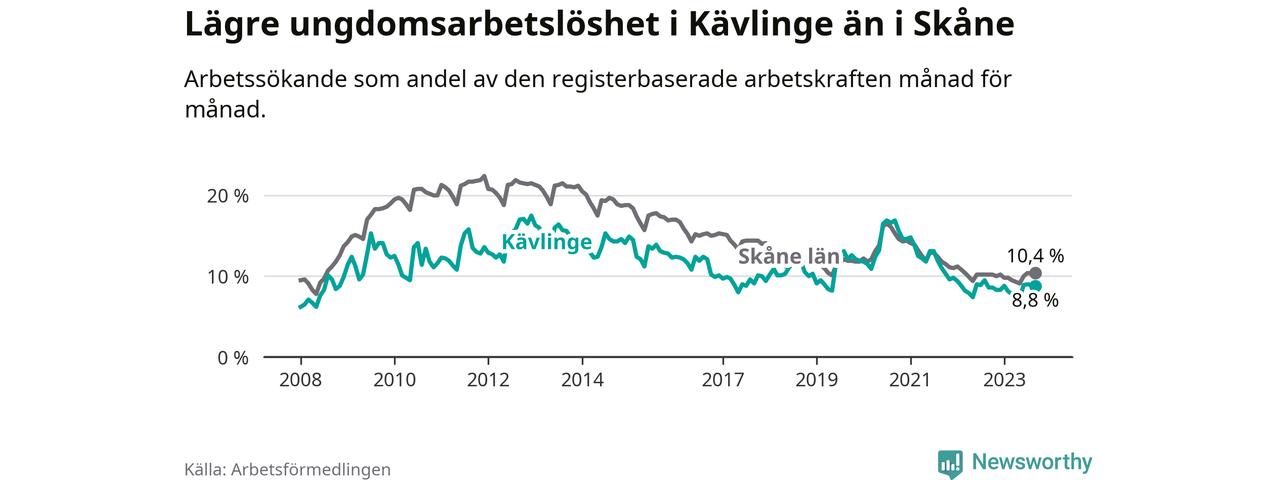 Precis som den totala arbetslösheten ligger ungdomsarbetslösheten i Kävlinge lägre än i Skåne som helhet. Skillnaden mellan kommunen och länet är 1,6 procentenheter.