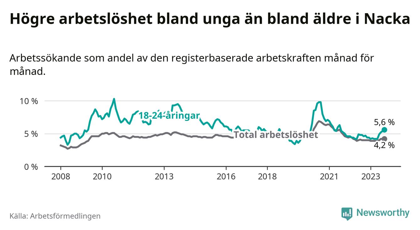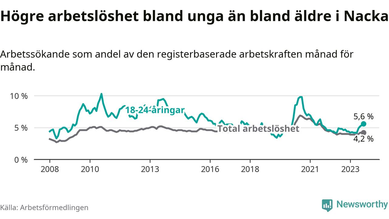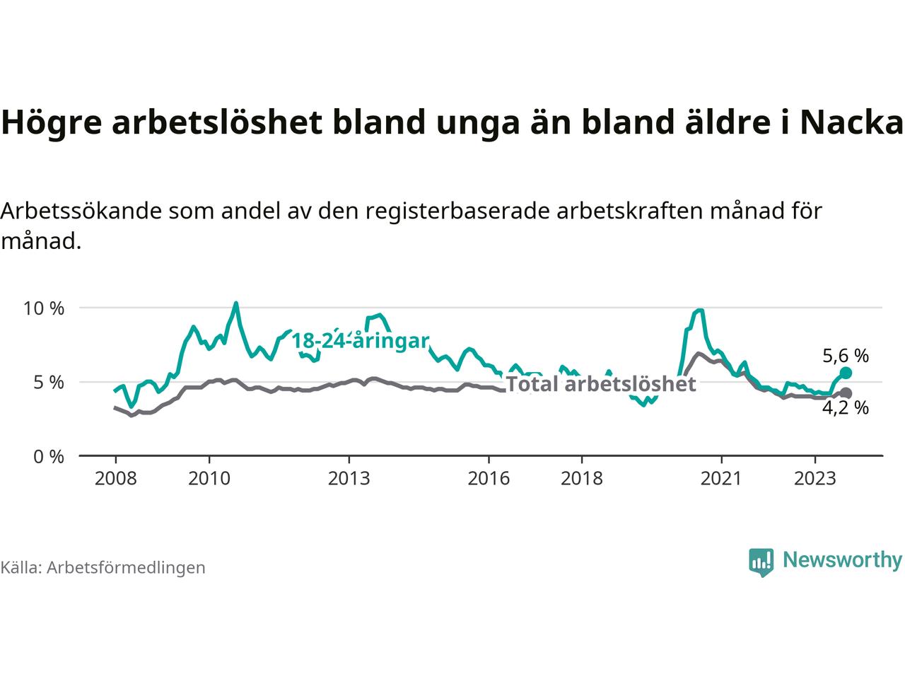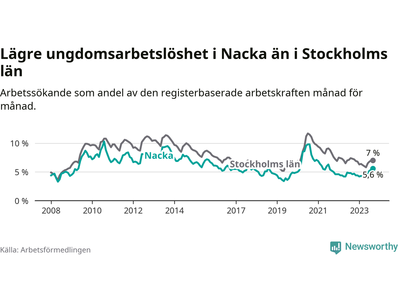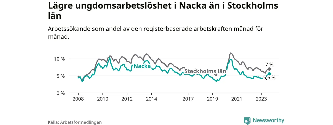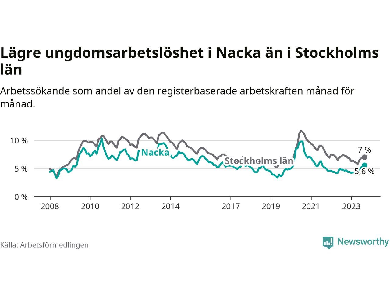 Graf: Arbetslöshet bland unga i Nacka kommun och Stockholms län
