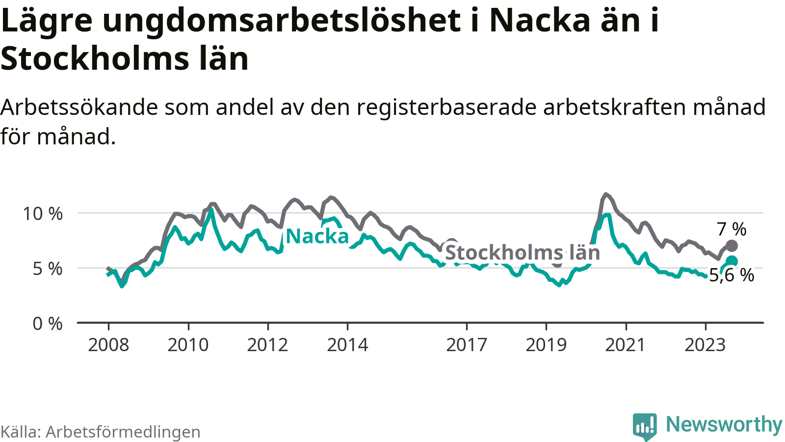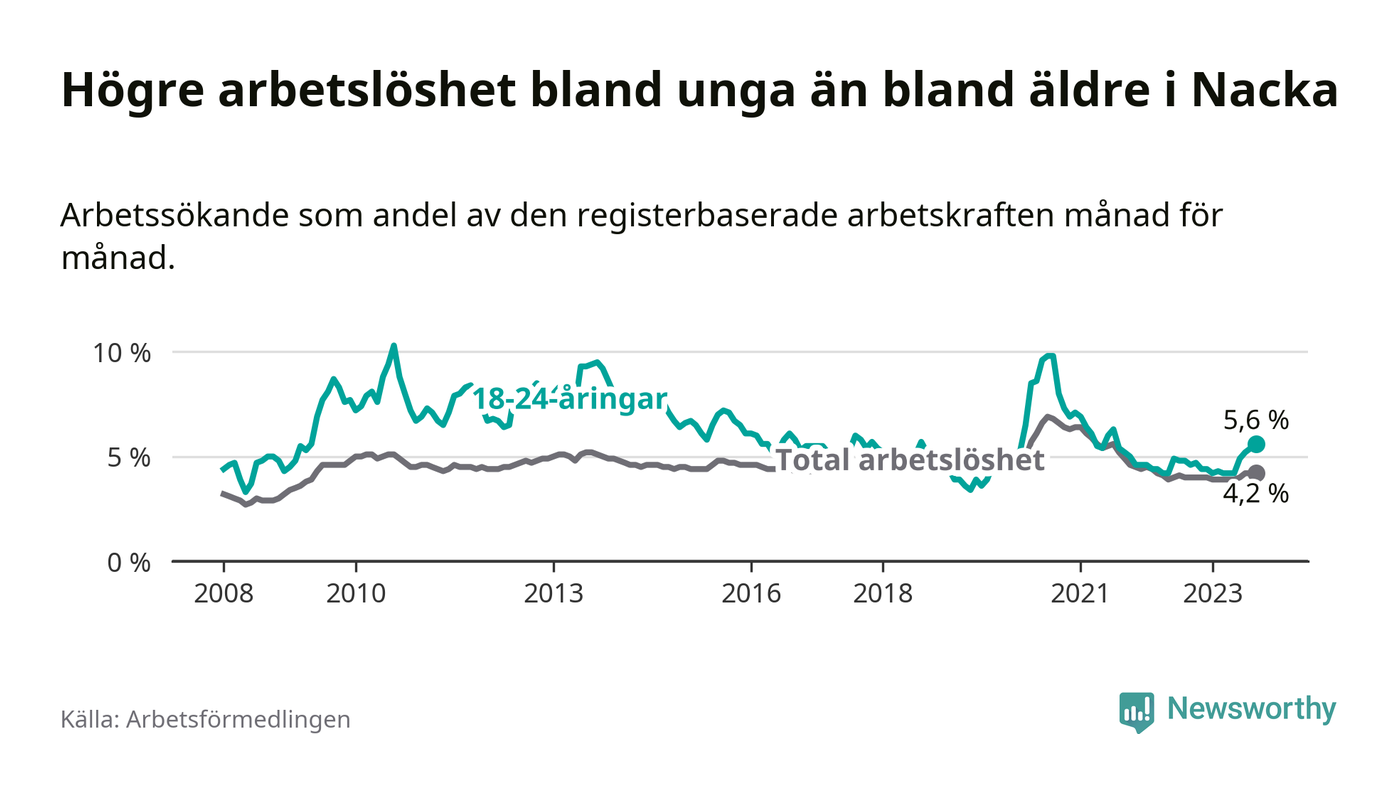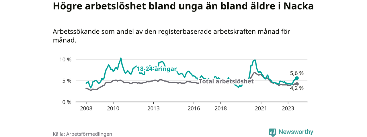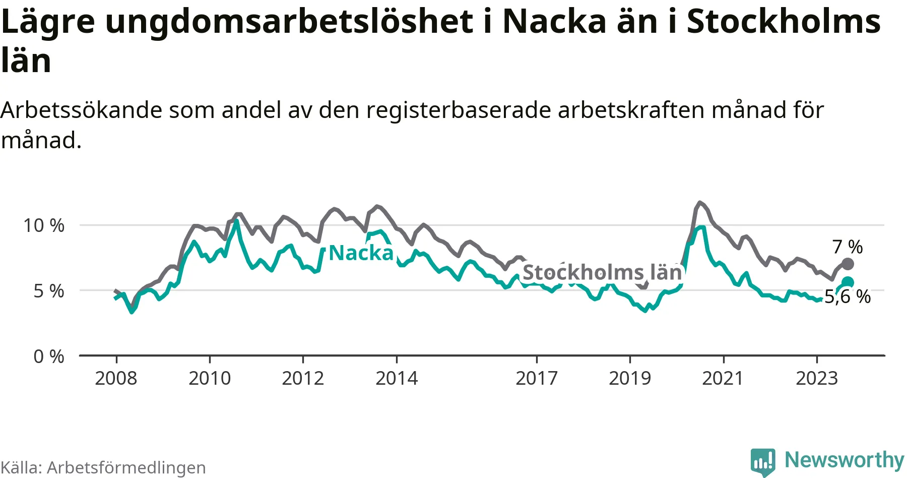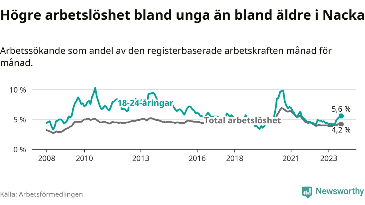 Graf: Arbetslöshet bland unga i Nacka kommun och Stockholms län
