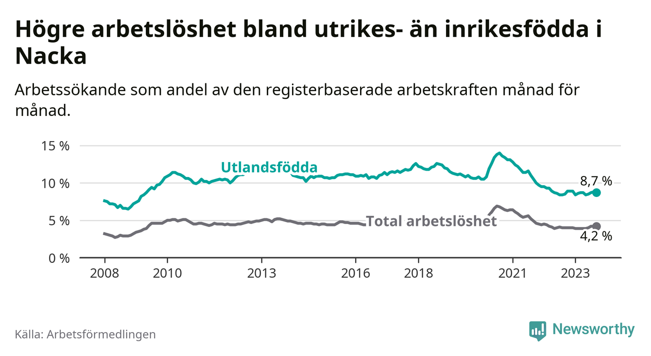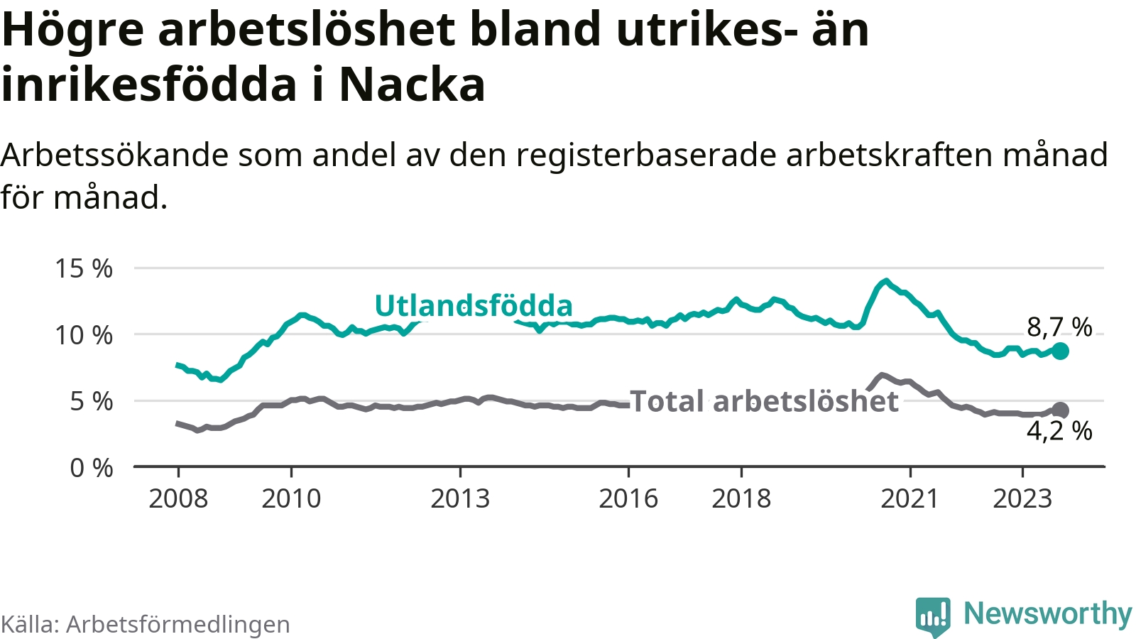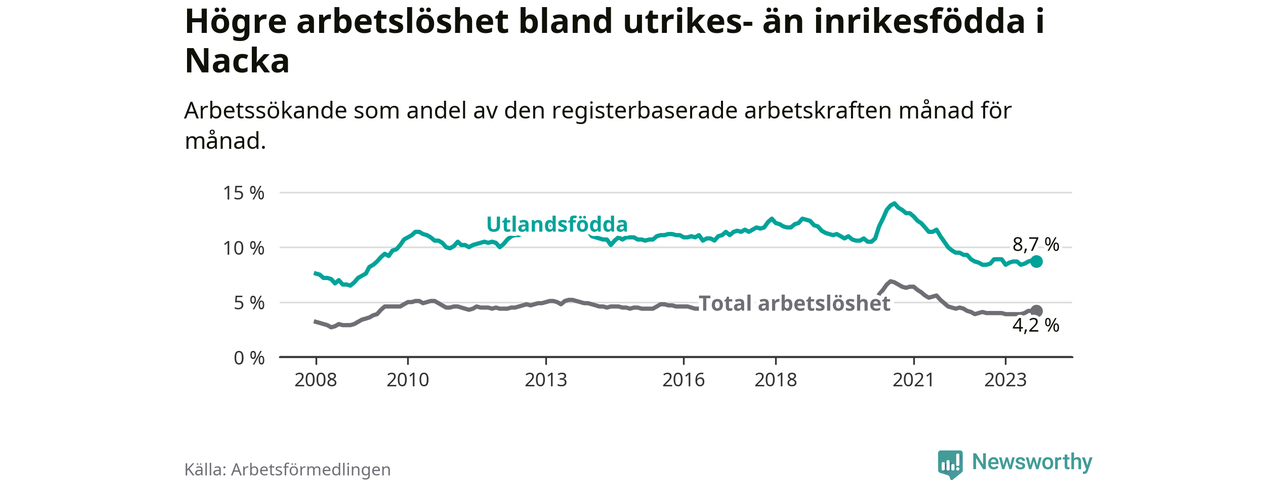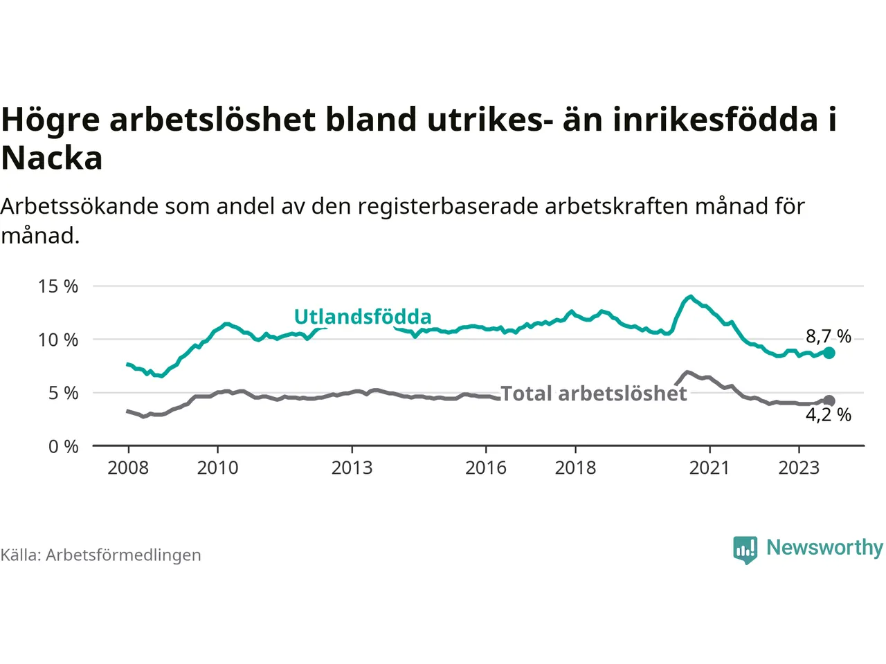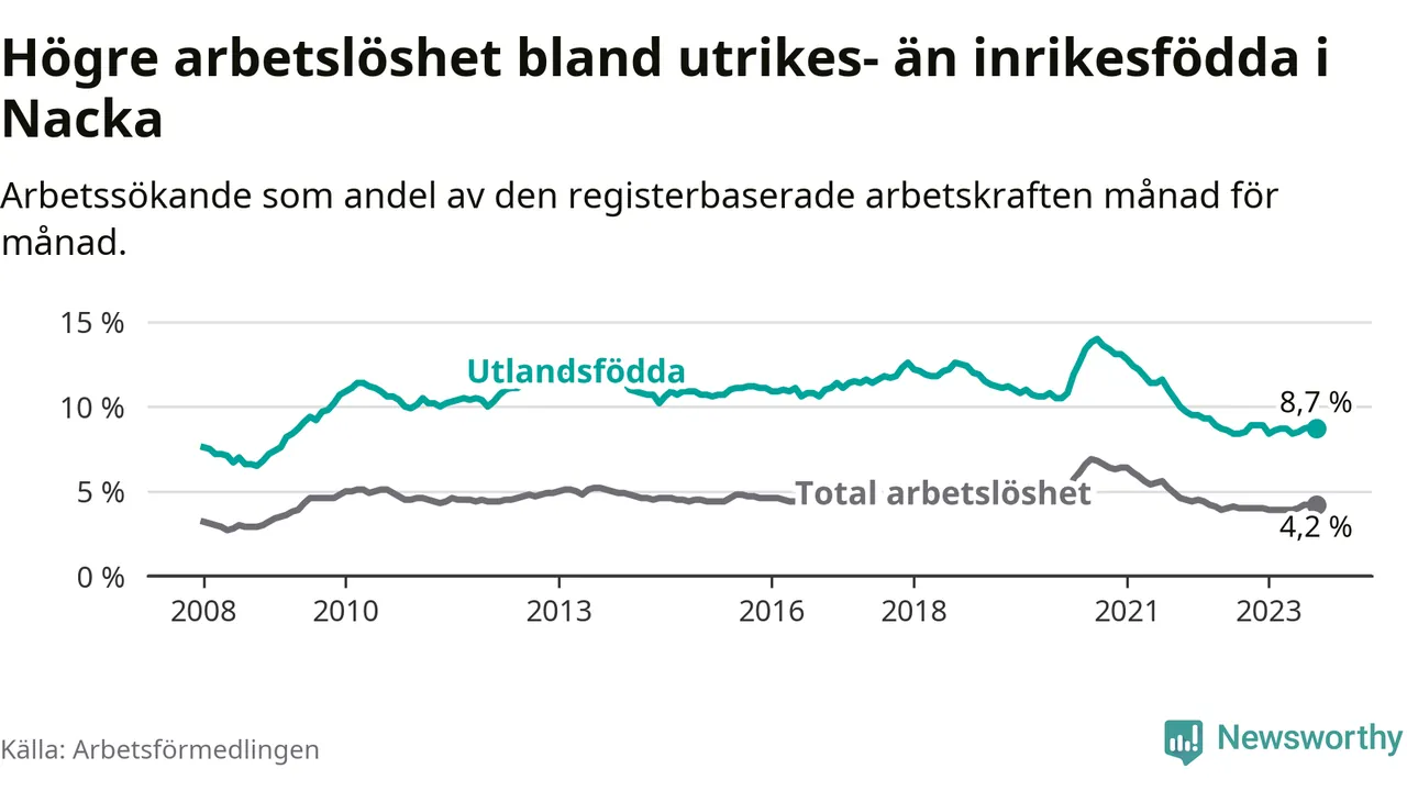 Skillnaden i arbetslöshet mellan utrikesfödda och hela befolkningen är 4,5 procentenheter i Nacka. Det är ungefär samma skillnad som för ett år sedan.