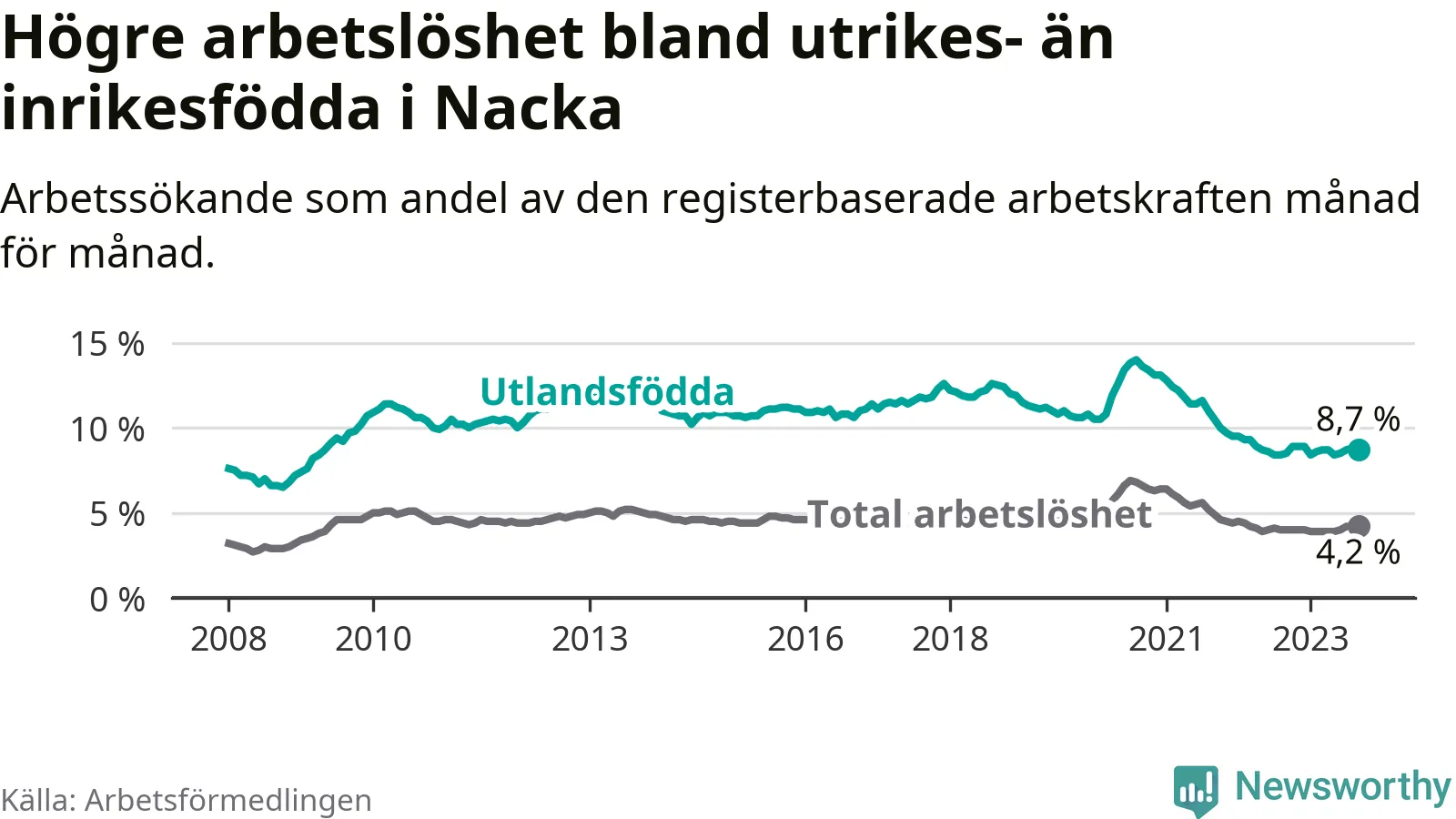 Graf: Skillnad i arbetslöshet mellan utrikesfödda och hela befolkningen i Nacka kommun