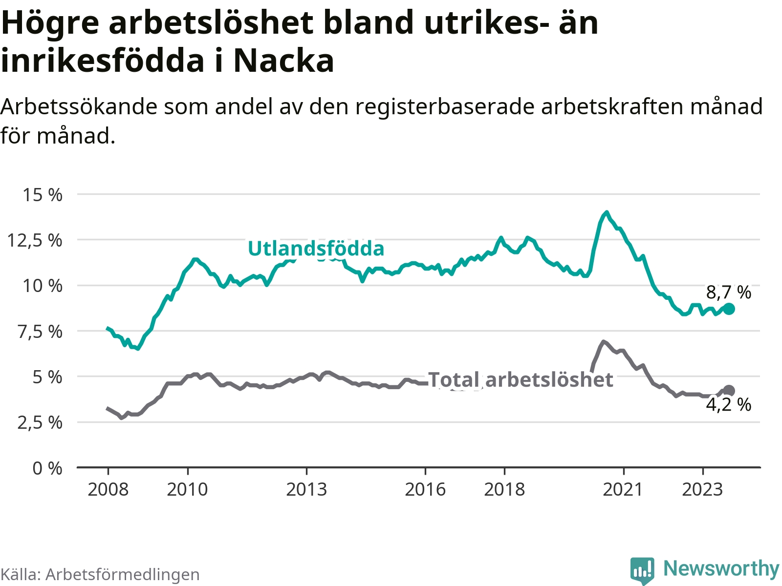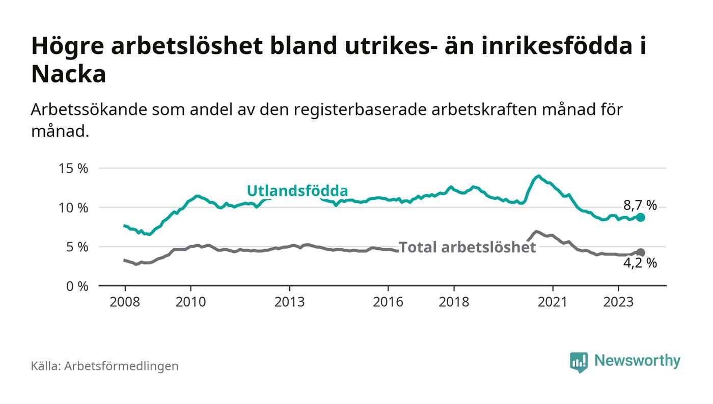 Arbetslösheten bland utlandsfödda var 8,7 procent i Nacka under september månad, motsvarande 1 128 av 12 966 personer. Det är 0,2 procentenheter fler än vid samma tidpunkt i fjol (+88 om man räknar personer).
