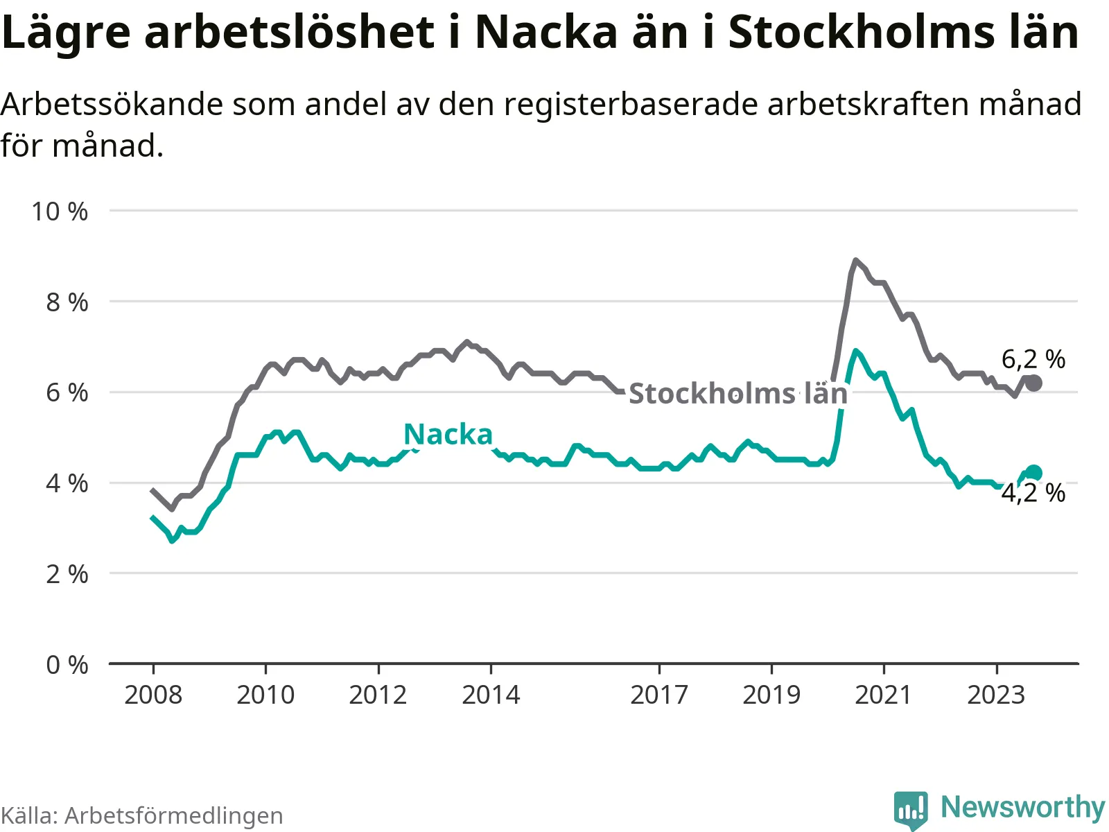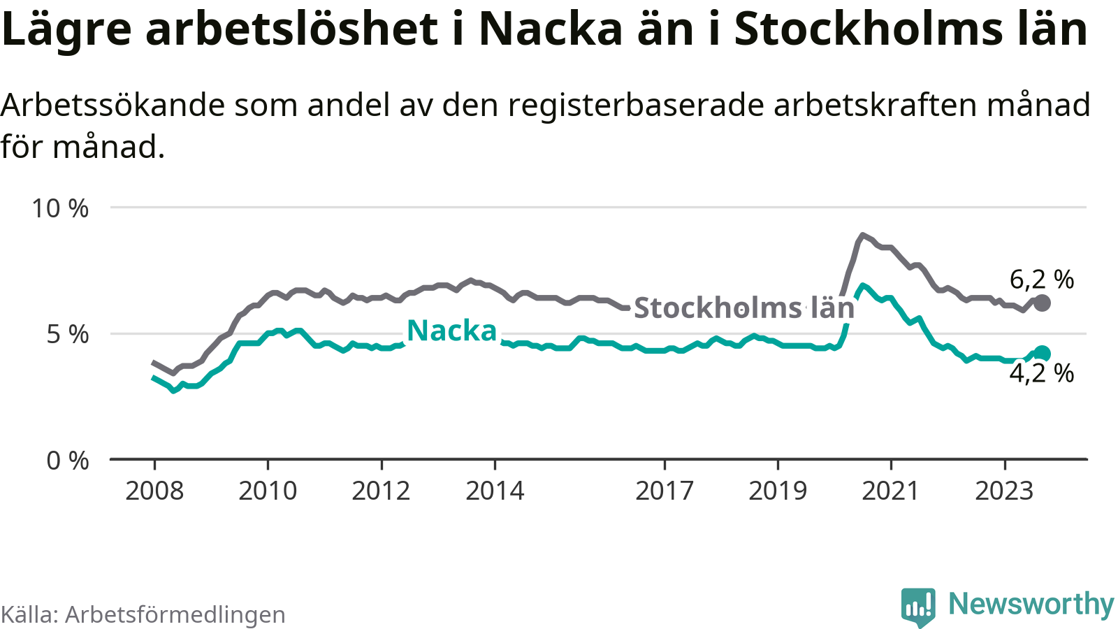Graf: Arbetslöshet i Nacka kommun och Stockholms län