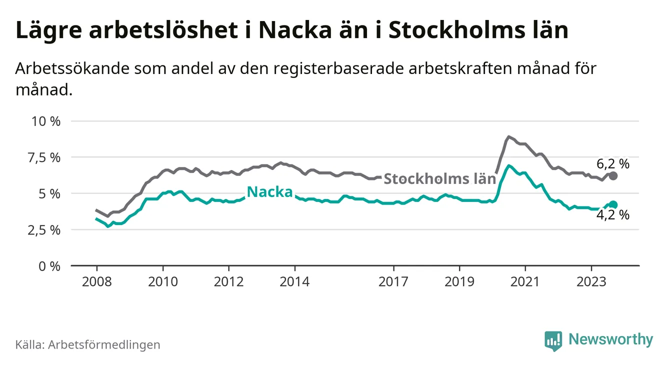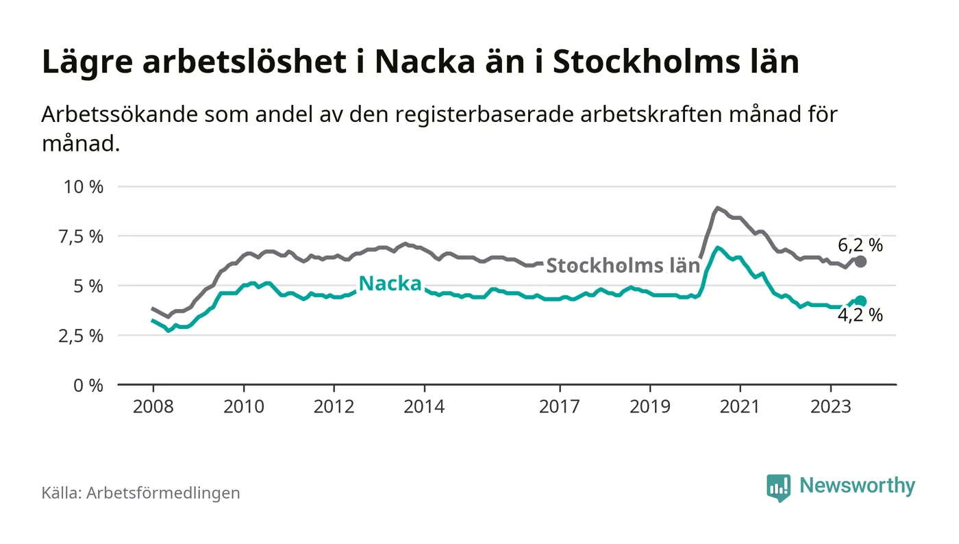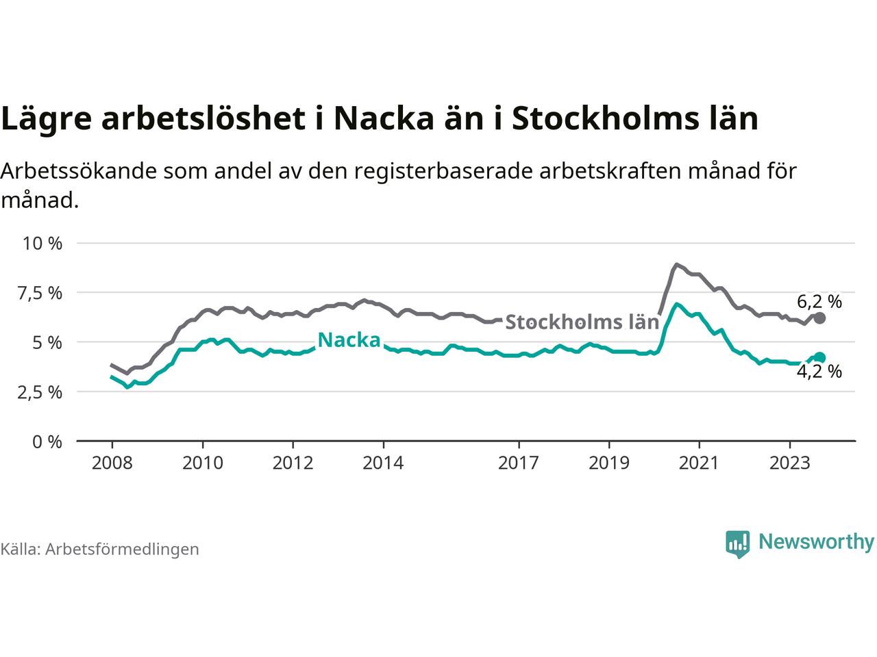 Även om arbetslösheten i Nacka alltså ökar, så ligger den fortfarande under snittet i hela Stockholms län (4,2 procent i kommunen, jämfört med 6,2 procent i hela länet). Vaxholm har den lägsta arbetslösheten i länet (3,1 procent), medan Botkyrka har den högsta (10,5 procent). För att Nacka skulle komma ner i samma arbetslöshetsnivå som Vaxholm skulle 602 personer behöva sysselsättas.
