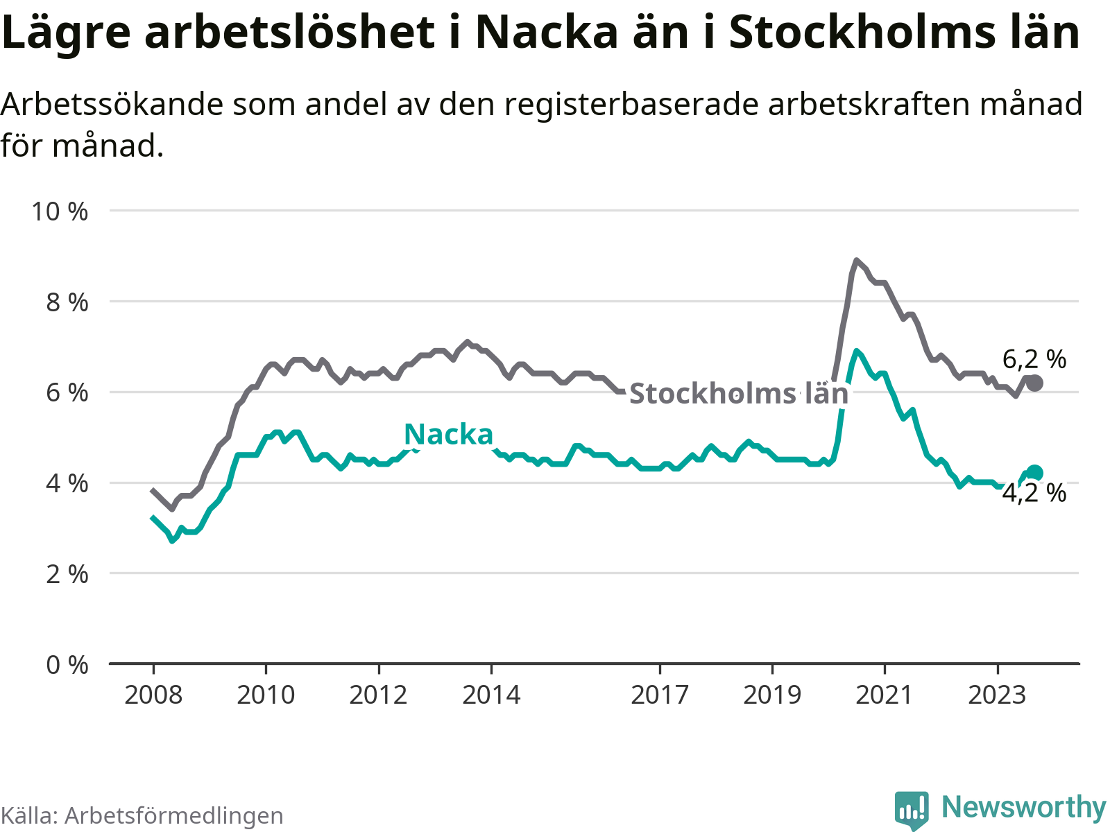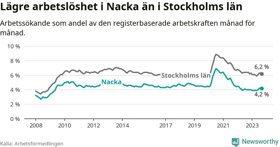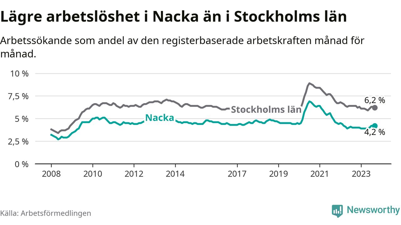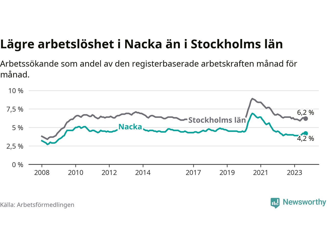 Även om arbetslösheten i Nacka alltså ökar, så ligger den fortfarande under snittet i hela Stockholms län (4,2 procent i kommunen, jämfört med 6,2 procent i hela länet). Vaxholm har den lägsta arbetslösheten i länet (3,1 procent), medan Botkyrka har den högsta (10,5 procent). För att Nacka skulle komma ner i samma arbetslöshetsnivå som Vaxholm skulle 602 personer behöva sysselsättas.