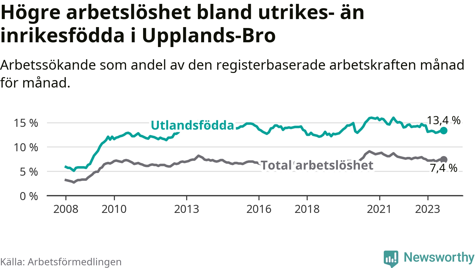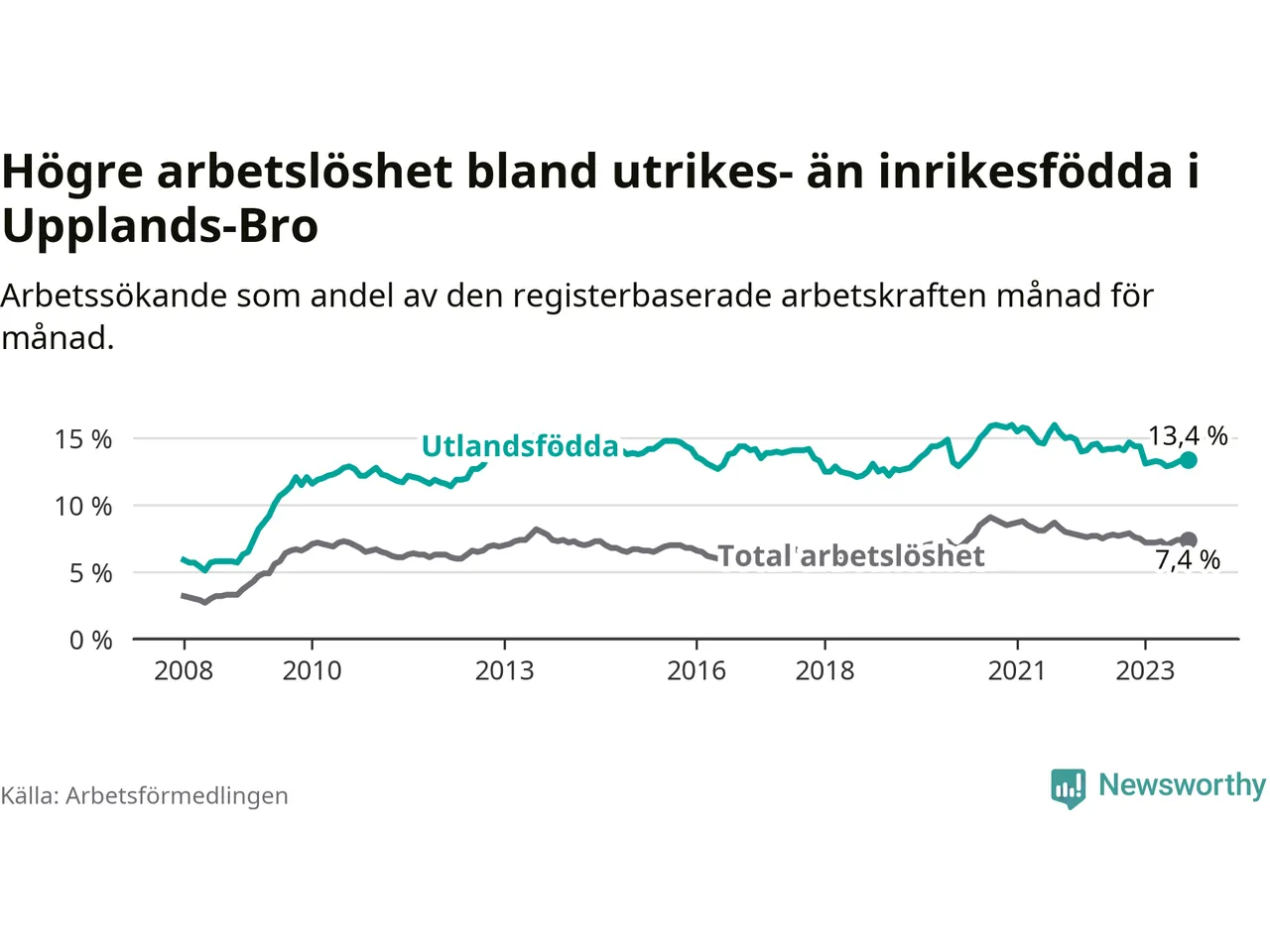 | Bland utlandsfödda | 13,4 % | −0,7 % ▼ | 12,2 % | −0,5 % ▼ | 15,2 % | −1,0 % ▼ |
