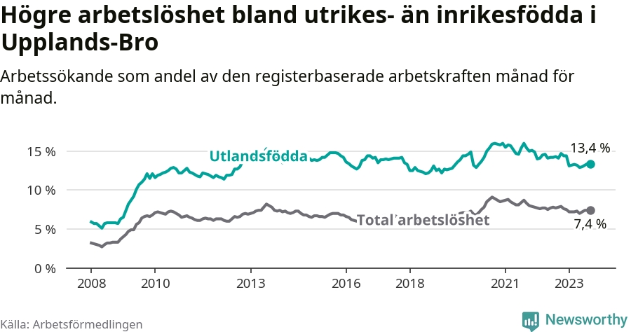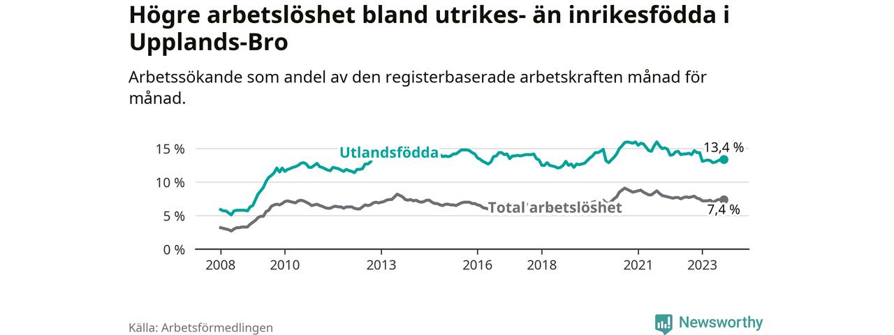 Arbetslösheten bland utlandsfödda var 13,4 procent i Upplands-Bro under september månad, motsvarande 858 av 6 403 personer. Det är 0,7 procentenheter färre än vid samma tidpunkt i fjol (+44 om man räknar personer). Därmed har de utlandsföddas arbetslöshet varit lägre än vid samma tidpunkt i fjol i över två år i sträck. Sedan augusti 2021 har arbetslösheten bland utlandsfödda minskat från 16,0 till 13,4 procent.