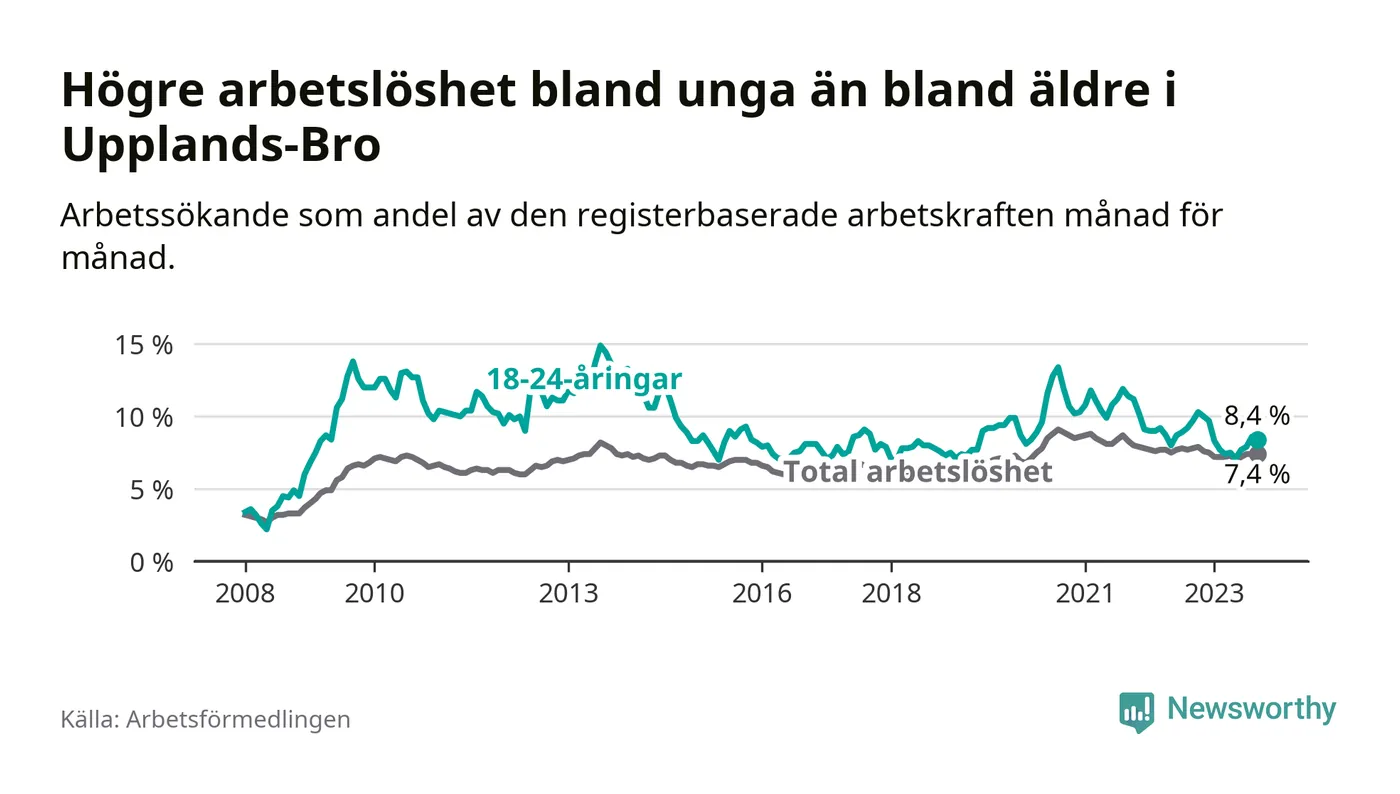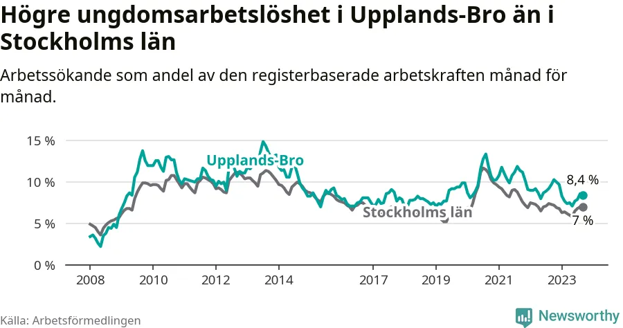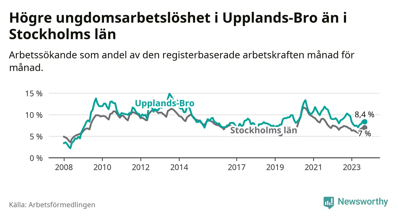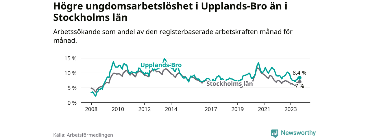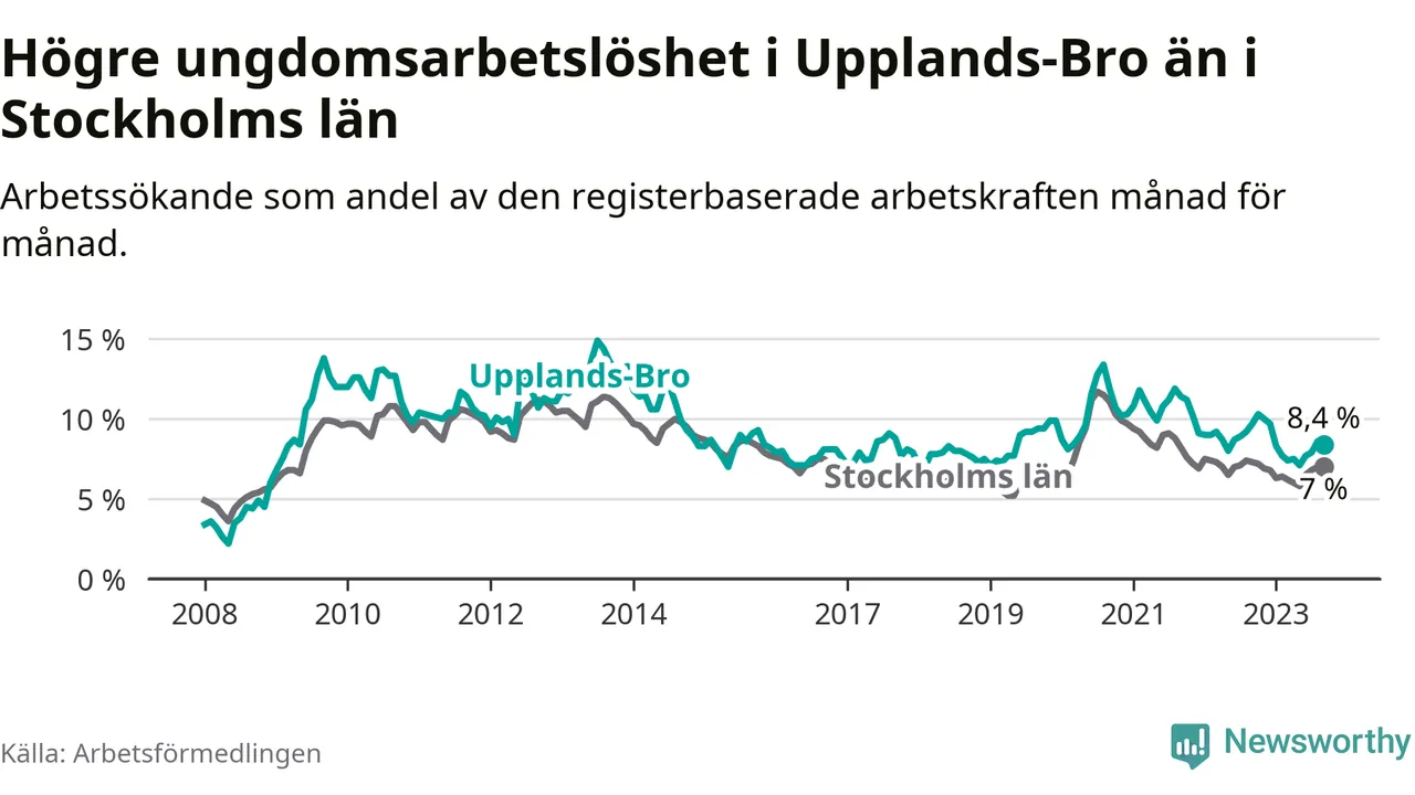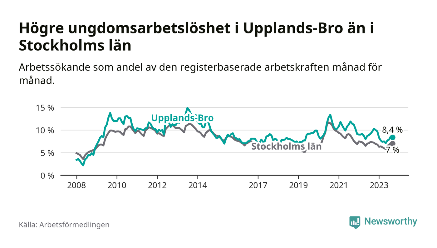 Precis som den totala arbetslösheten ligger ungdomsarbetslösheten i Upplands-Bro högre än i Stockholms län som helhet. Skillnaden mellan kommunen och länet är 1,4 procentenheter.