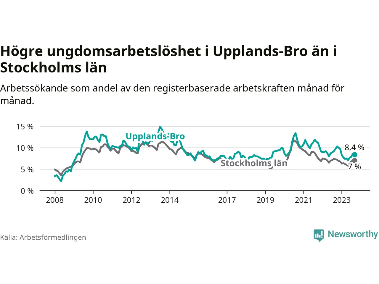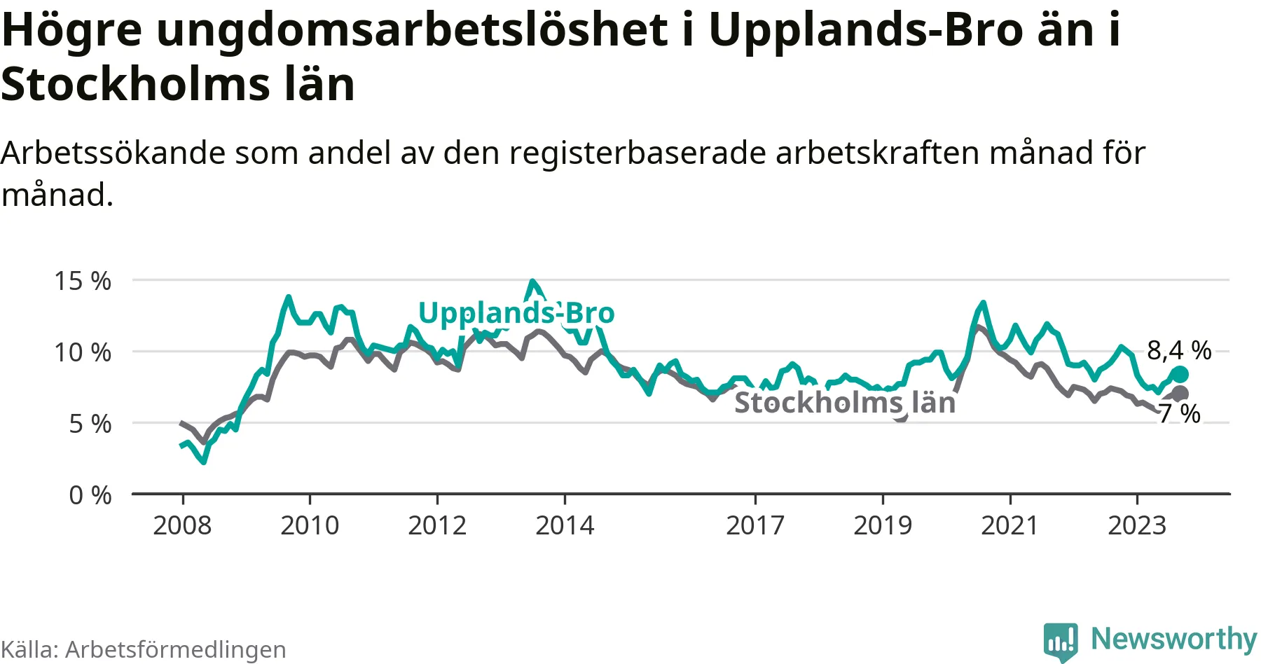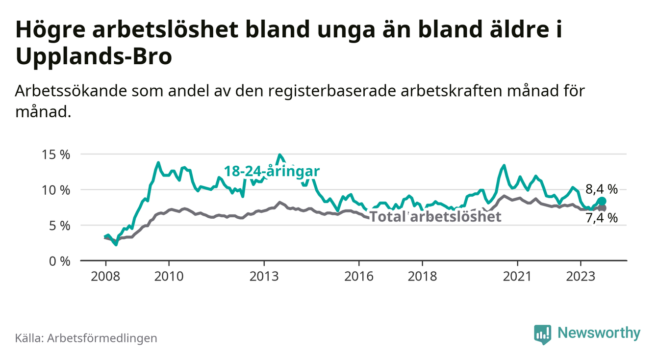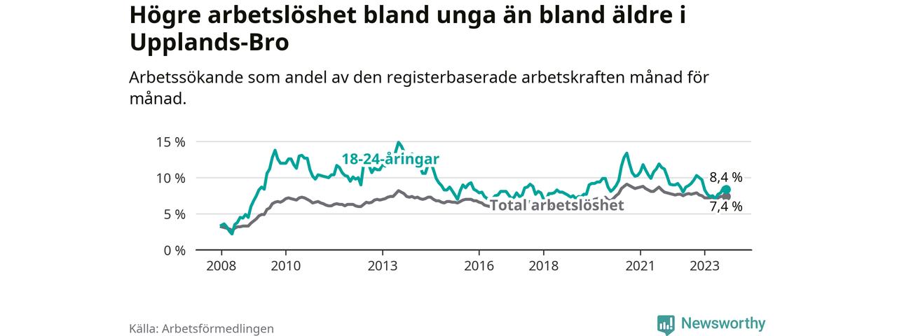 Precis som den totala arbetslösheten ligger ungdomsarbetslösheten i Upplands-Bro högre än i Stockholms län som helhet. Skillnaden mellan kommunen och länet är 1,4 procentenheter.