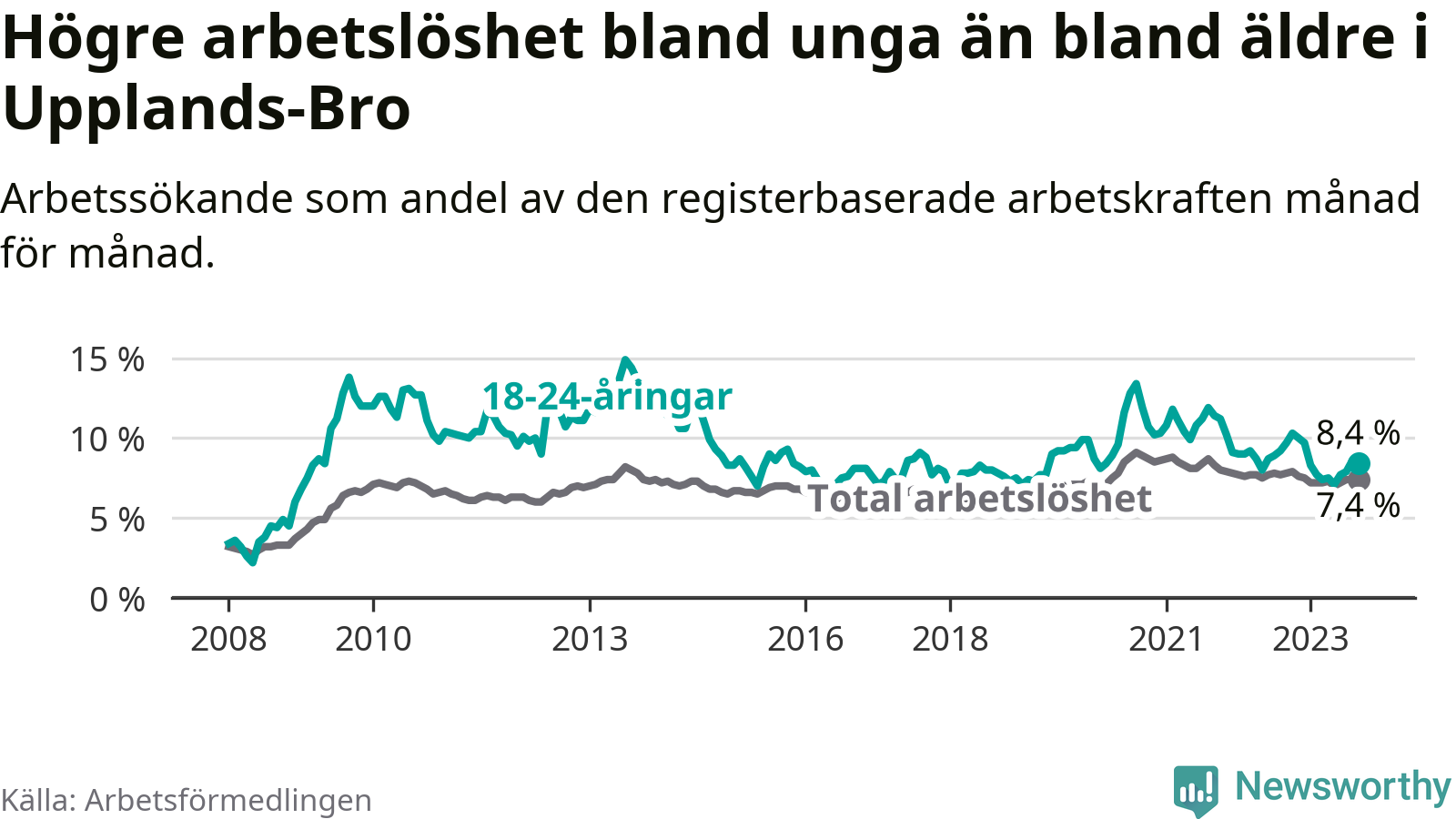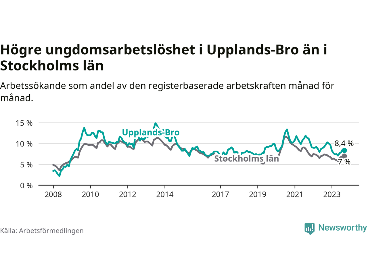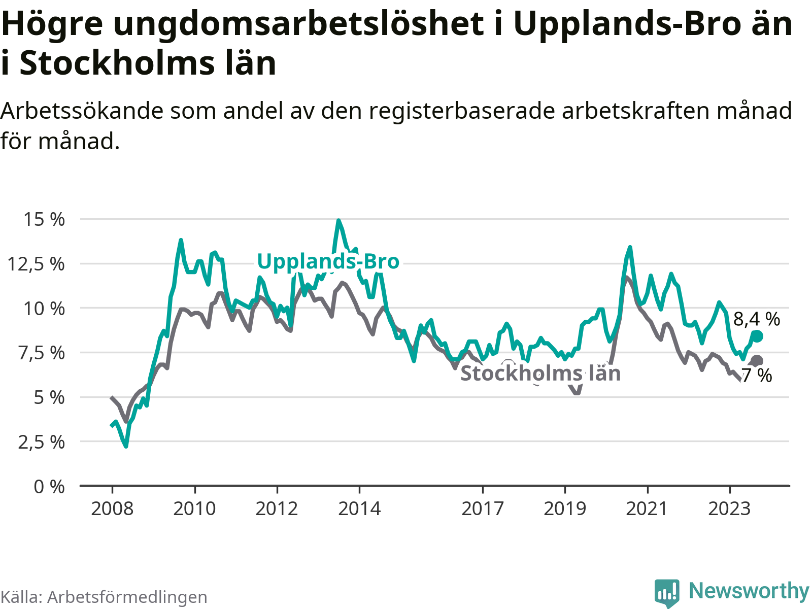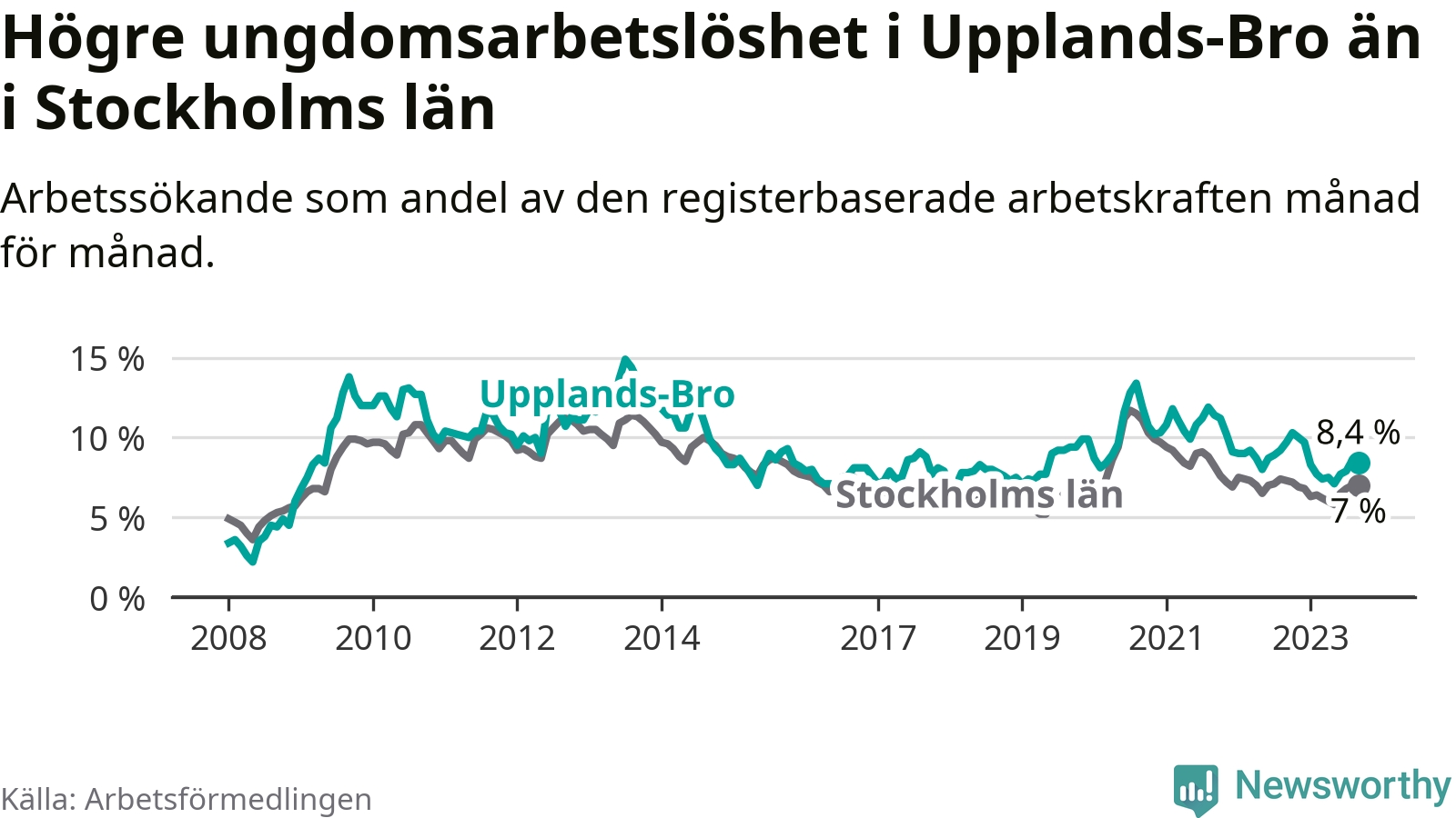 Precis som den totala arbetslösheten ligger ungdomsarbetslösheten i Upplands-Bro högre än i Stockholms län som helhet. Skillnaden mellan kommunen och länet är 1,4 procentenheter.