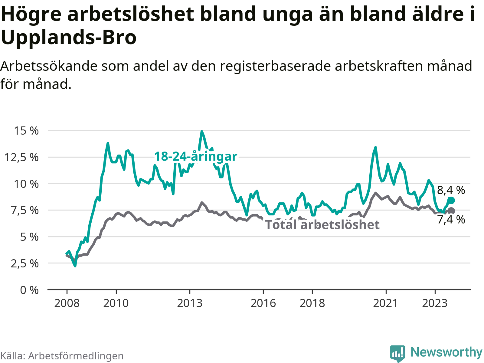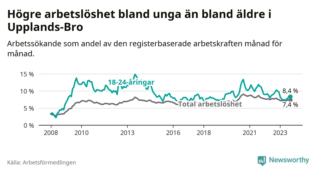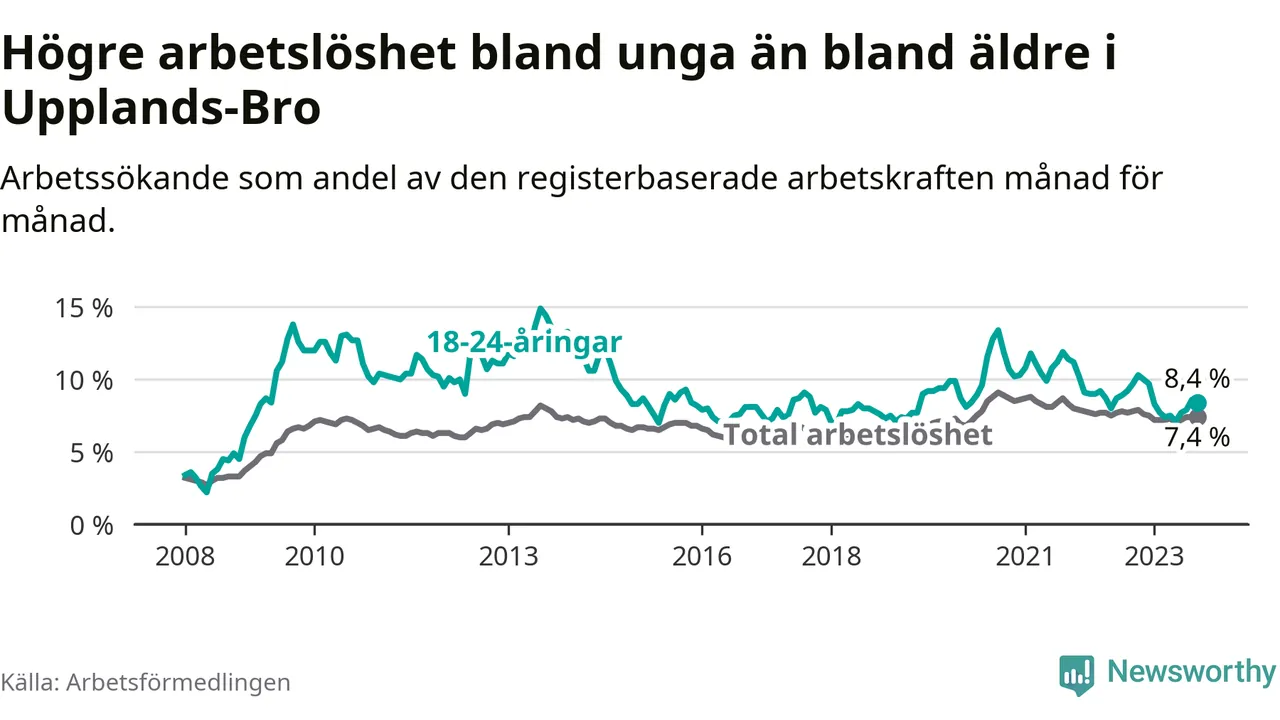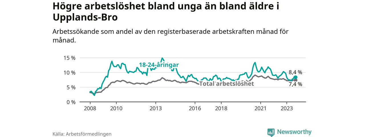 I och med den senaste månadens nedgång har de ungas arbetslöshet i Upplands-Bro sjunkit nio månader i följd (ner från 9,7 procent i december 2022 till 8,4 procent nu).