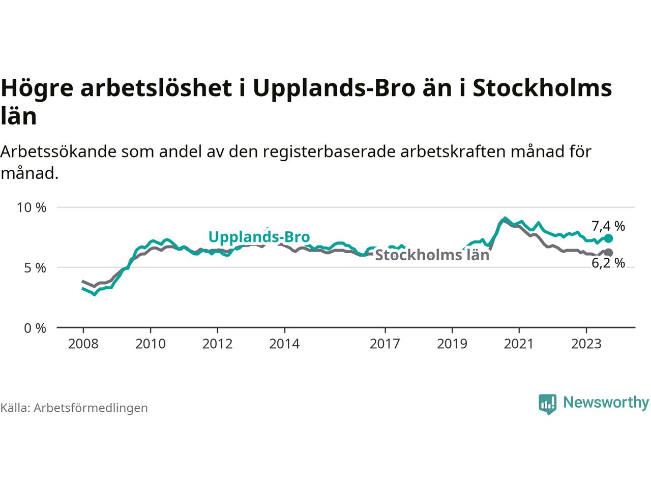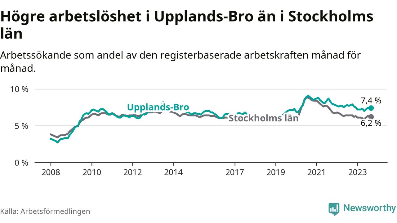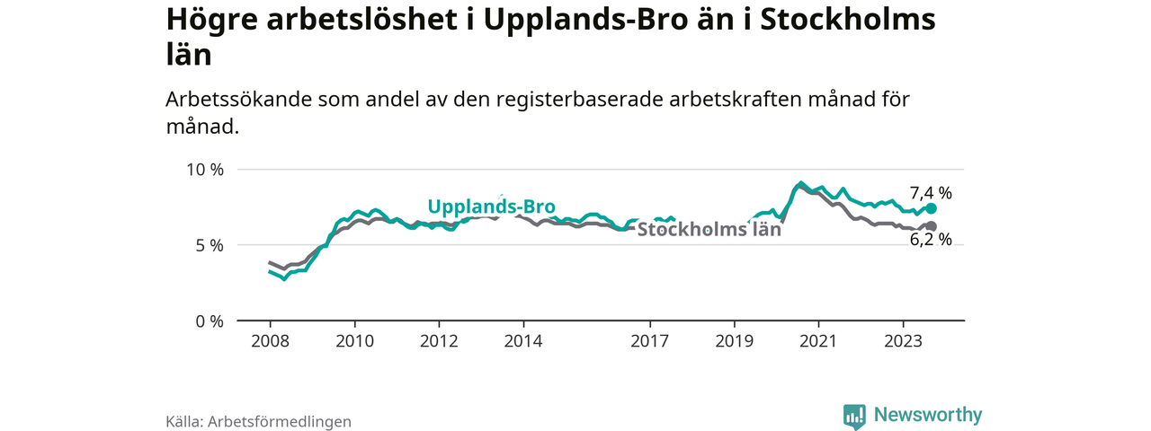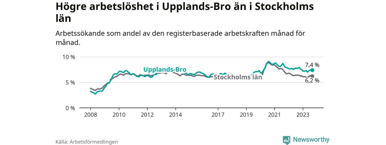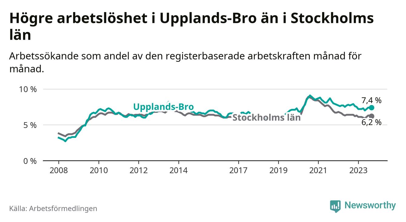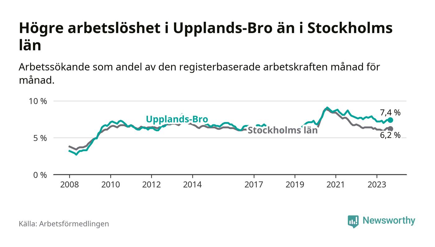 Även om arbetslösheten i Upplands-Bro alltså minskar, så ligger den fortfarande över snittet i hela Stockholms län (7,4 procent i kommunen, jämfört med 6,2 procent i hela länet). Vaxholm har den lägsta arbetslösheten i länet (3,1 procent), medan Botkyrka har den högsta (10,5 procent). För att Upplands-Bro skulle komma ner i samma arbetslöshetsnivå som Vaxholm skulle 695 personer behöva sysselsättas.