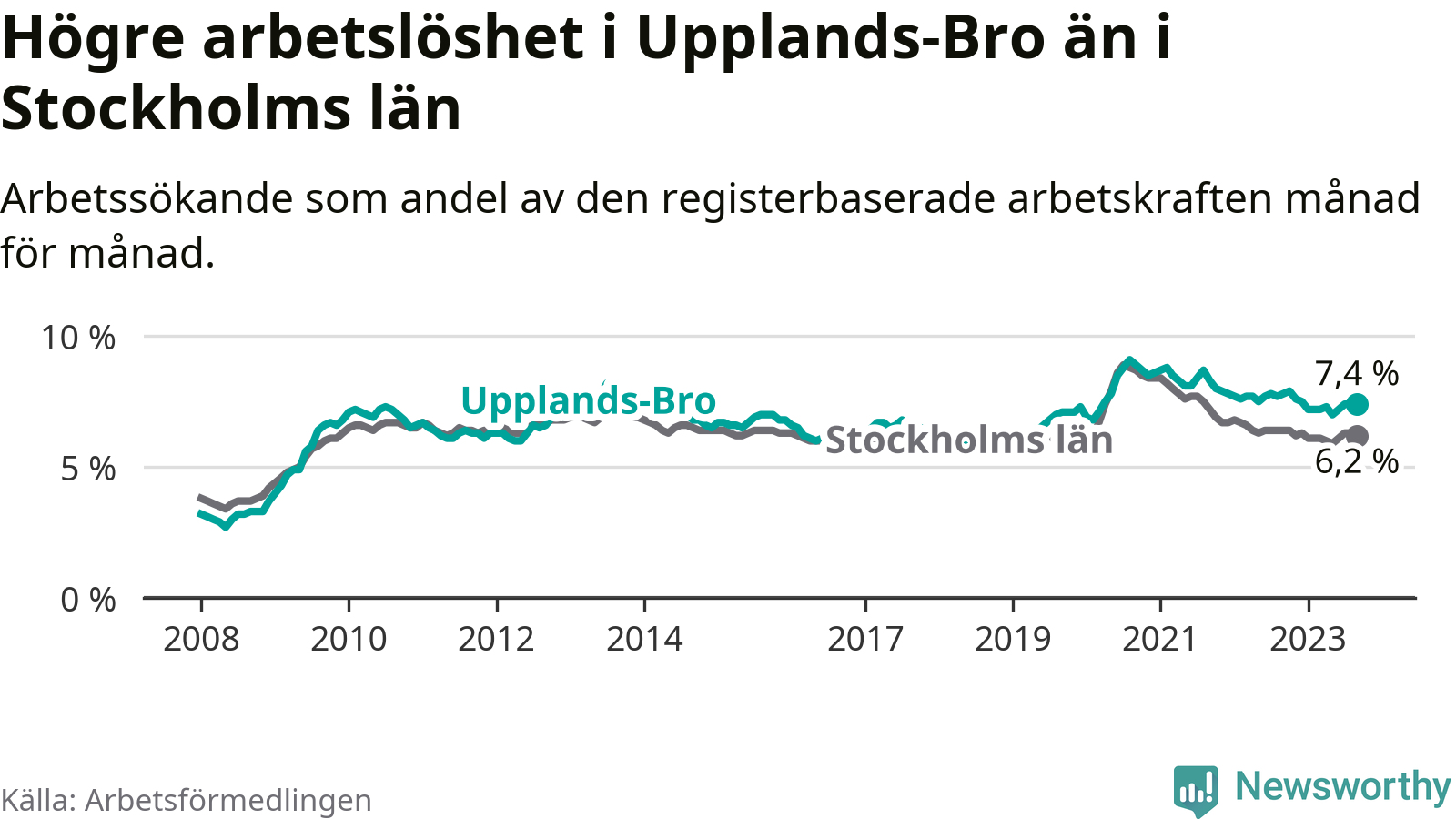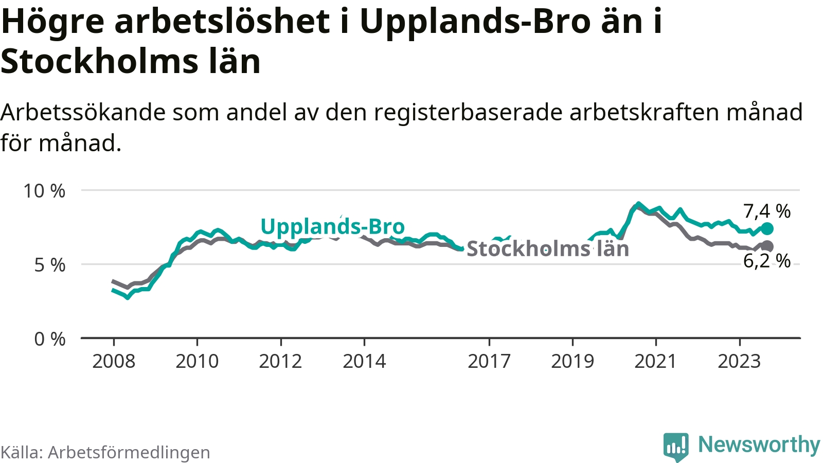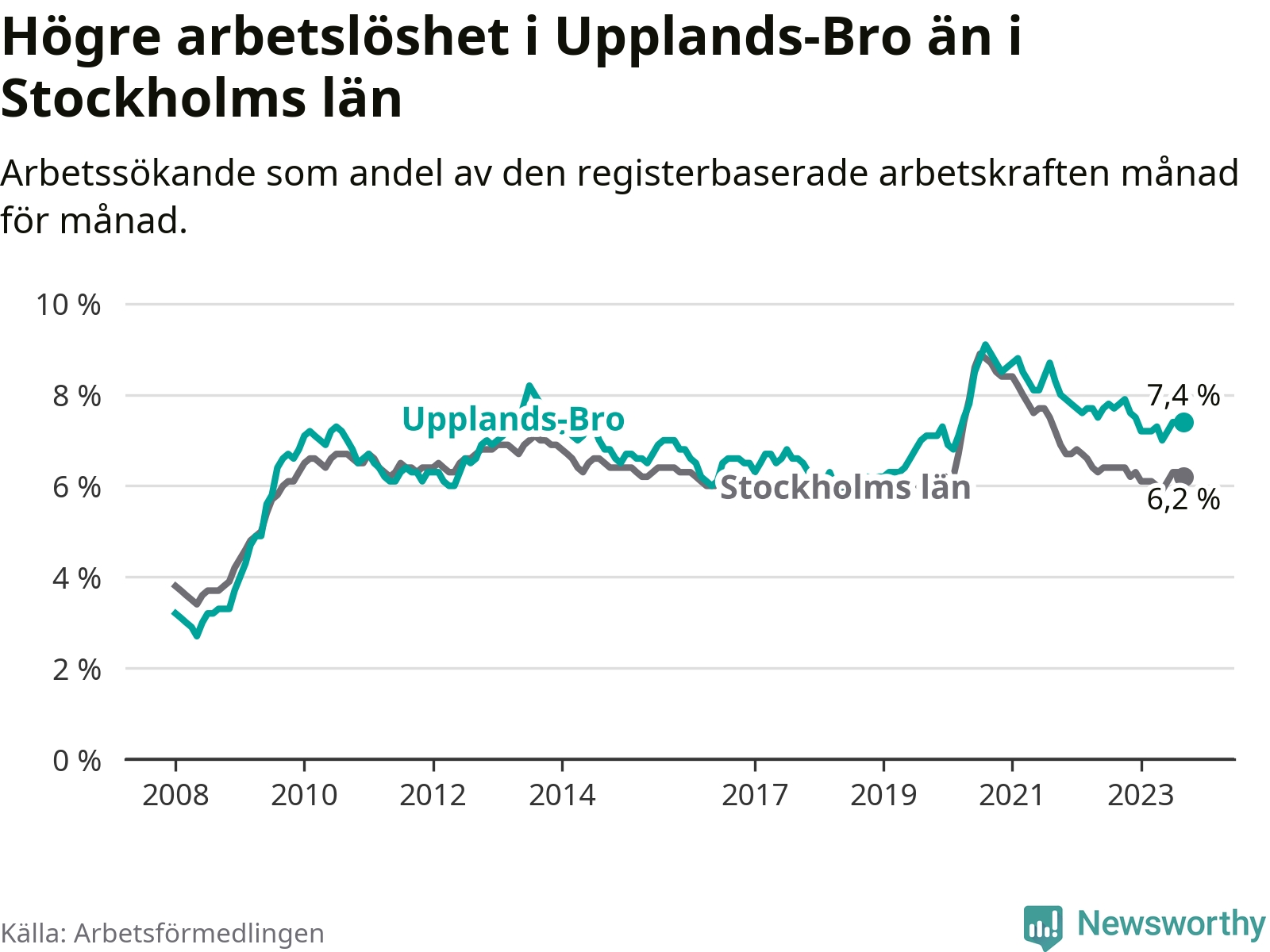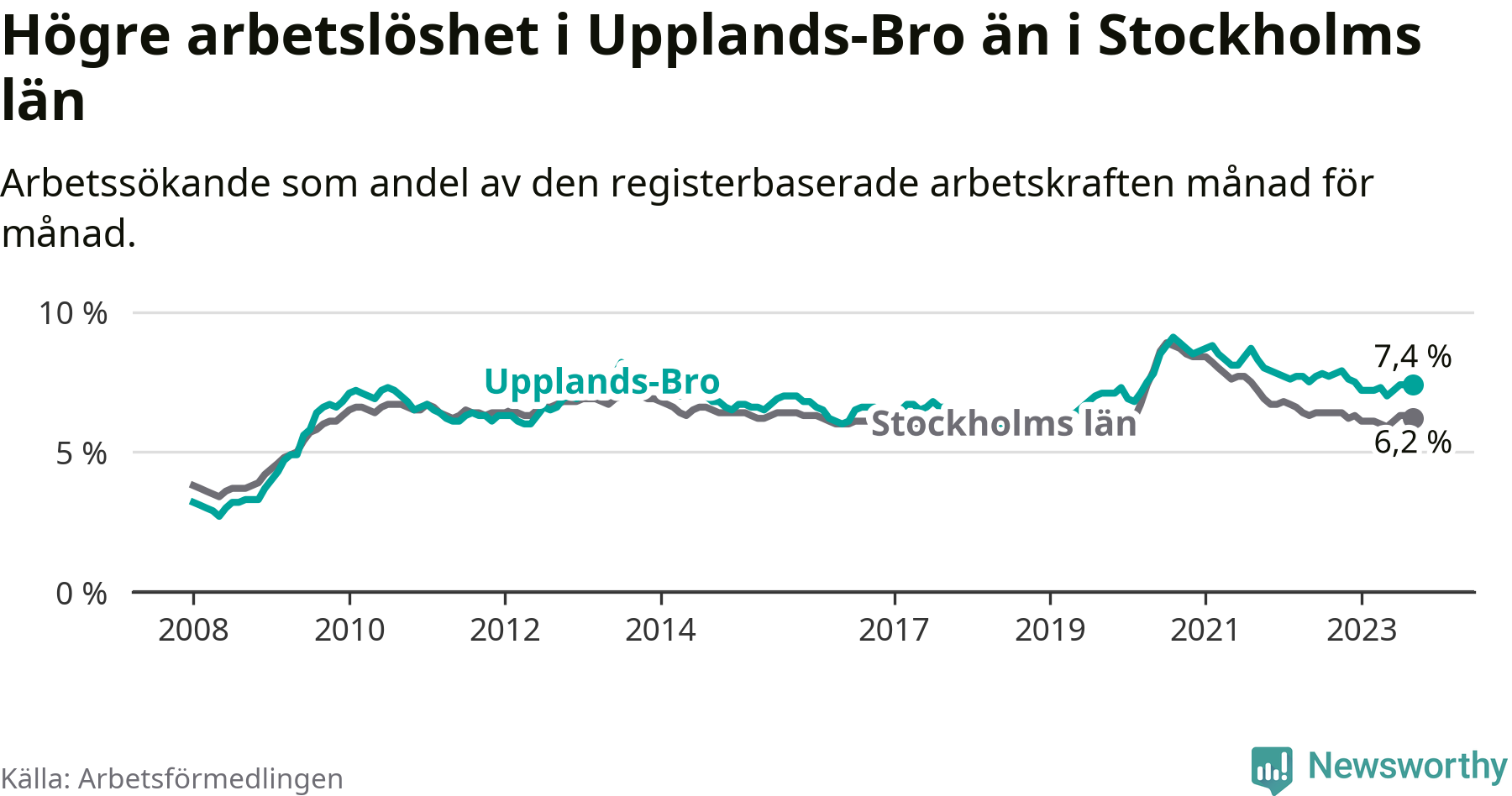 Även om arbetslösheten i Upplands-Bro alltså minskar, så ligger den fortfarande över snittet i hela Stockholms län (7,4 procent i kommunen, jämfört med 6,2 procent i hela länet). Vaxholm har den lägsta arbetslösheten i länet (3,1 procent), medan Botkyrka har den högsta (10,5 procent). För att Upplands-Bro skulle komma ner i samma arbetslöshetsnivå som Vaxholm skulle 695 personer behöva sysselsättas.