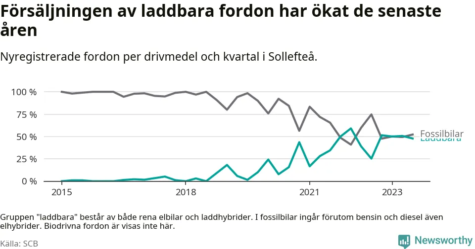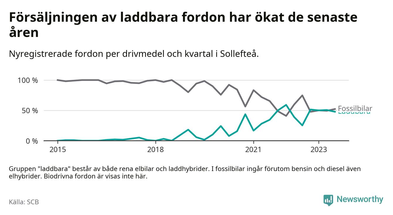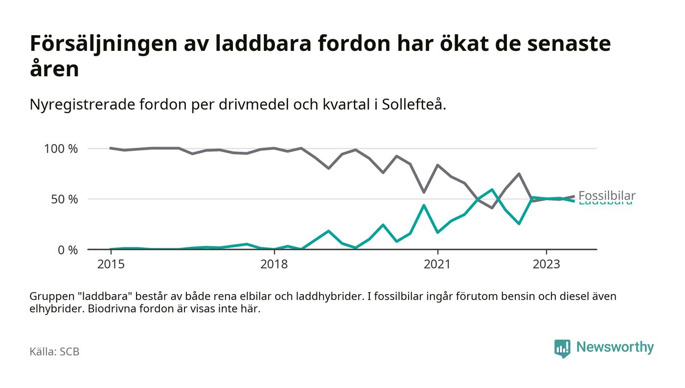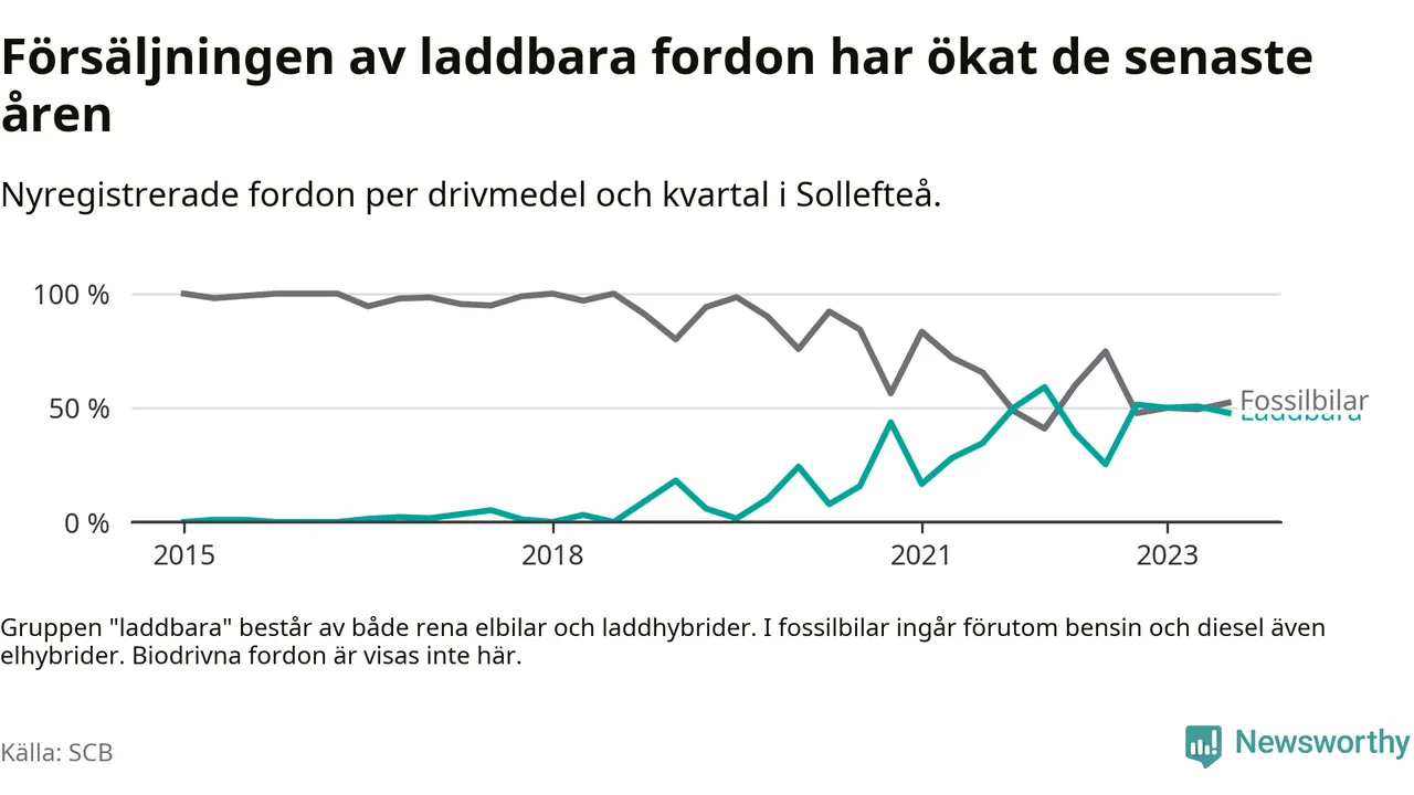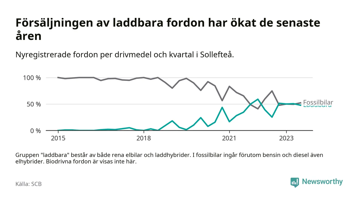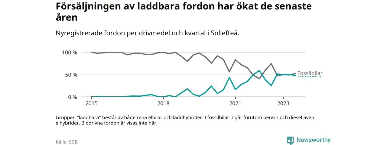 I Sollefteå var andelen laddbara bilar under tredje kvartalet också lägre än under första kvartalet 2022 då rekordet hittills noterades (59 procent).