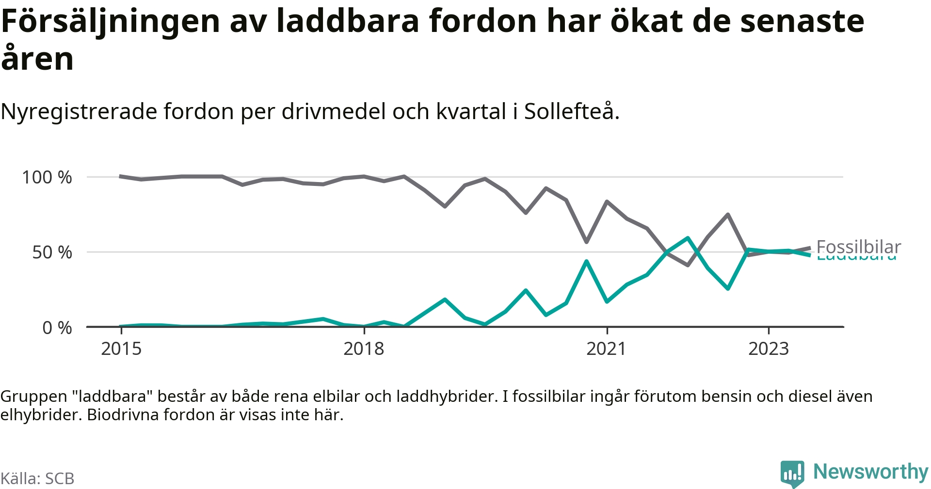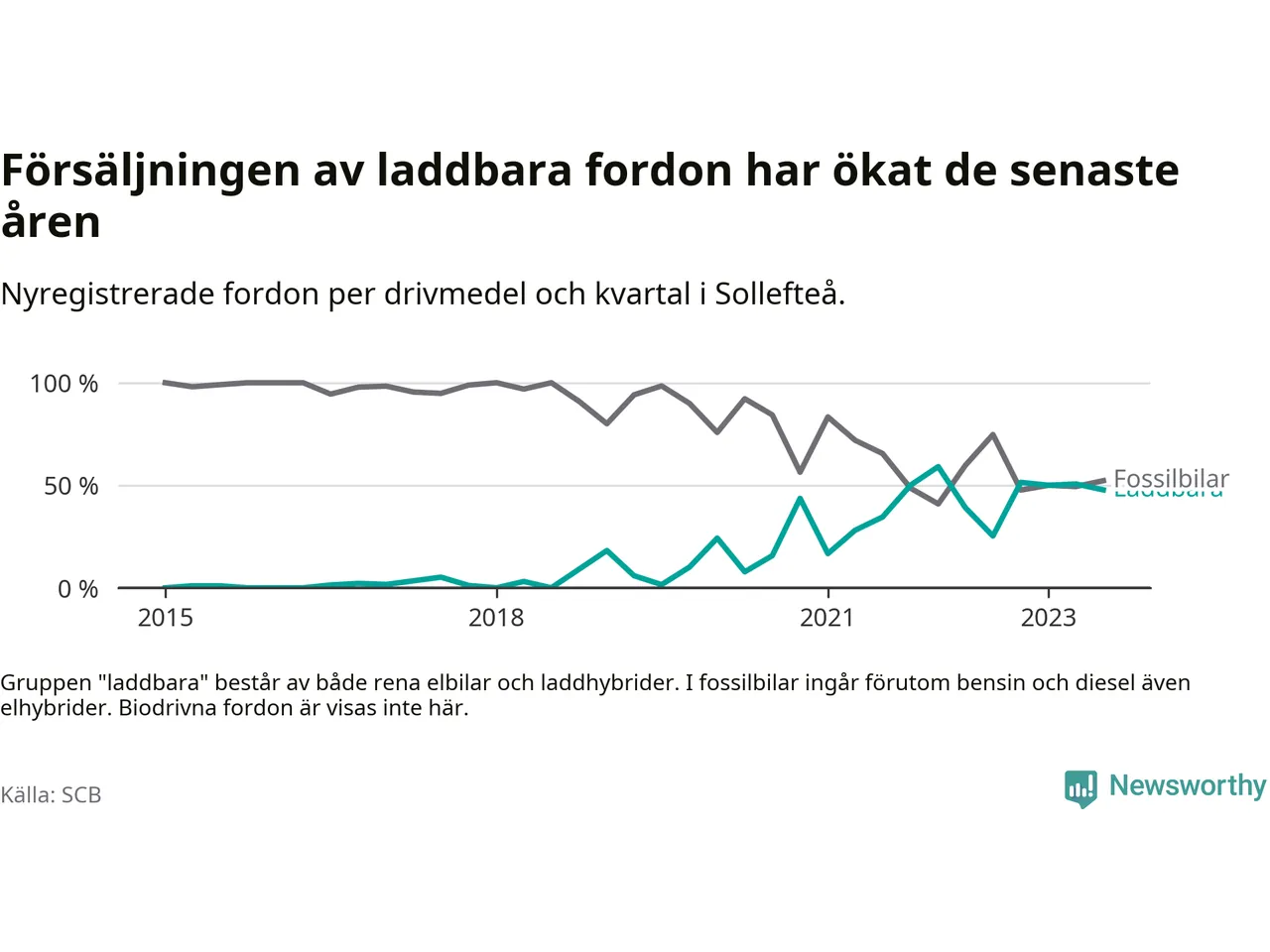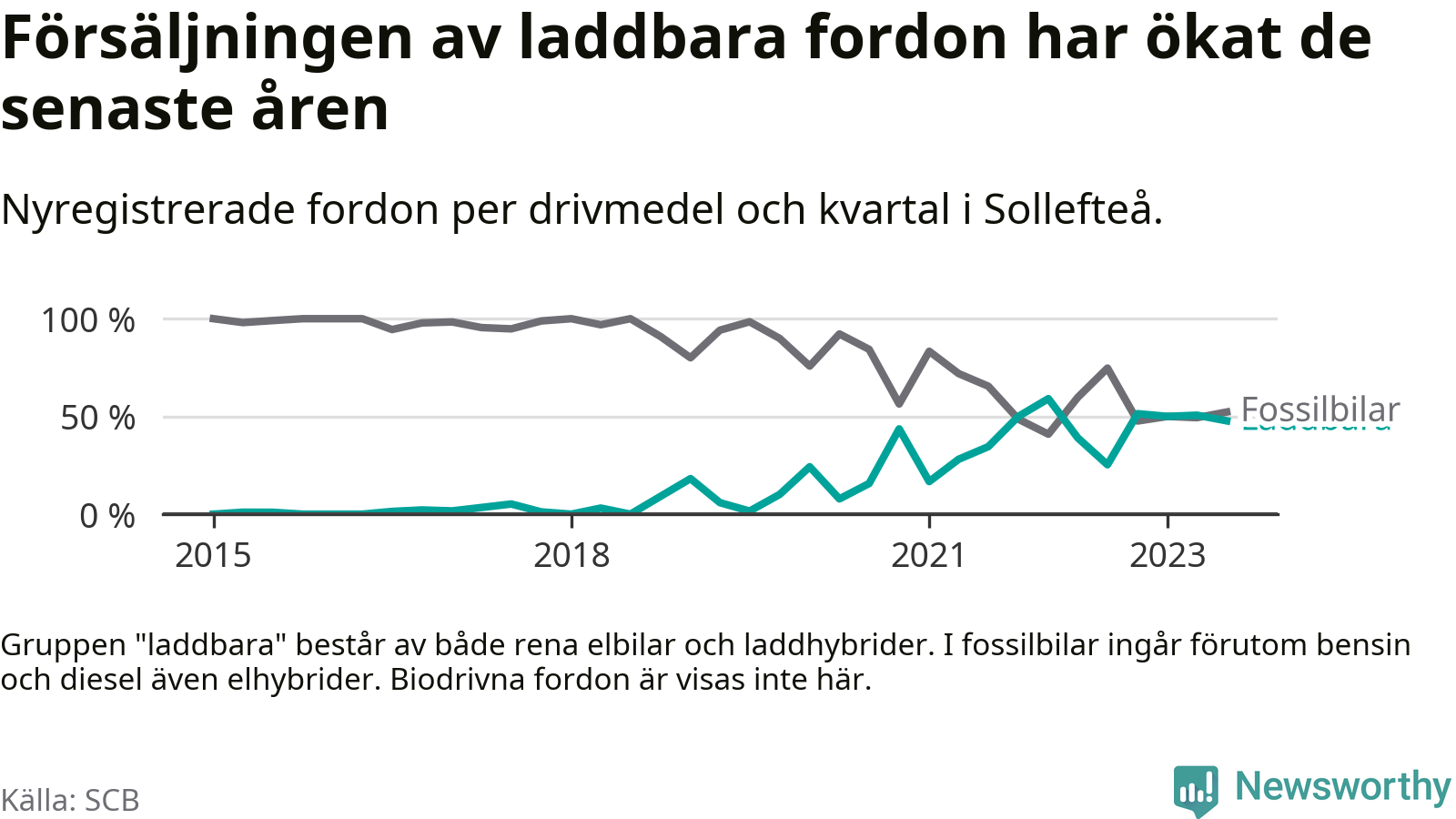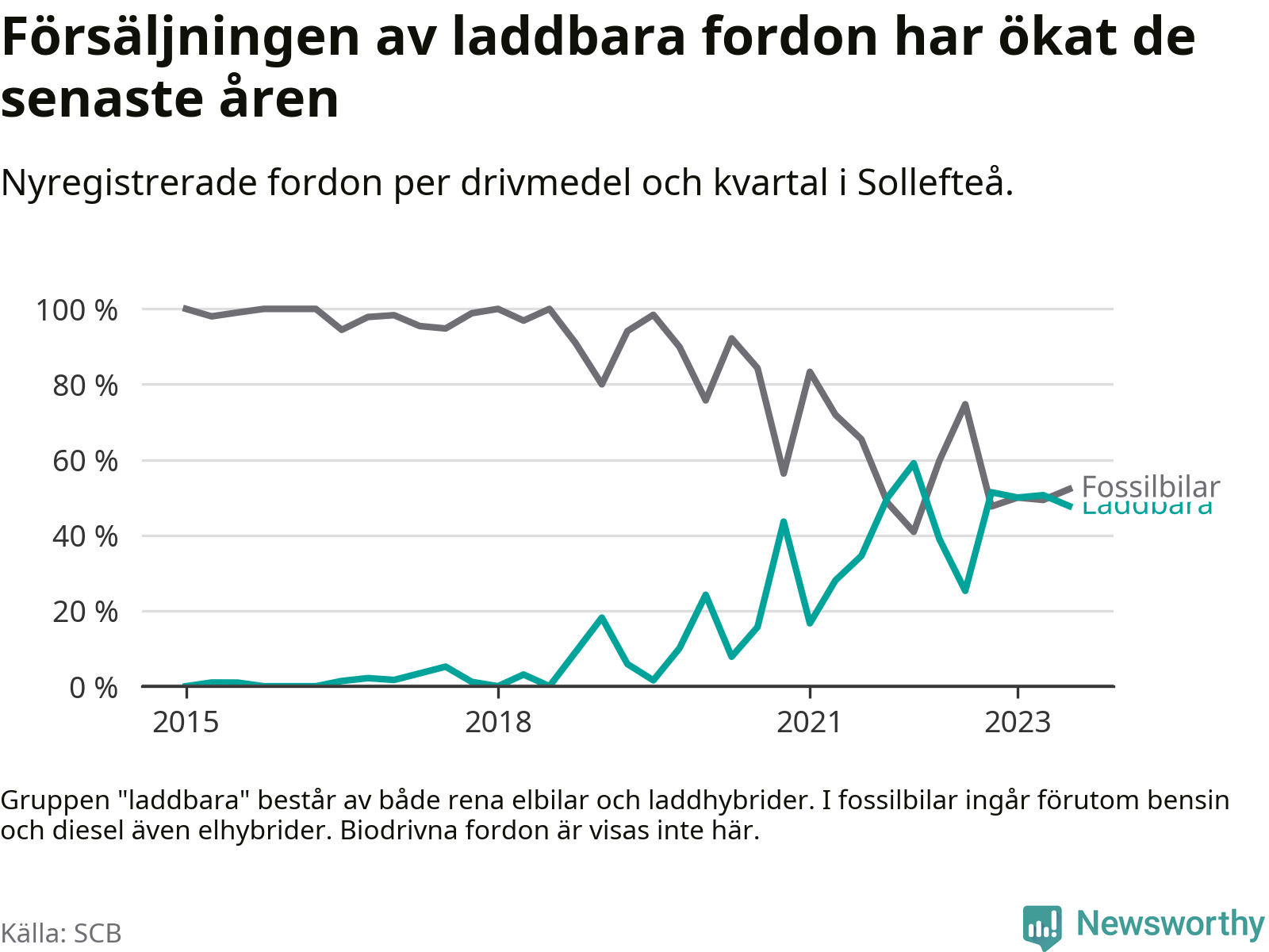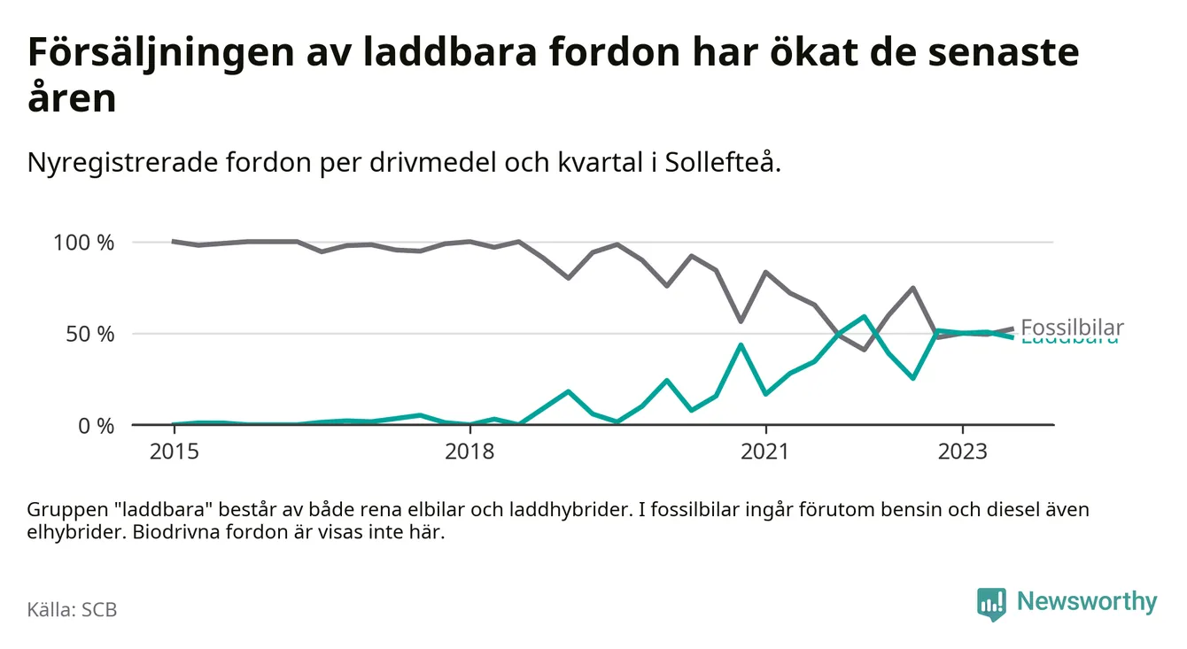 I Sollefteå var andelen laddbara bilar under tredje kvartalet också lägre än under första kvartalet 2022 då rekordet hittills noterades (59 procent).