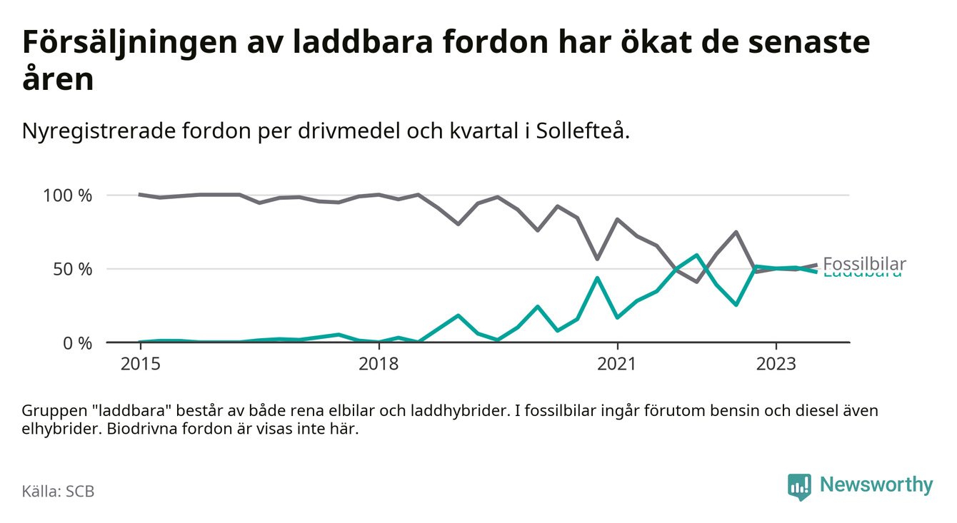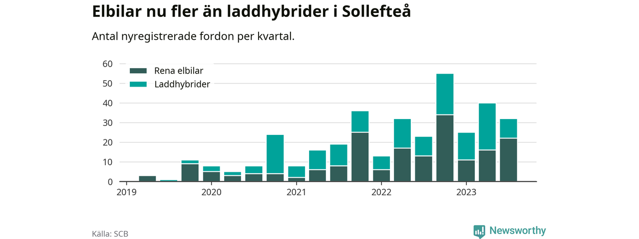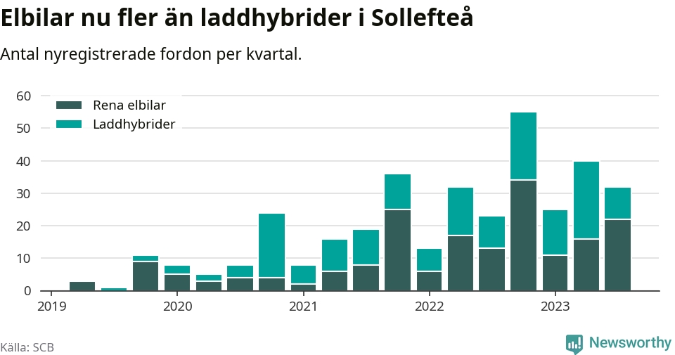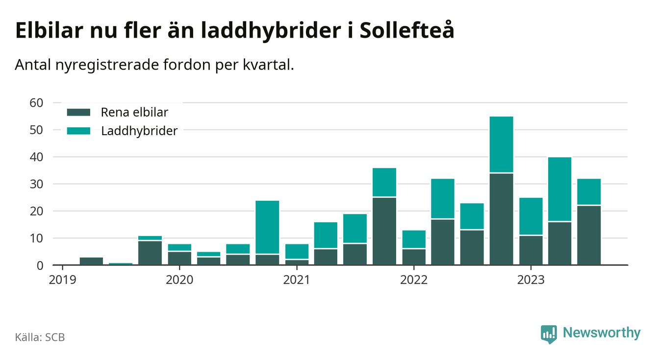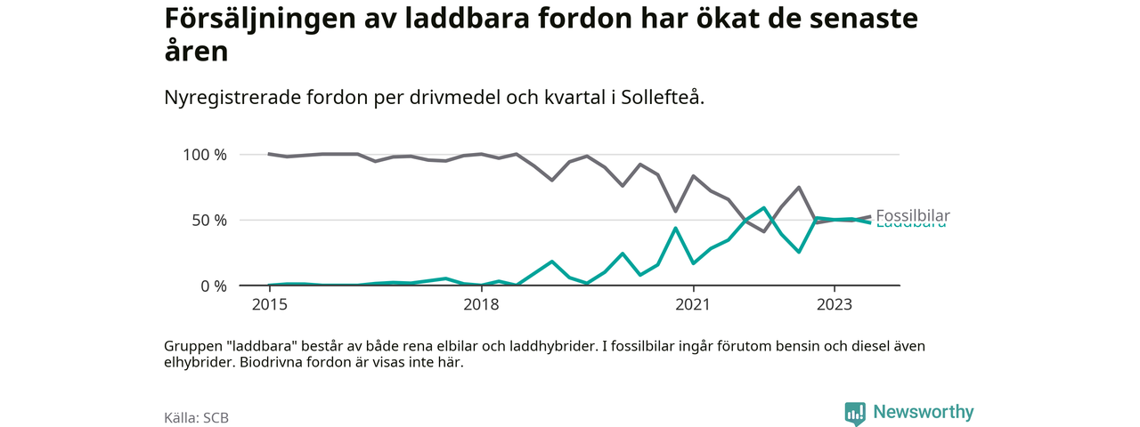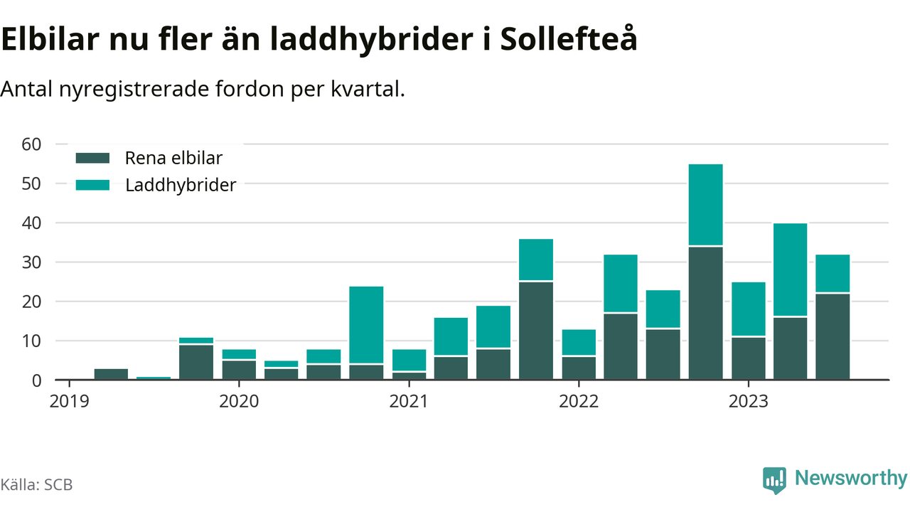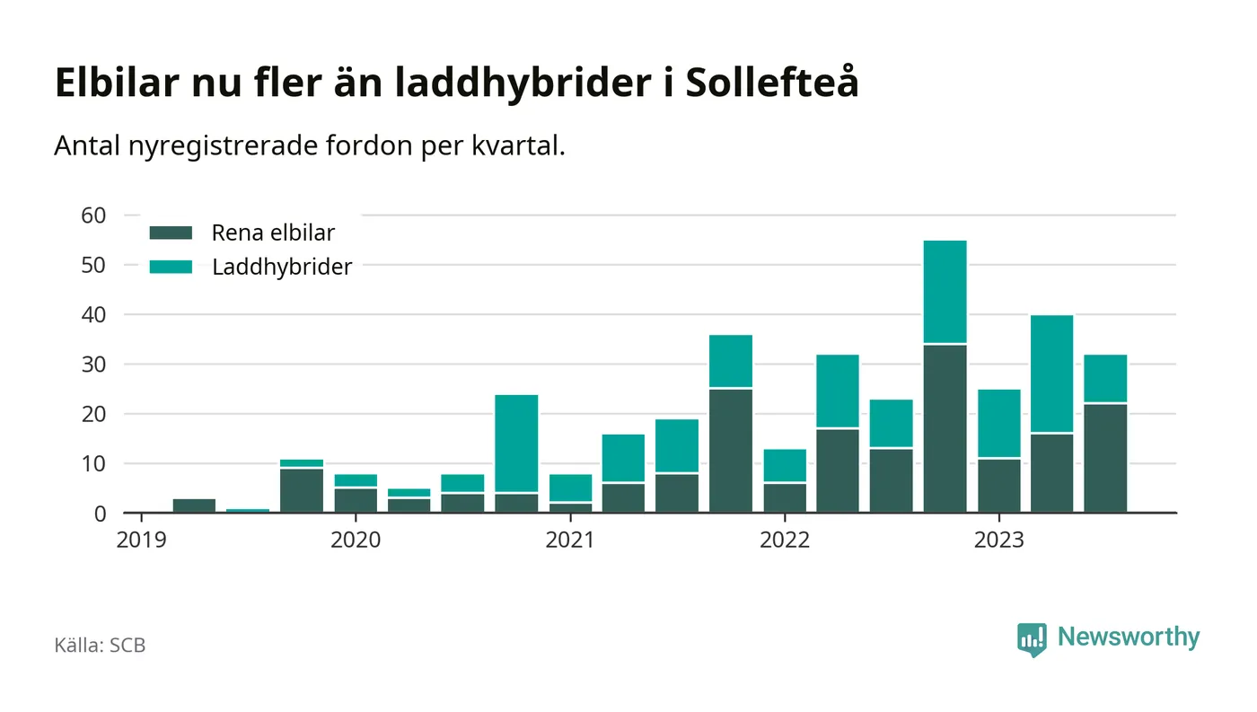 Under tredje kvartalet 2023 var 48 procent av alla nyregistrerade personbilar i Sollefteå laddbara (sammanlagt registrerades 67 nya bilar). Merparten av de laddbara bilarna var rena elbilar (33 procent av alla).