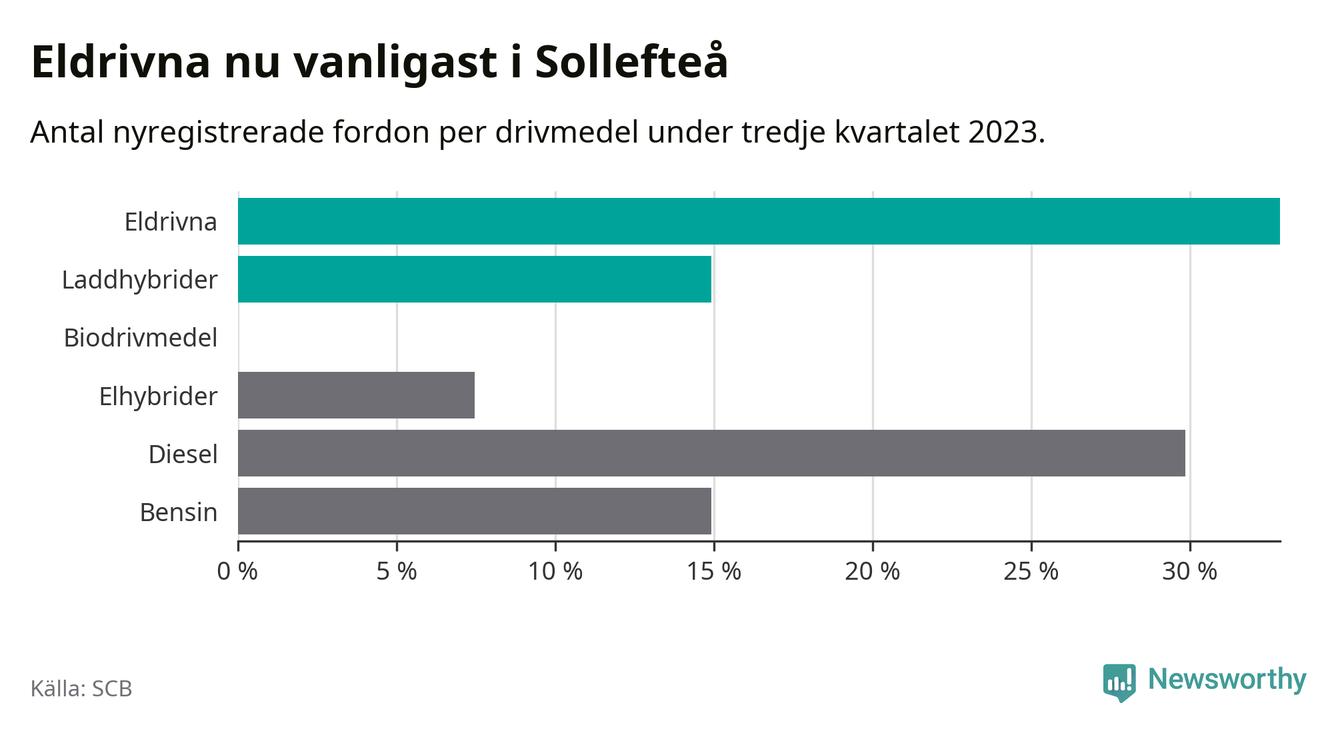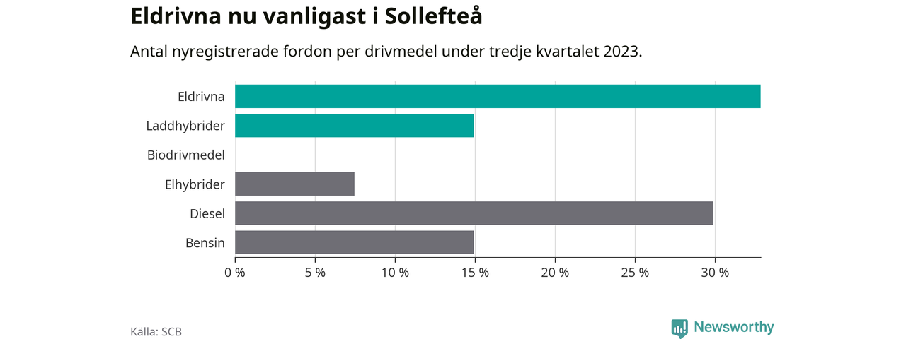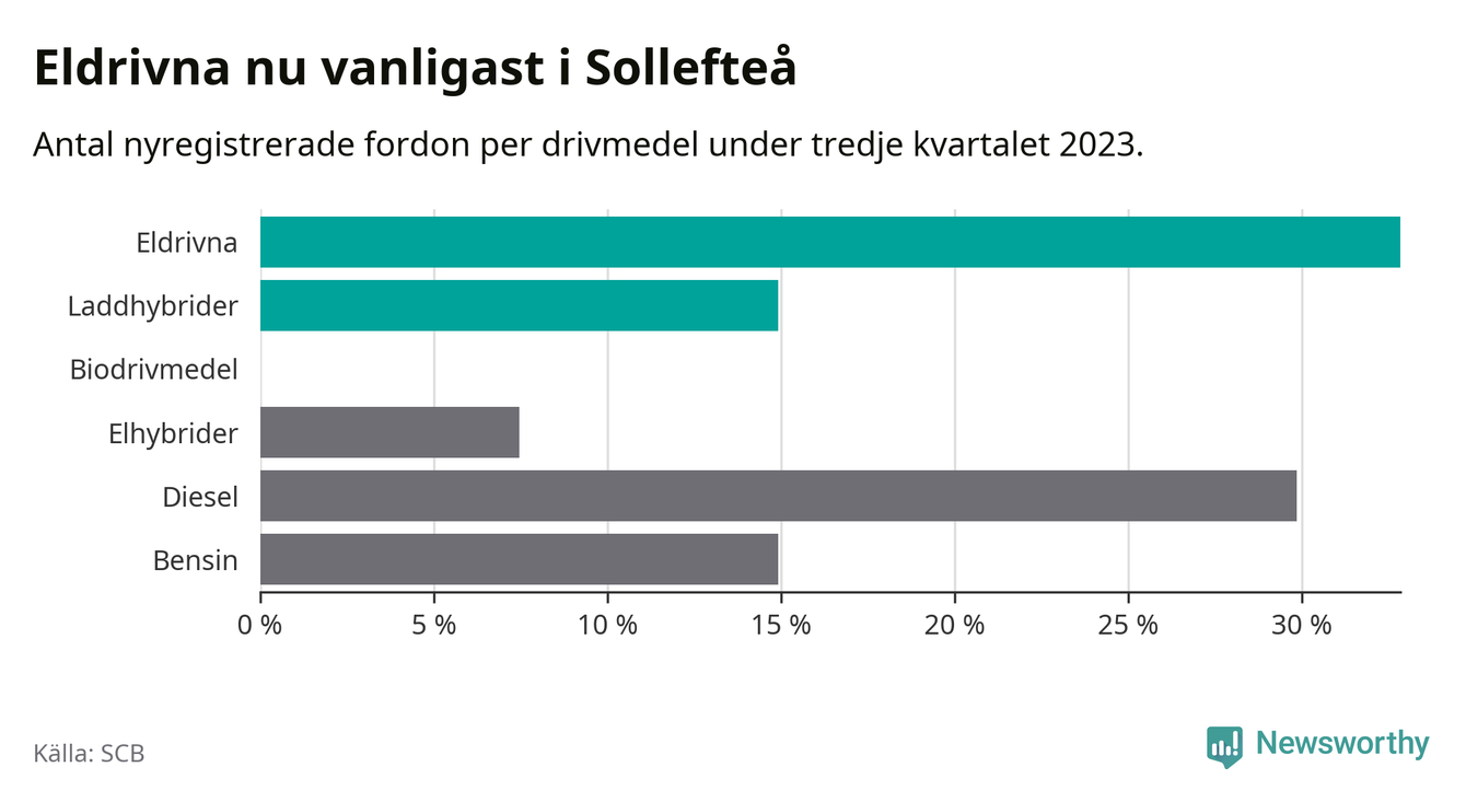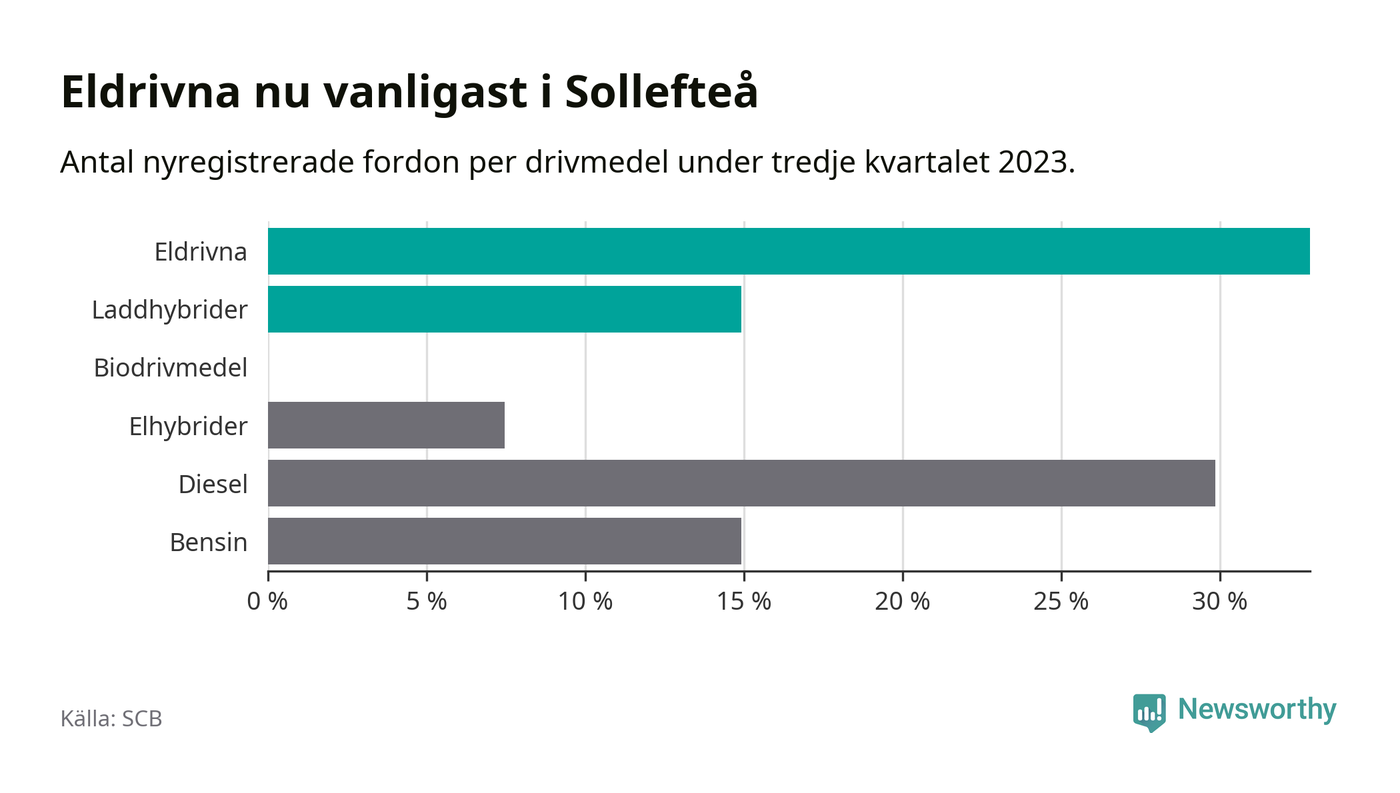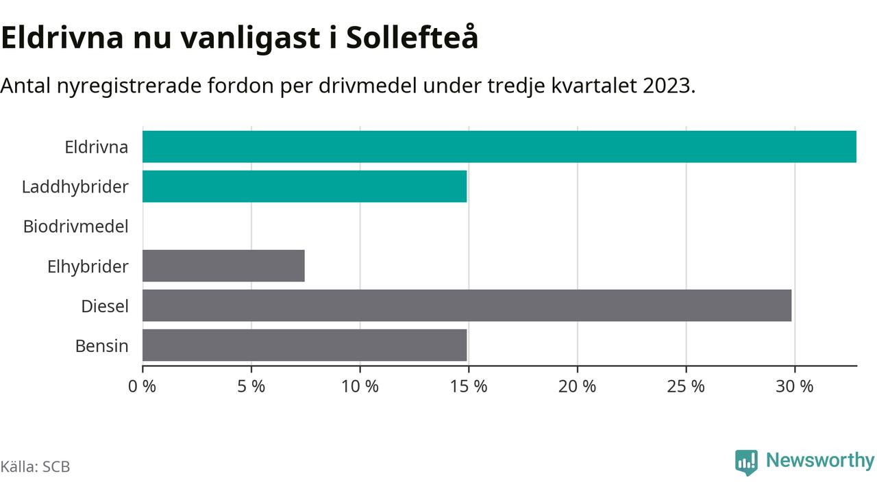 Under tredje kvartalet 2023 var 48 procent av alla nyregistrerade personbilar i Sollefteå laddbara (sammanlagt registrerades 67 nya bilar). Merparten av de laddbara bilarna var rena elbilar (33 procent av alla).