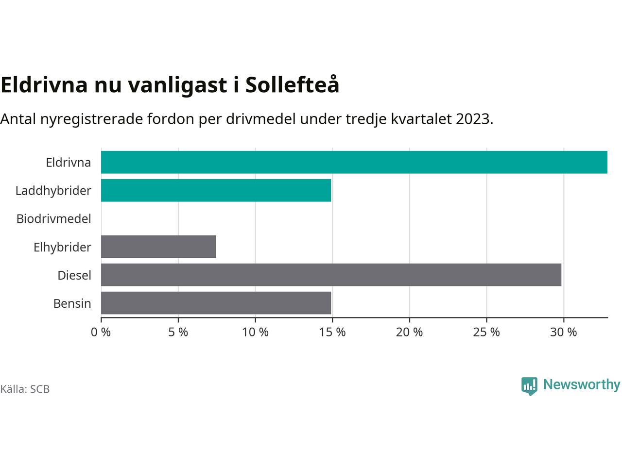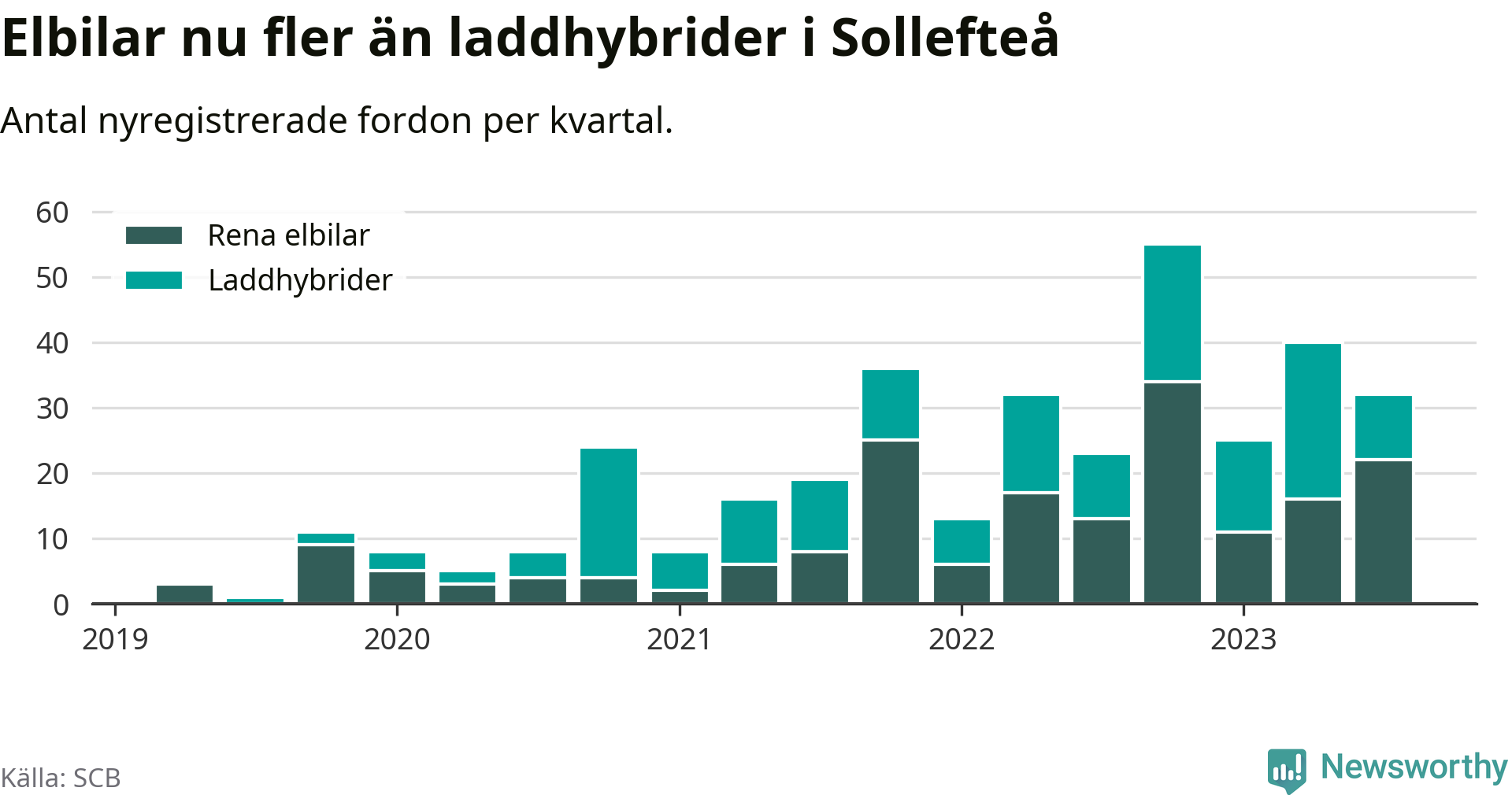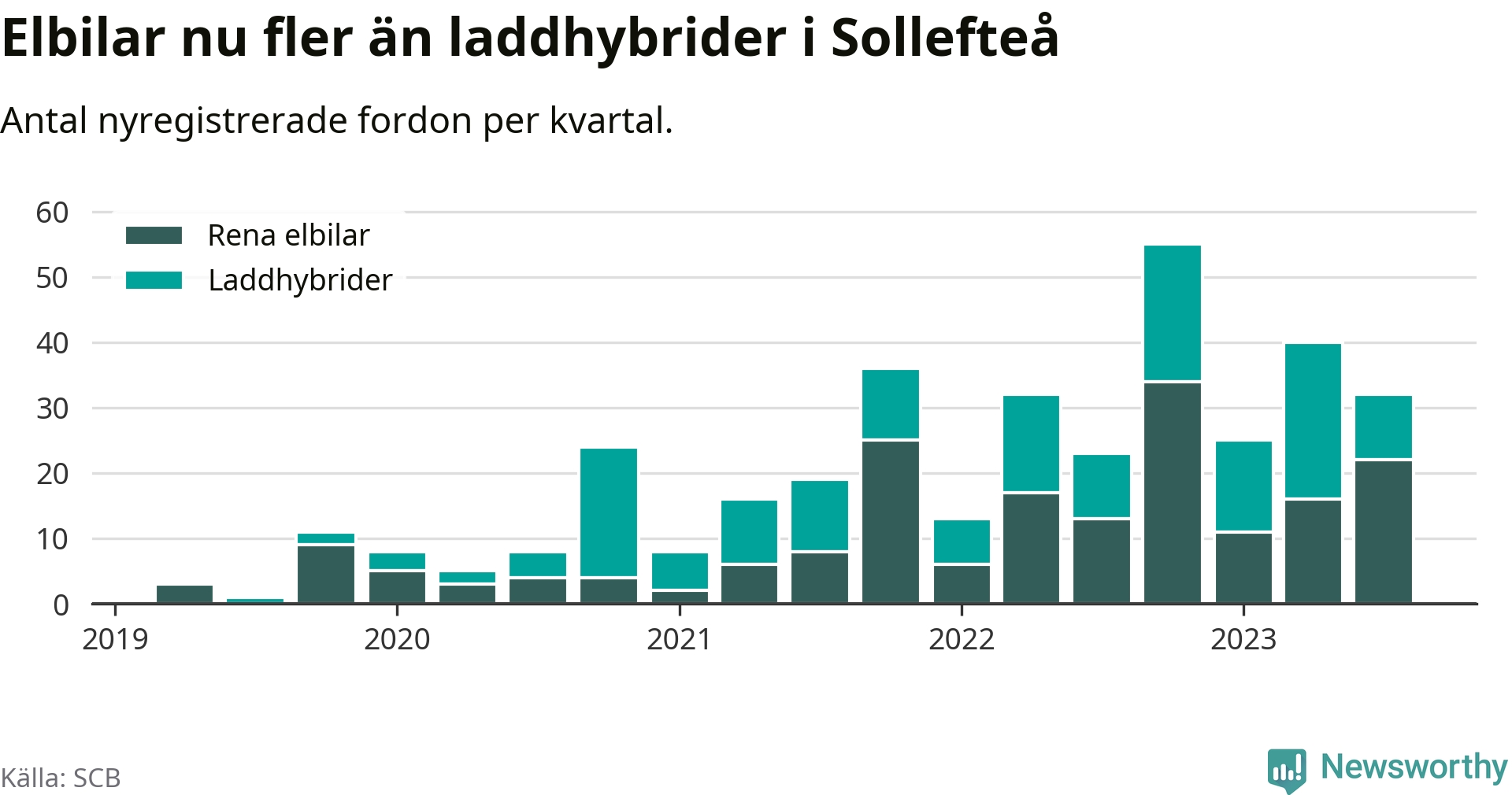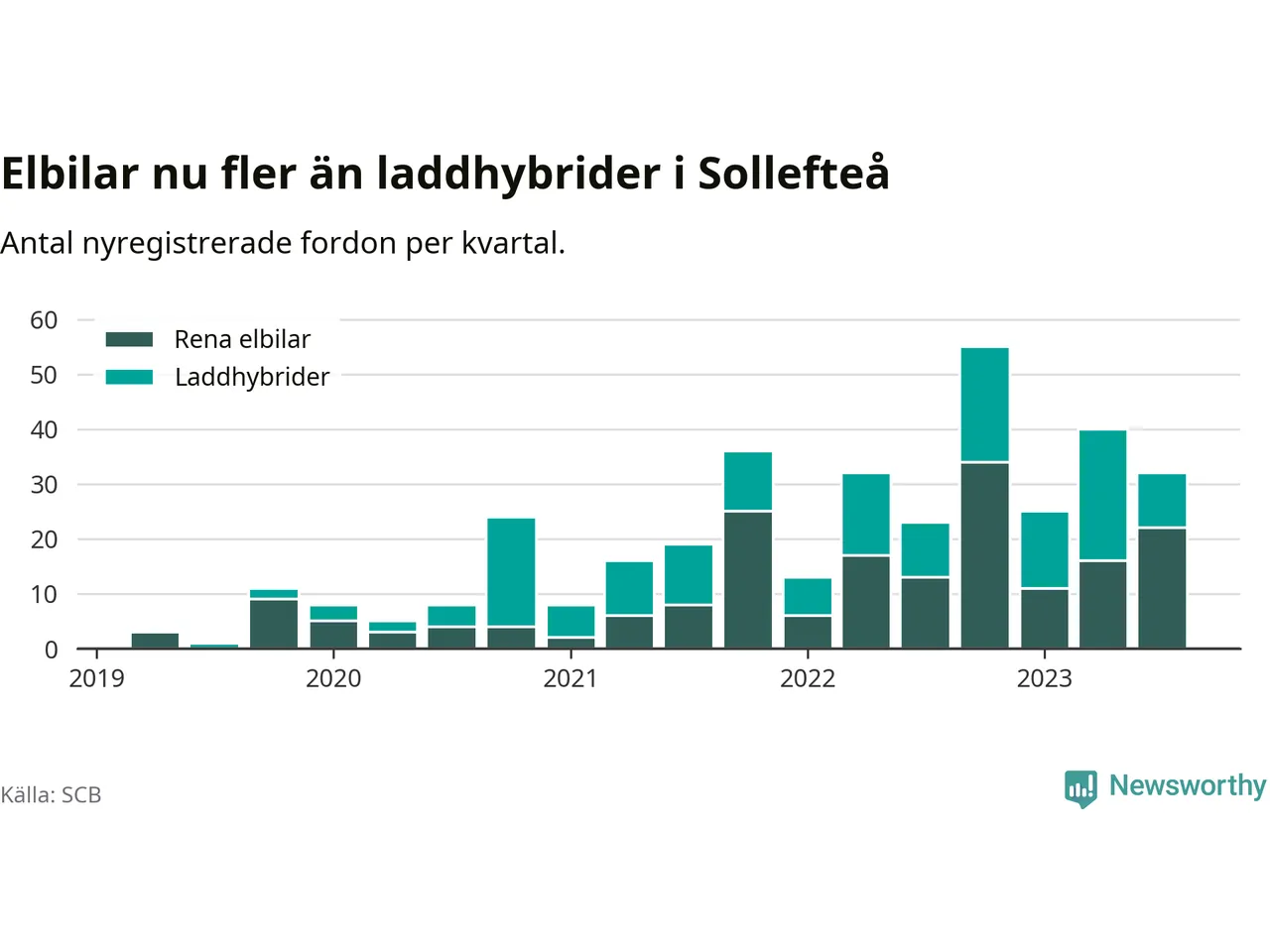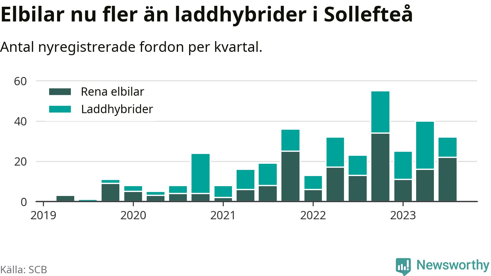 Under tredje kvartalet 2023 var 48 procent av alla nyregistrerade personbilar i Sollefteå laddbara (sammanlagt registrerades 67 nya bilar). Merparten av de laddbara bilarna var rena elbilar (33 procent av alla).