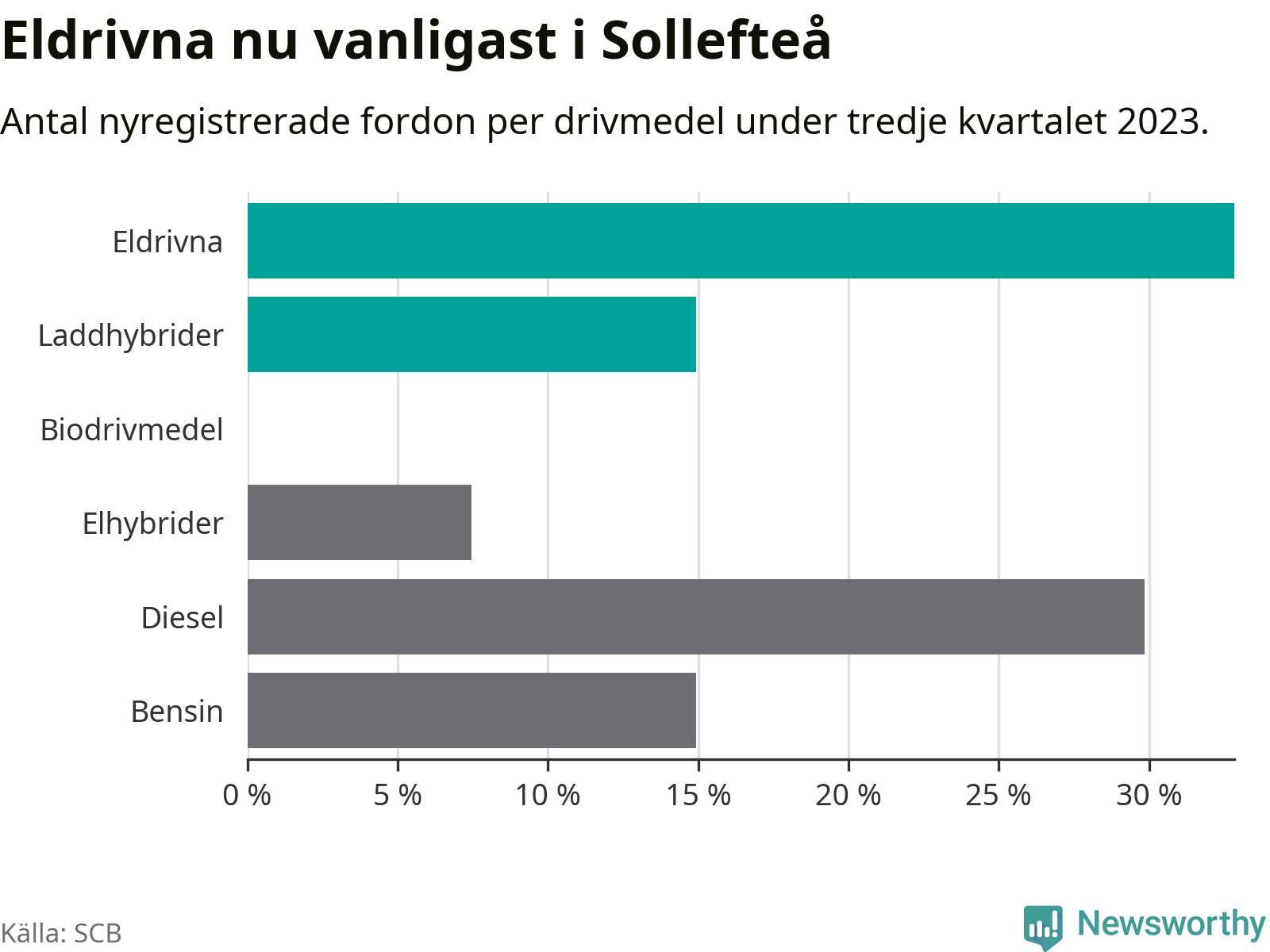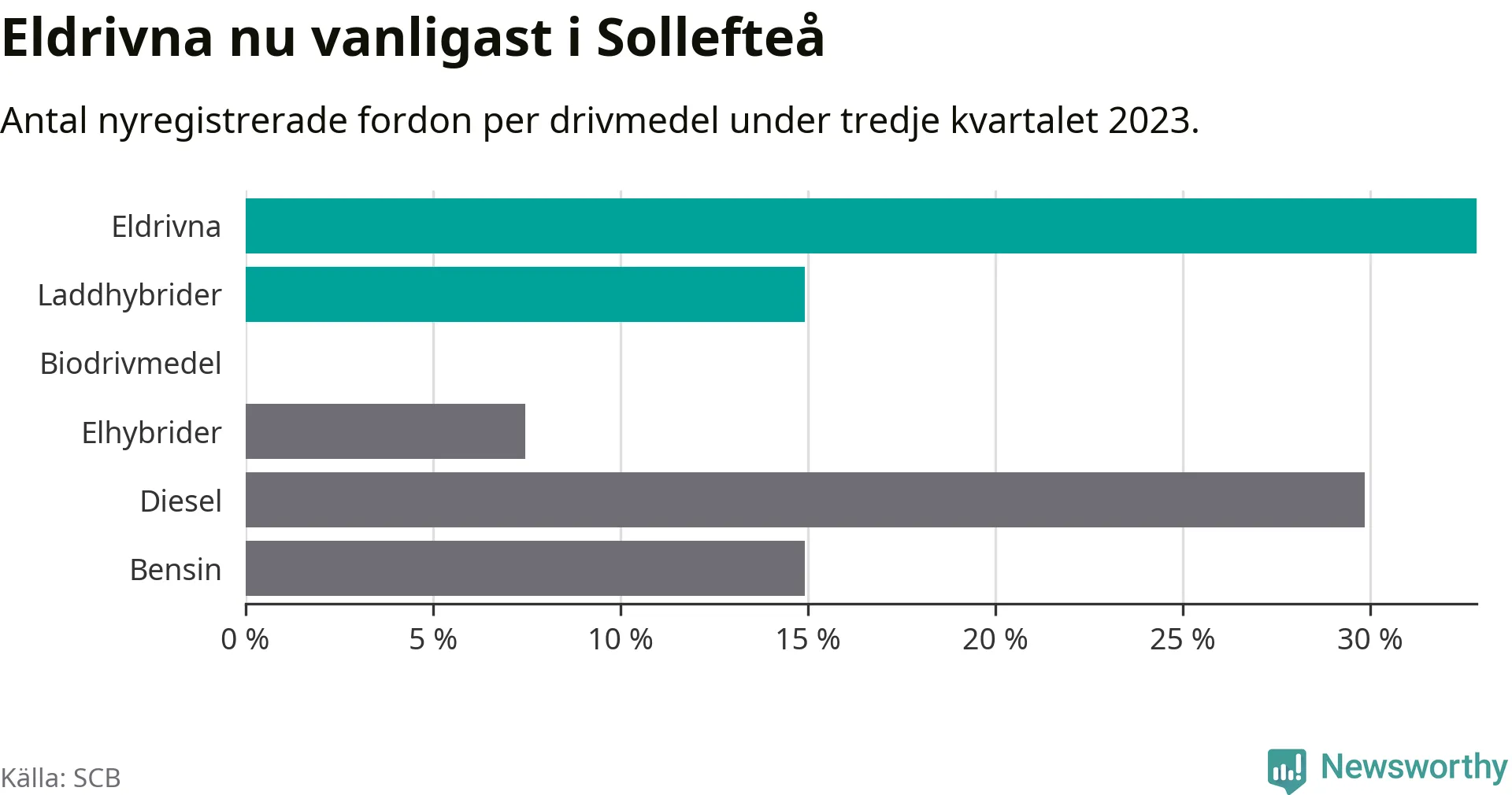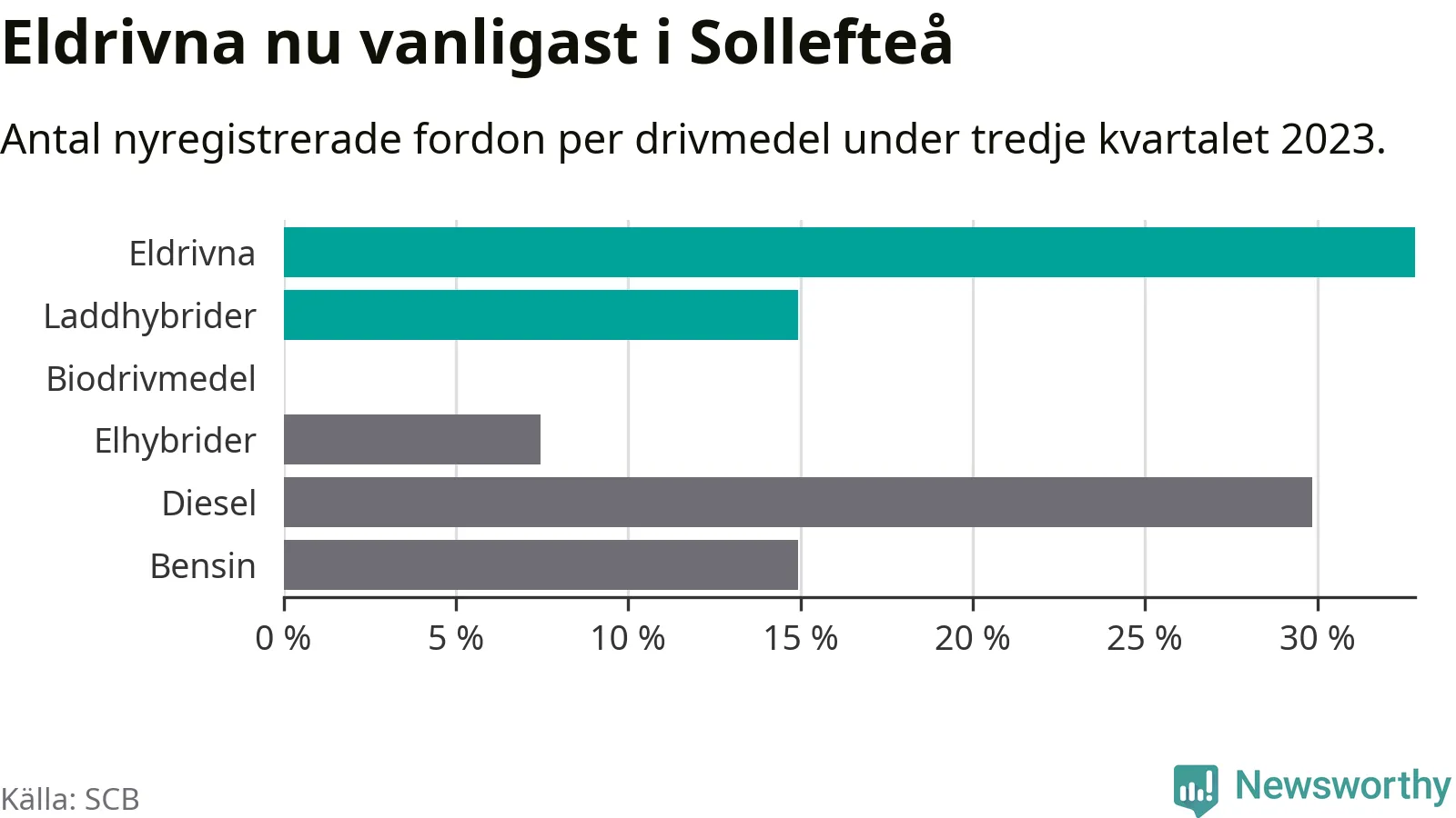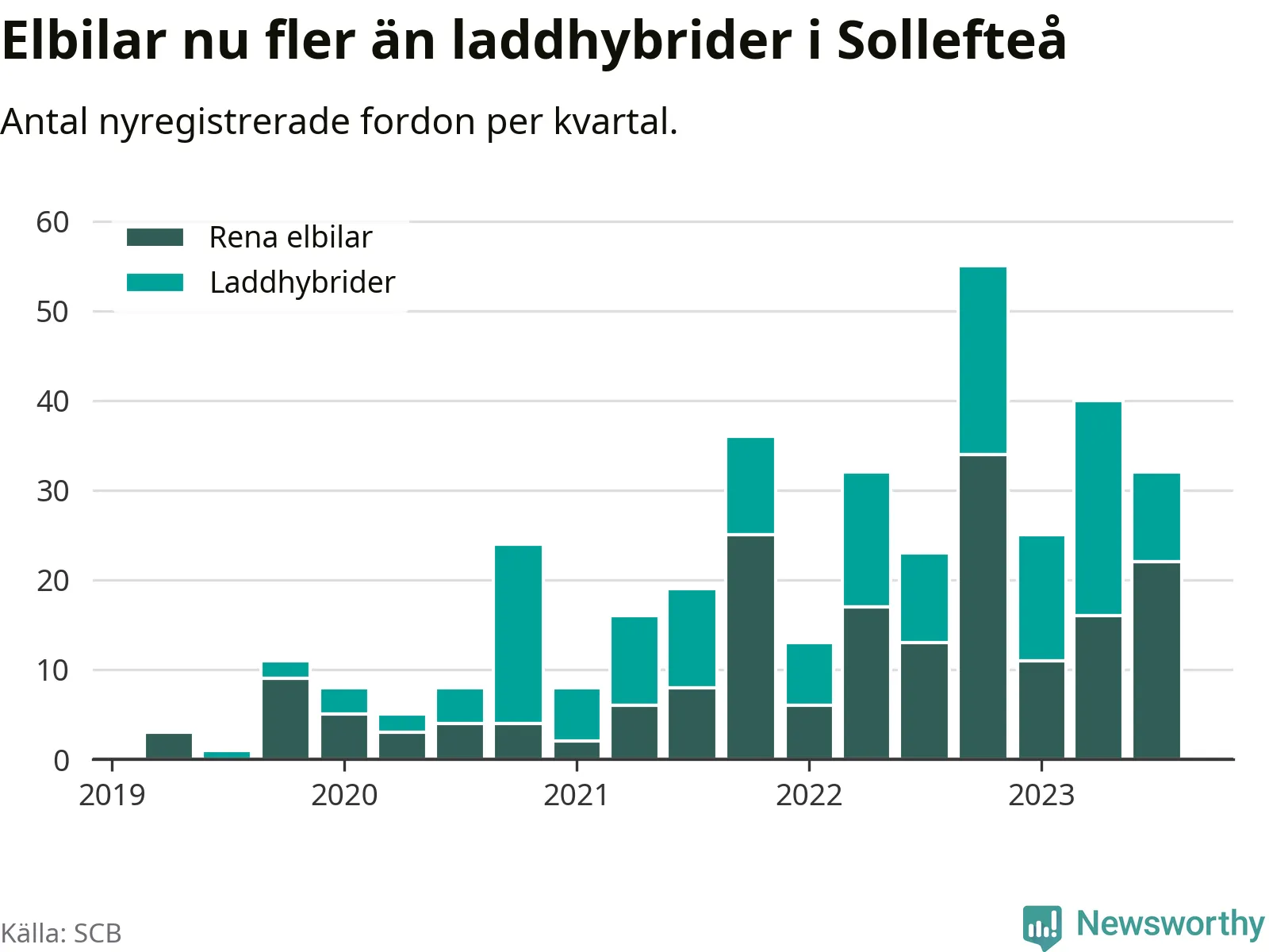 Under tredje kvartalet 2023 var 48 procent av alla nyregistrerade personbilar i Sollefteå laddbara (sammanlagt registrerades 67 nya bilar). Merparten av de laddbara bilarna var rena elbilar (33 procent av alla).