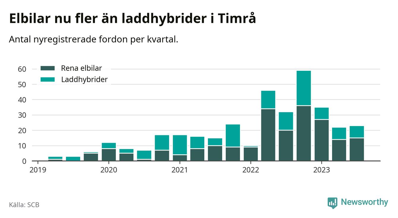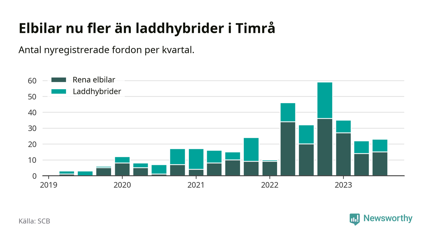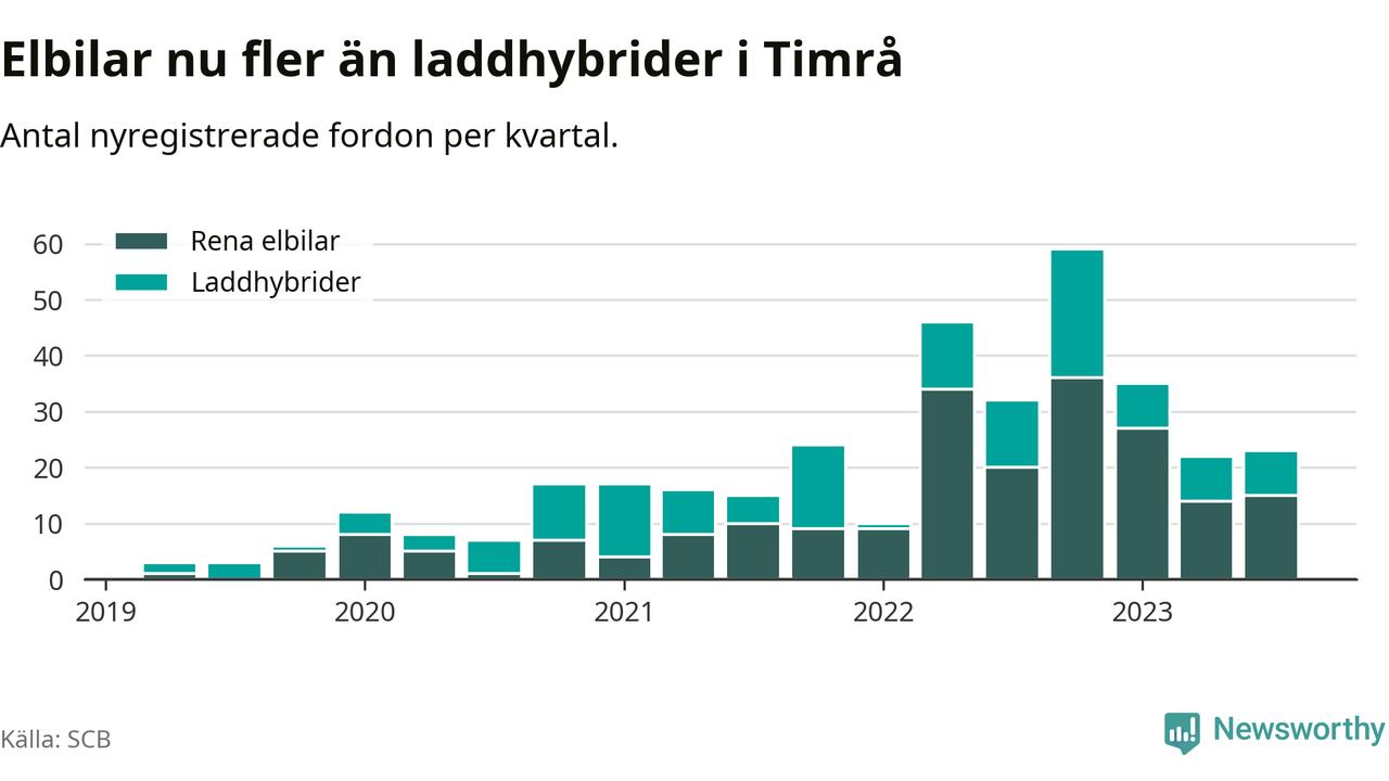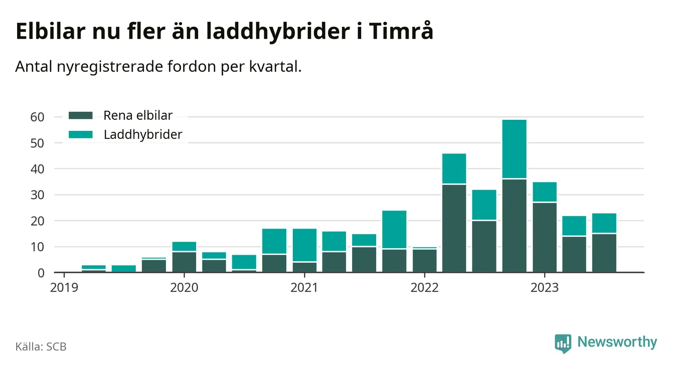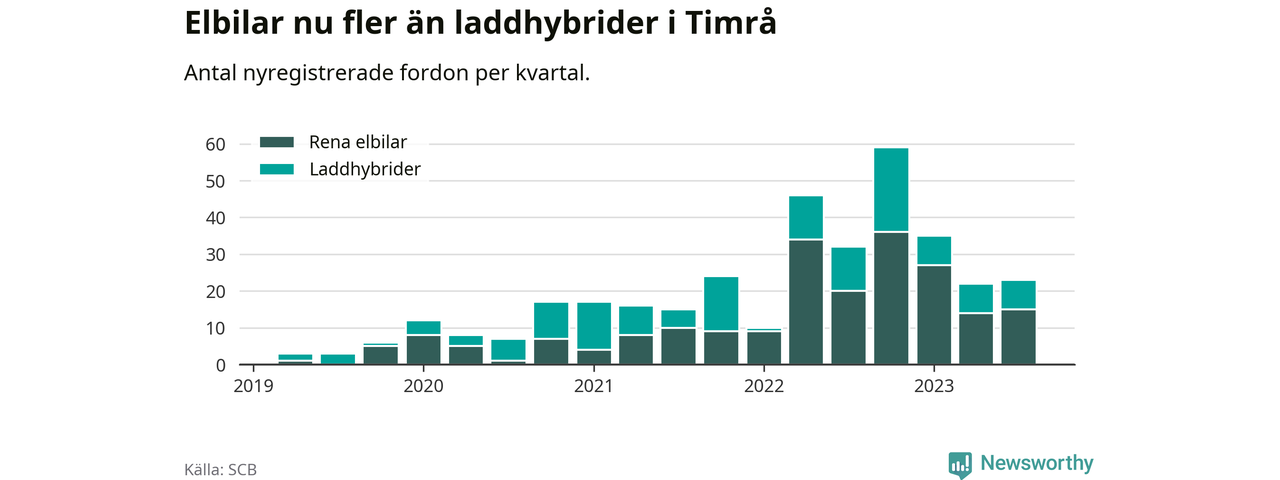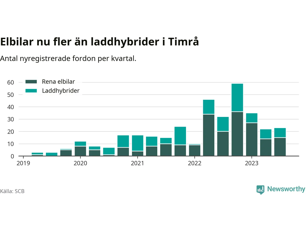 Under tredje kvartalet 2023 var 37 procent av alla nyregistrerade personbilar i Timrå laddbara (sammanlagt registrerades 62 nya bilar). Merparten av de laddbara bilarna var rena elbilar (24 procent av alla).