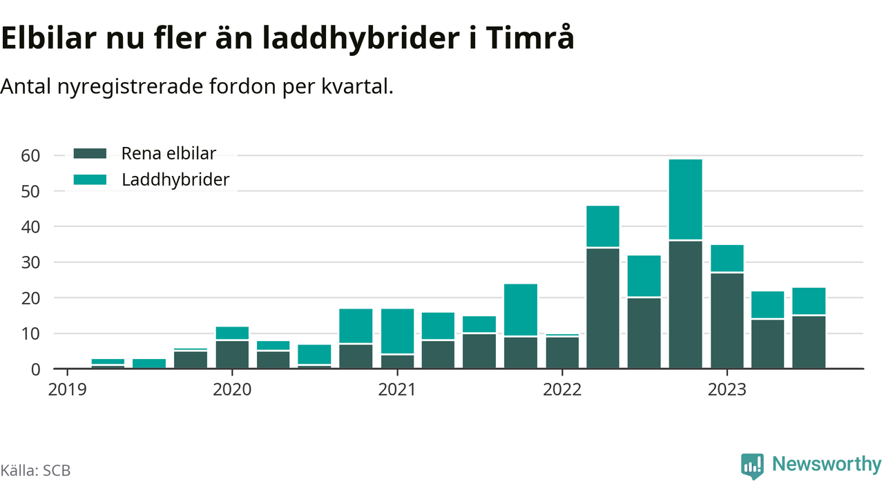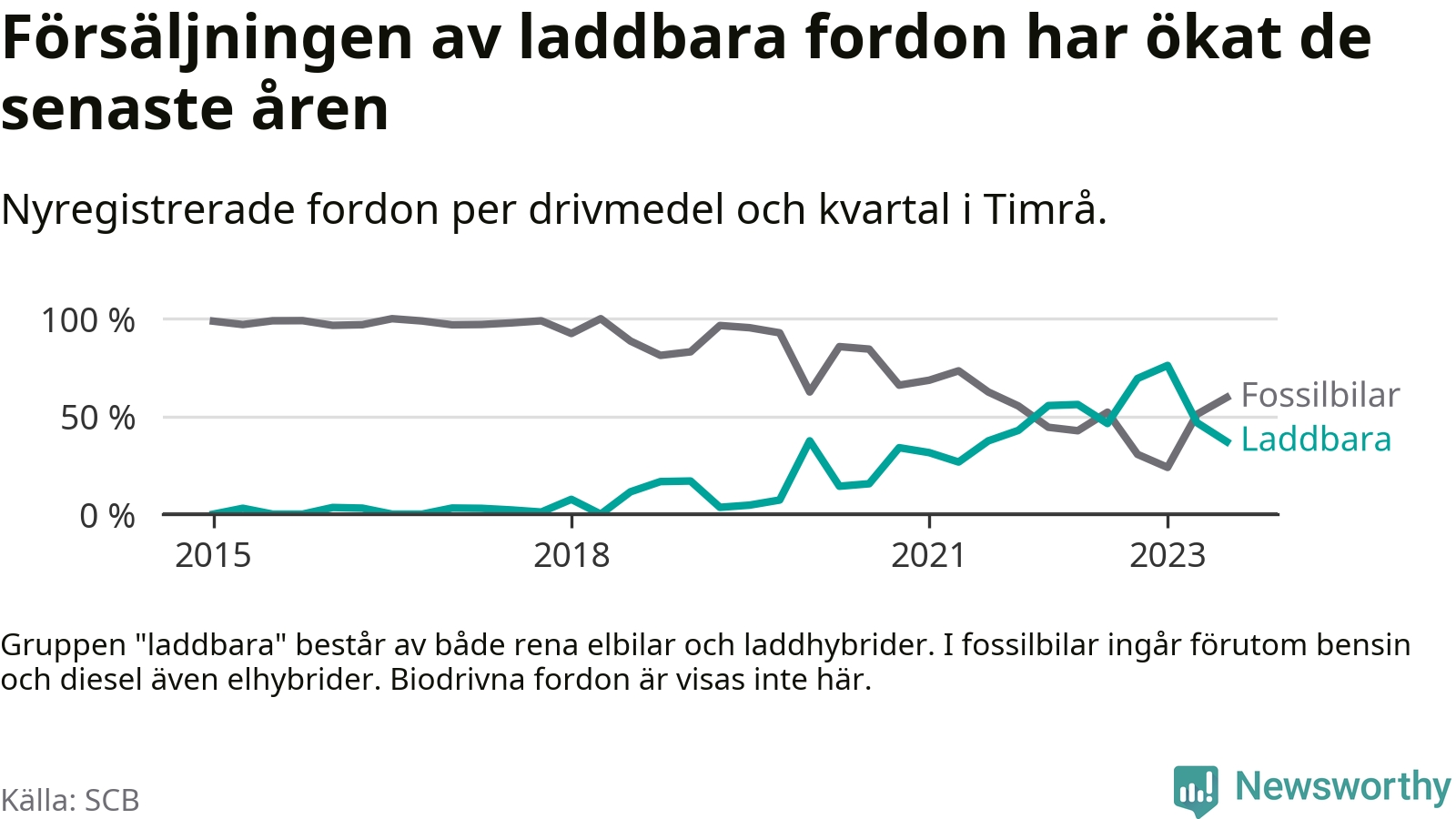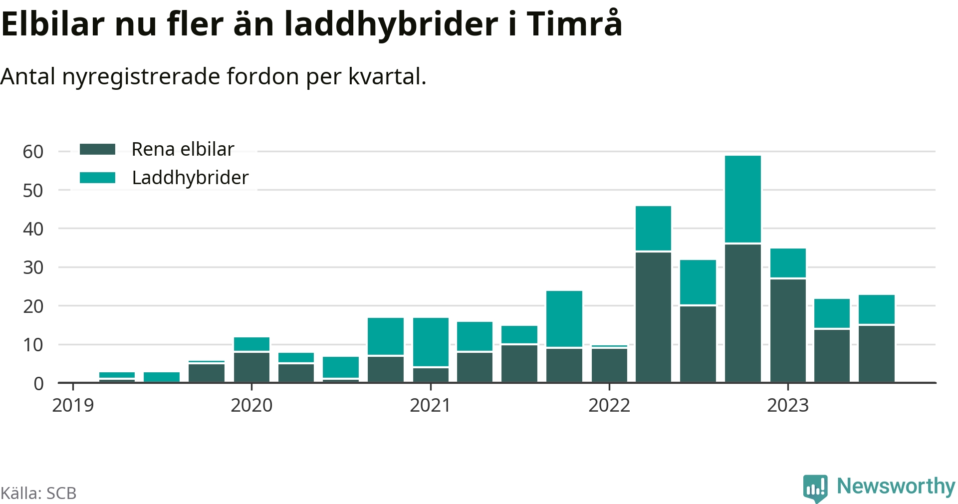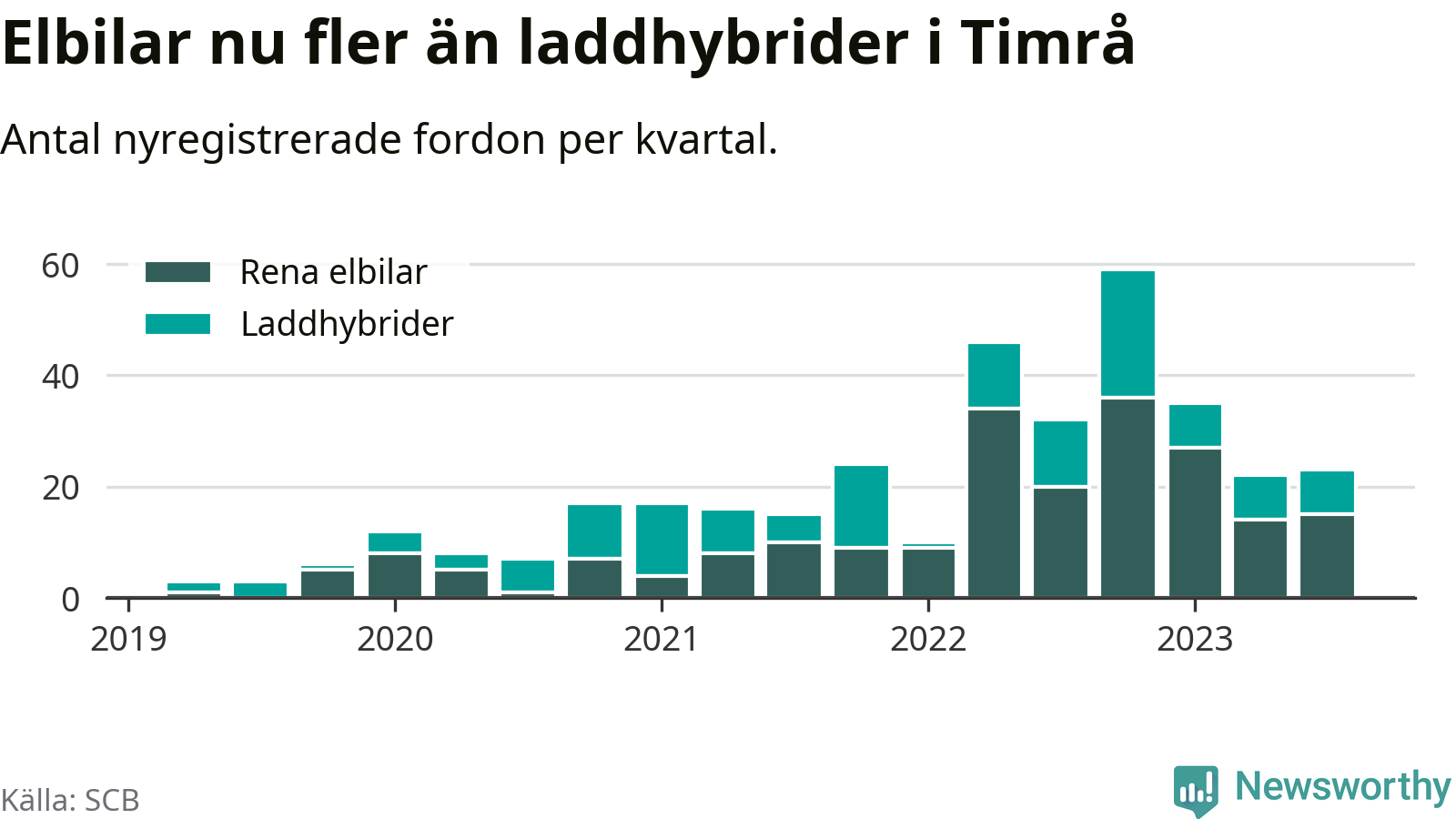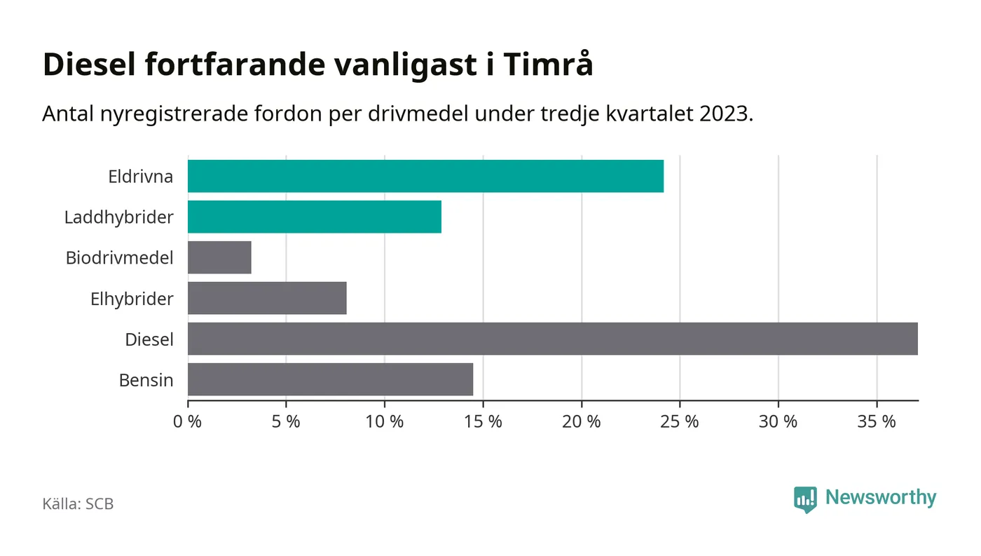 Under tredje kvartalet 2023 var 37 procent av alla nyregistrerade personbilar i Timrå laddbara (sammanlagt registrerades 62 nya bilar). Merparten av de laddbara bilarna var rena elbilar (24 procent av alla).