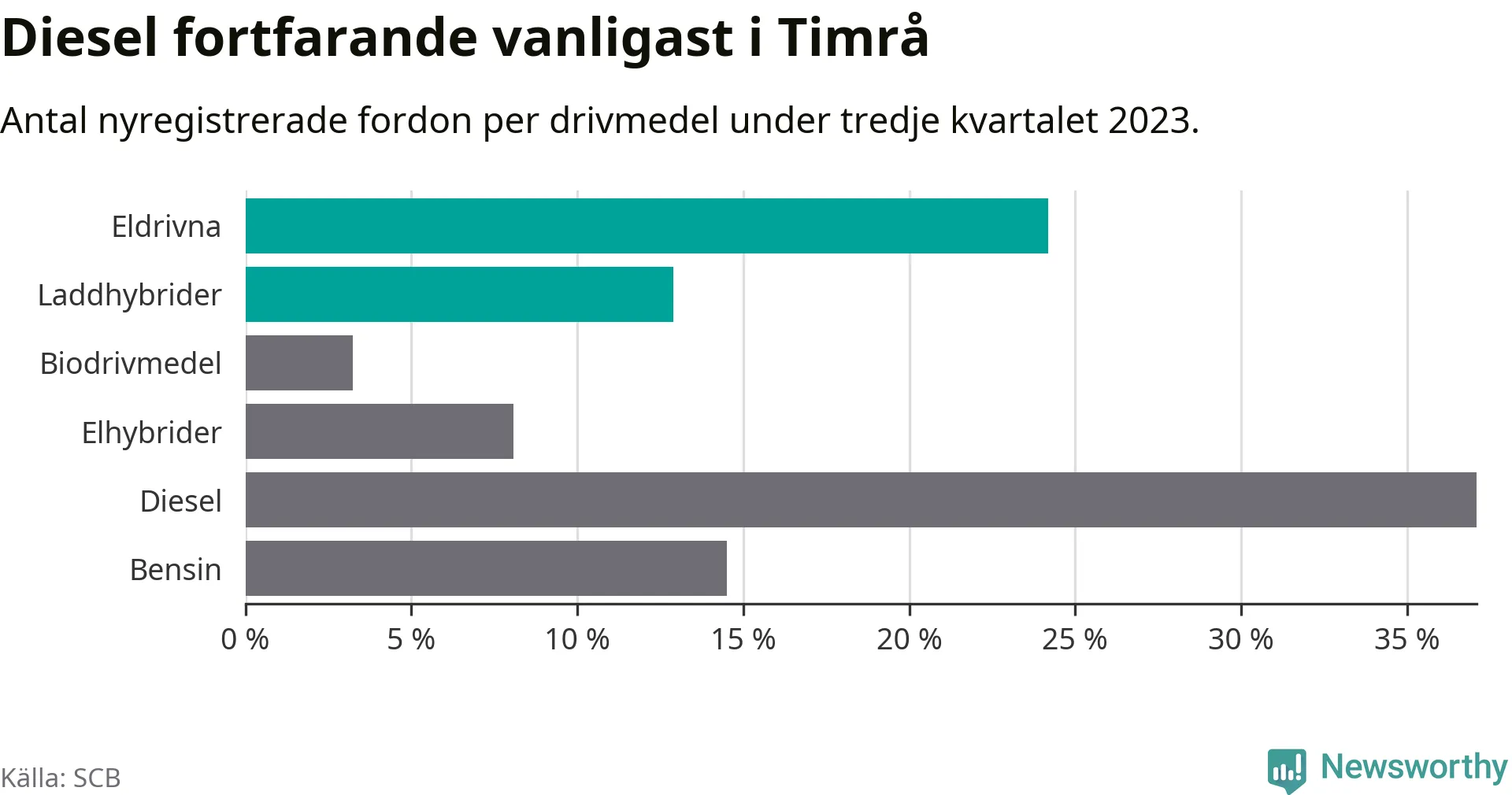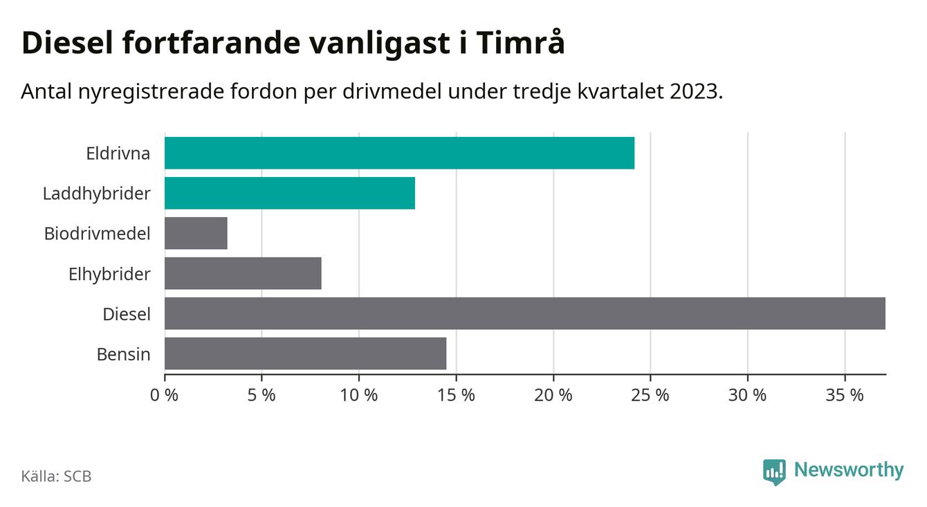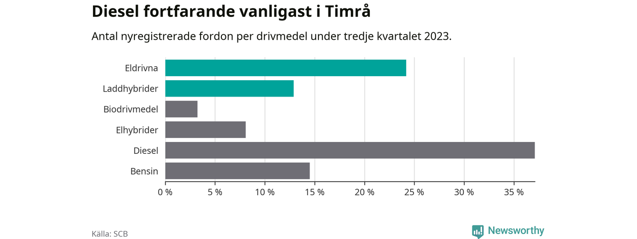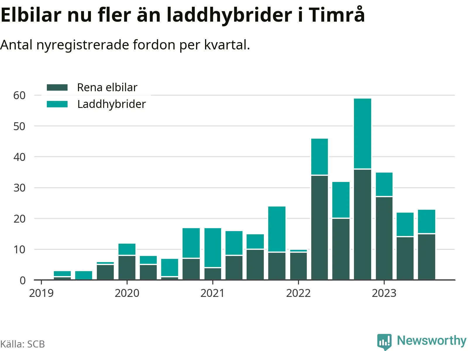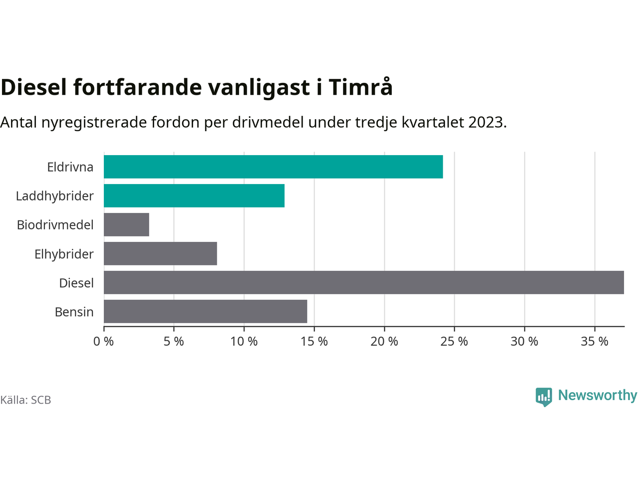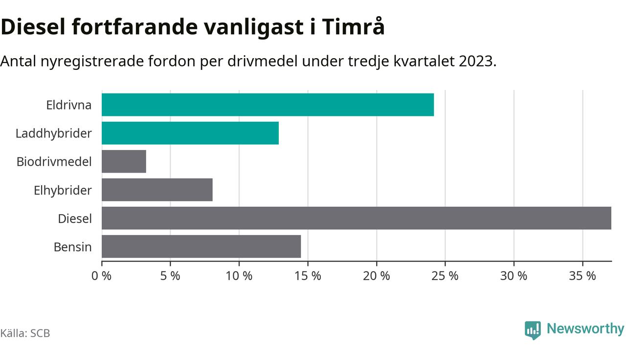 Under tredje kvartalet 2023 var 37 procent av alla nyregistrerade personbilar i Timrå laddbara (sammanlagt registrerades 62 nya bilar). Merparten av de laddbara bilarna var rena elbilar (24 procent av alla).