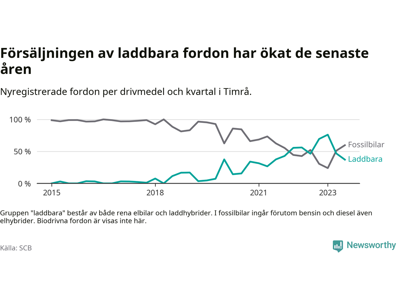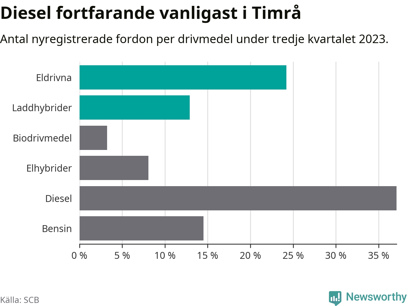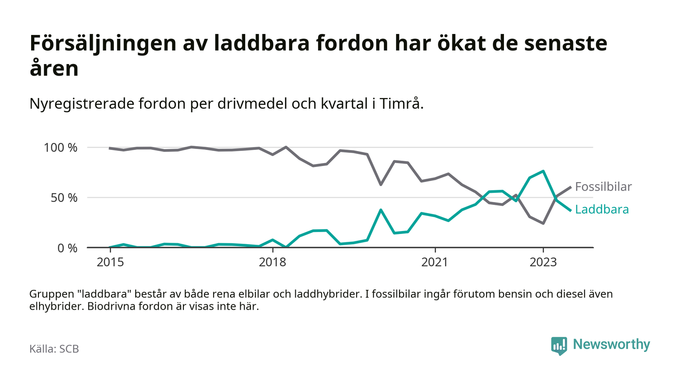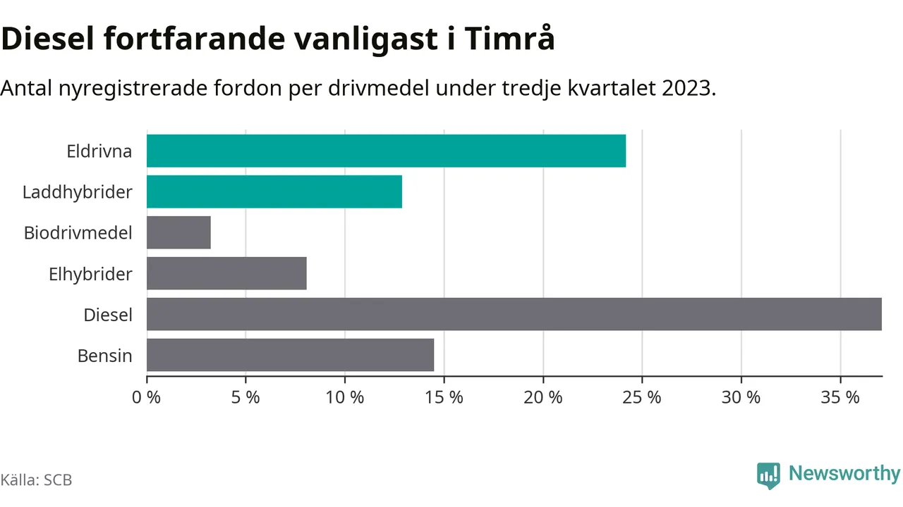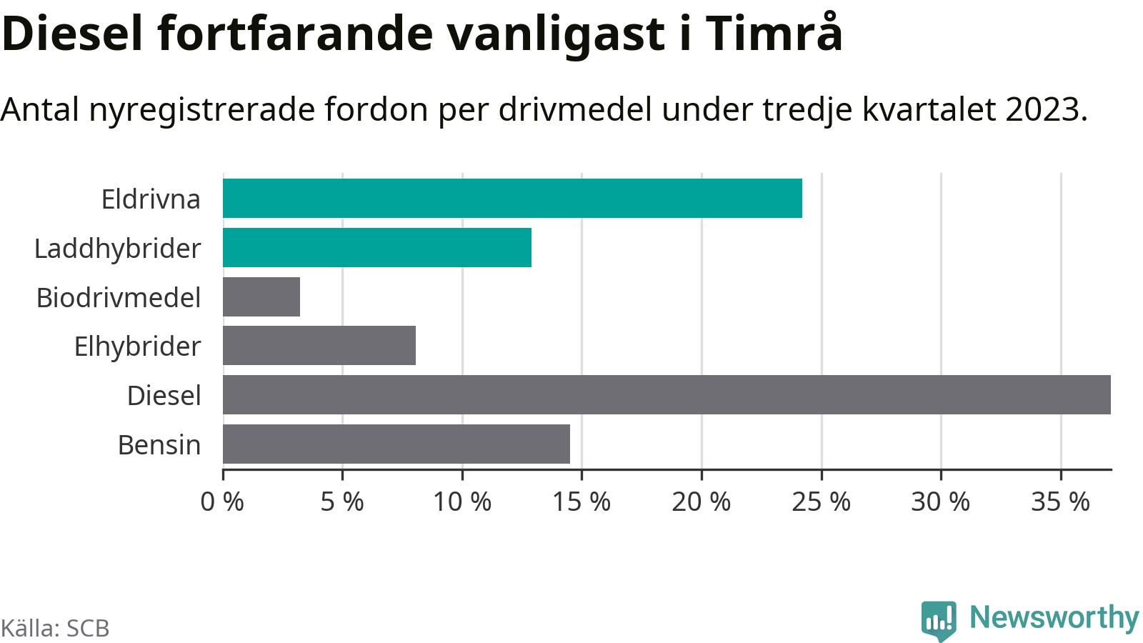 Under tredje kvartalet 2023 var 37 procent av alla nyregistrerade personbilar i Timrå laddbara (sammanlagt registrerades 62 nya bilar). Merparten av de laddbara bilarna var rena elbilar (24 procent av alla).
