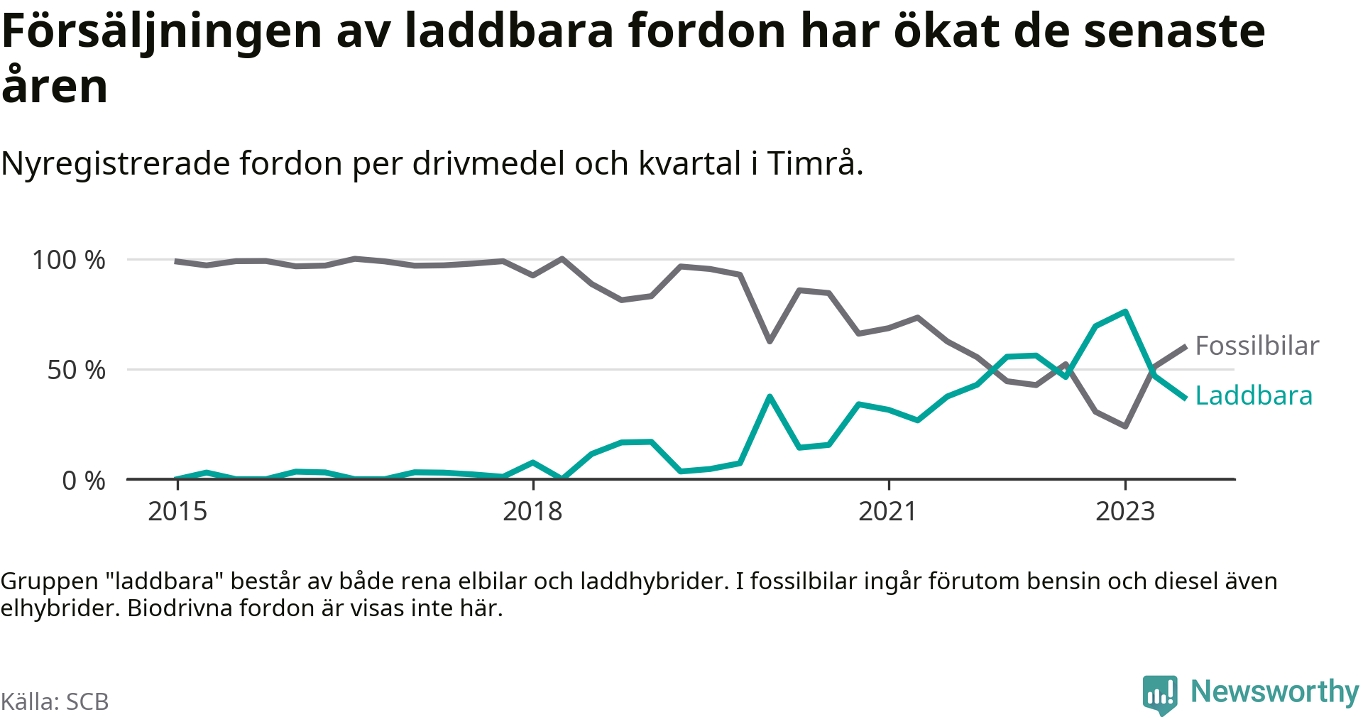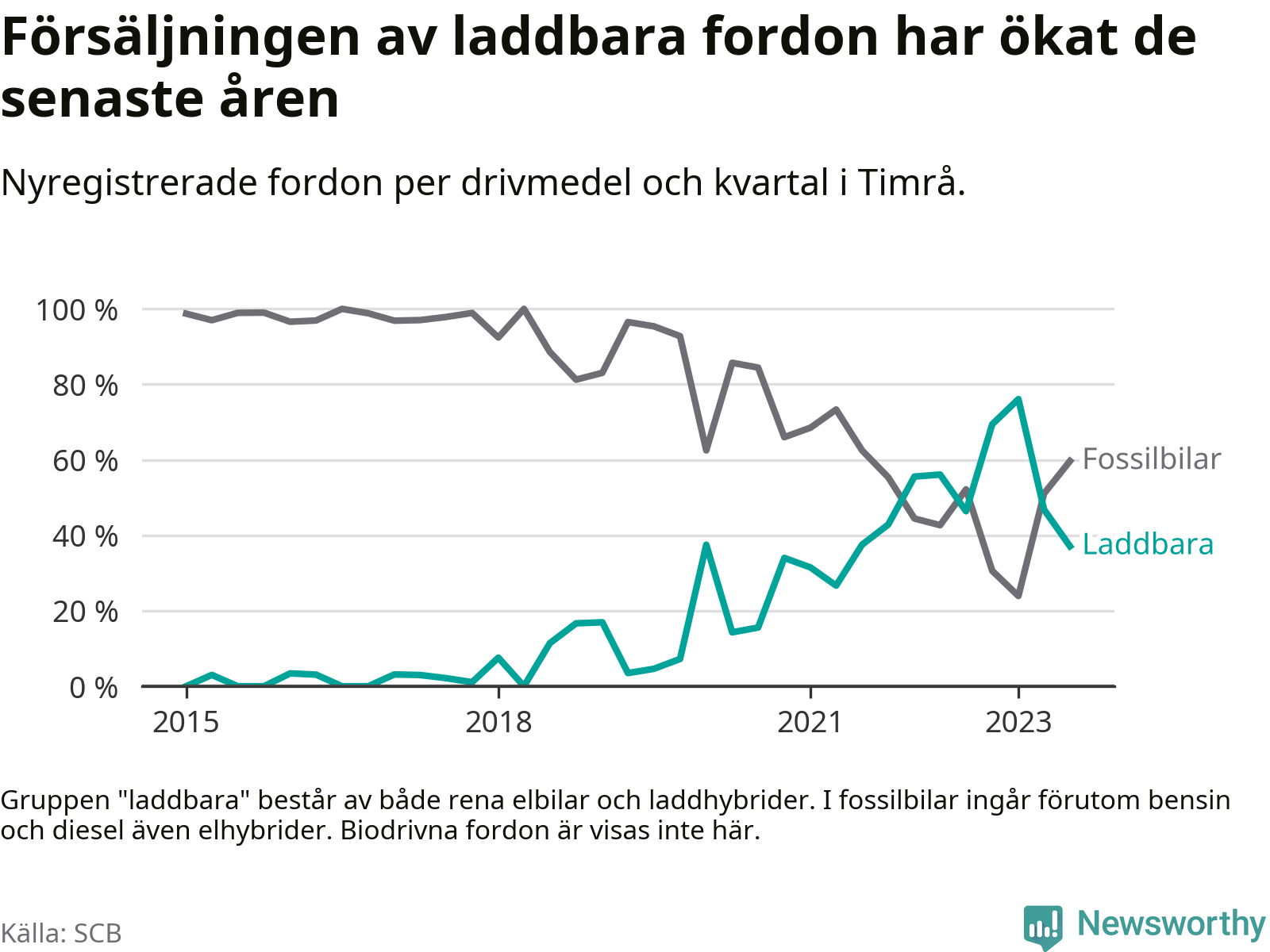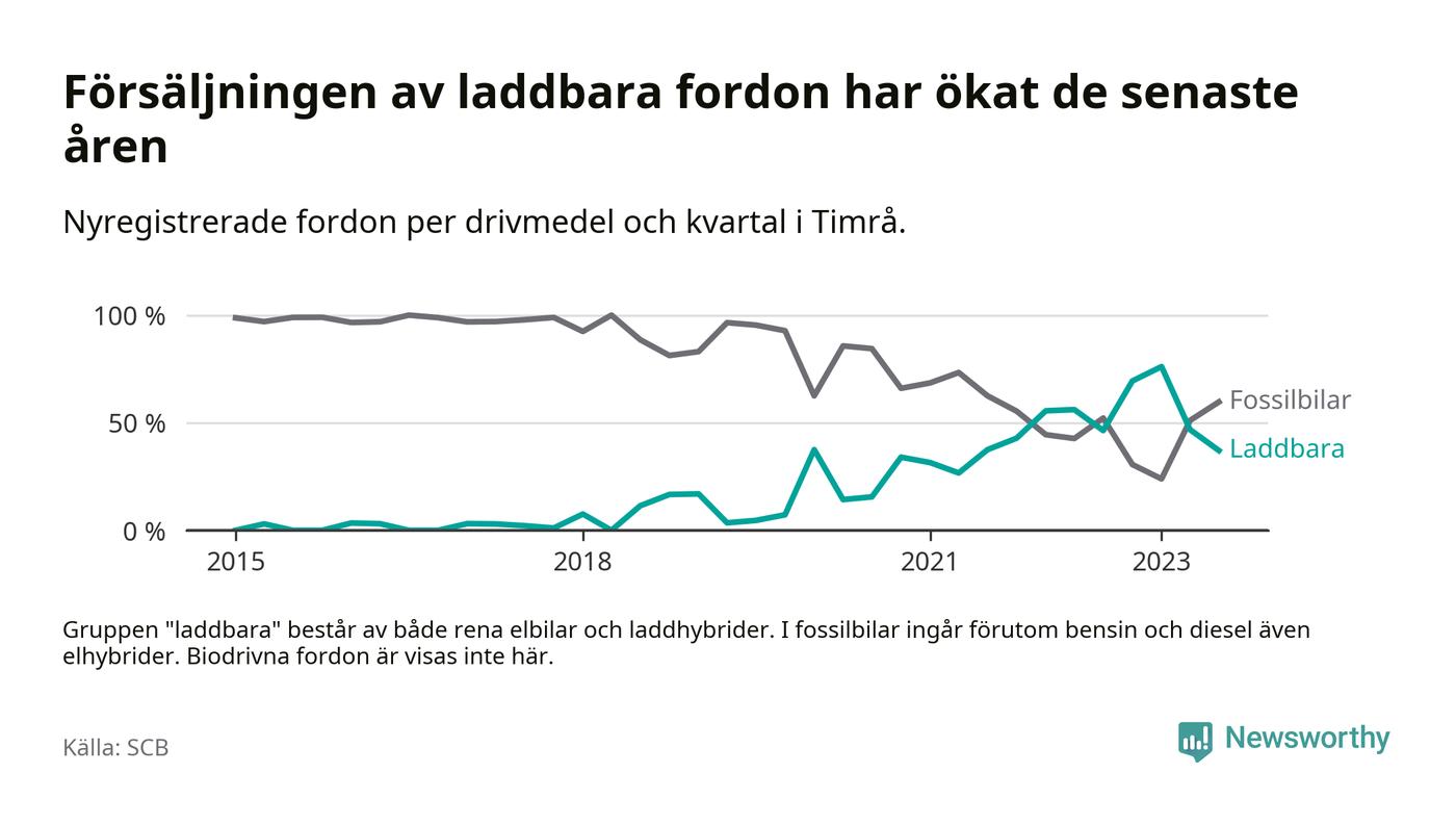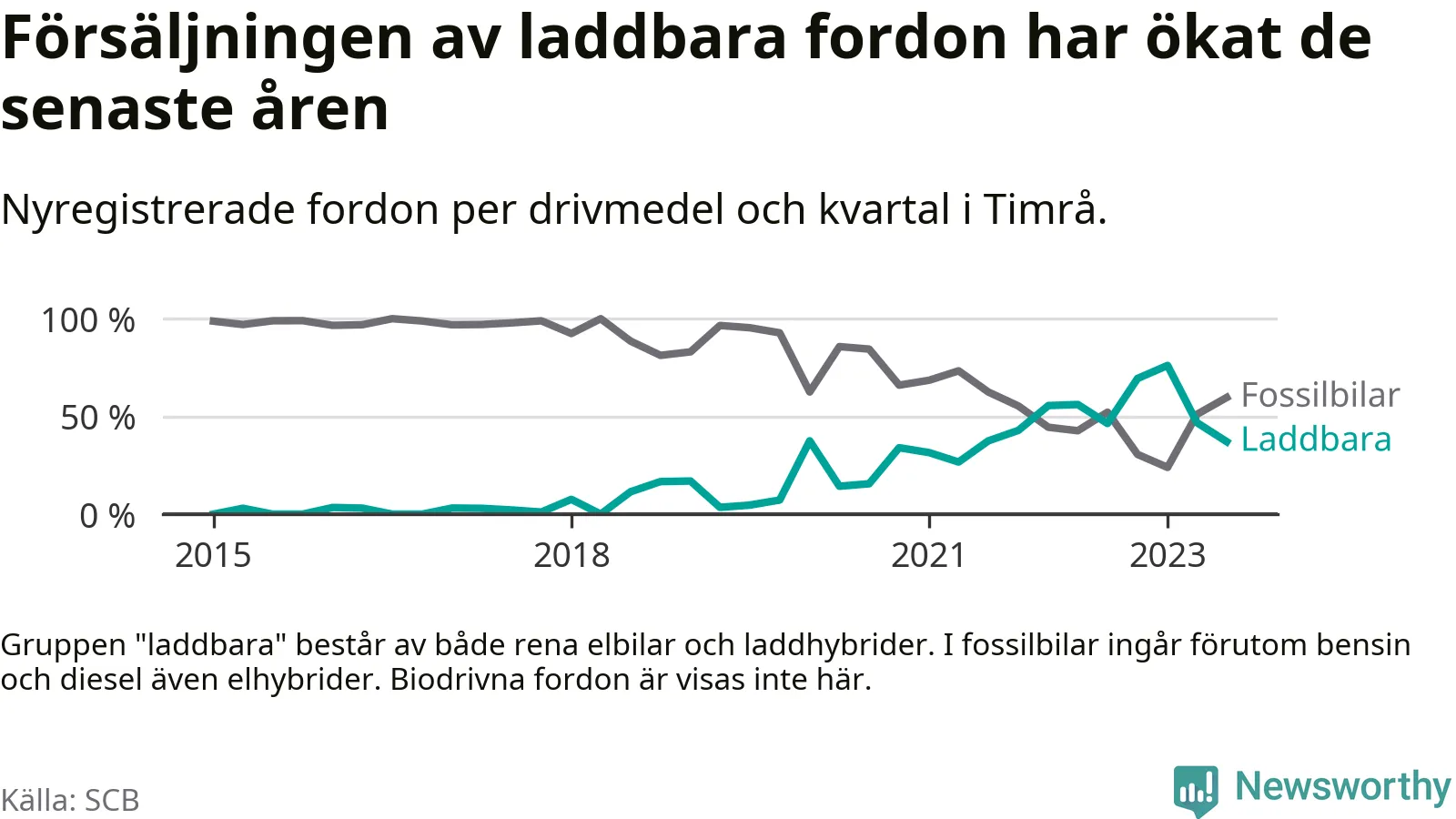 I Timrå var andelen laddbara bilar under tredje kvartalet också lägre än under första kvartalet 2023 då rekordet hittills noterades (76 procent).