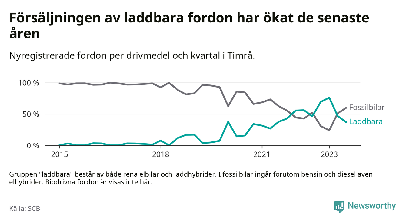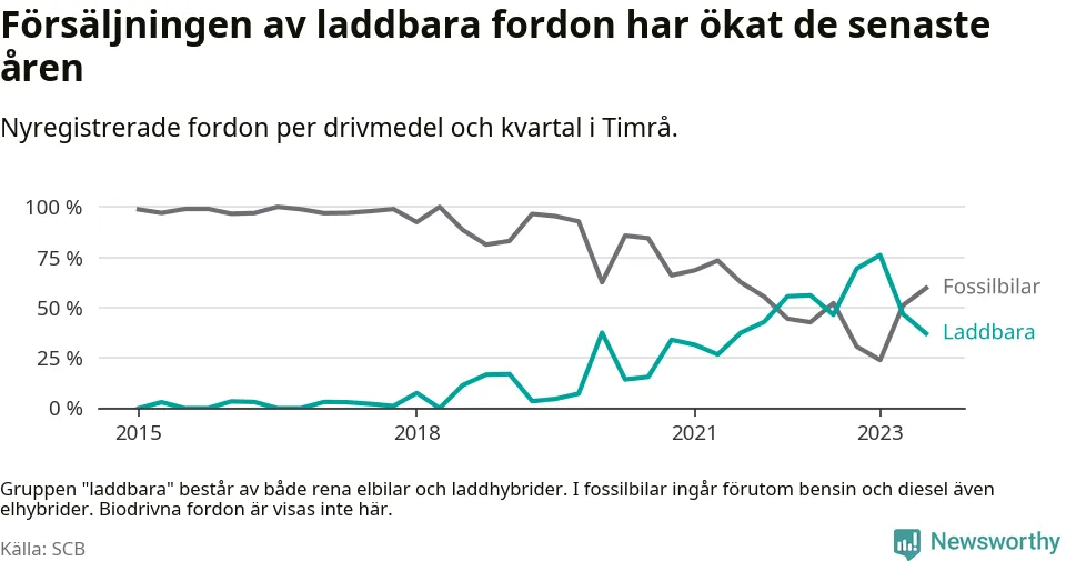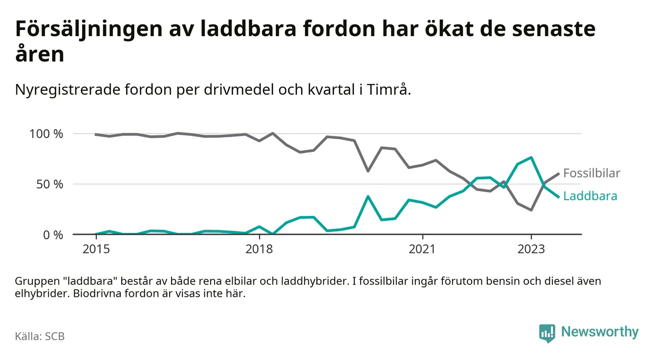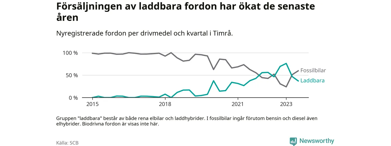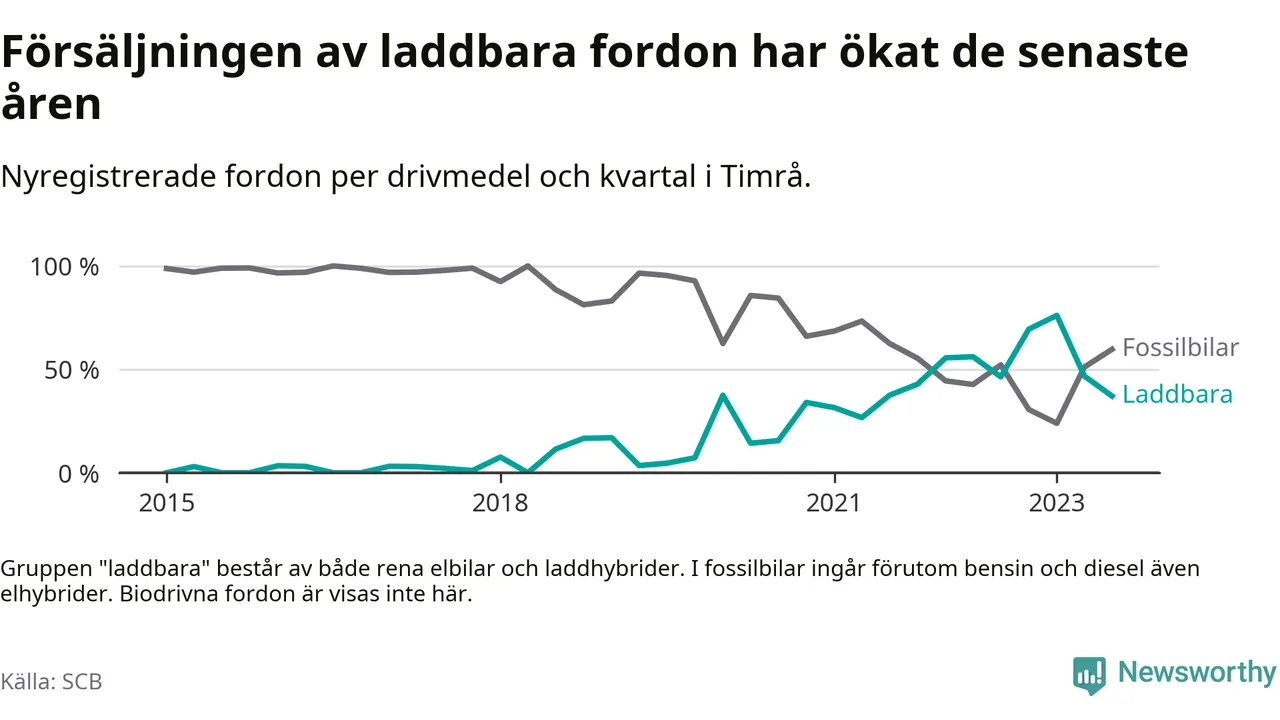 I Timrå var andelen laddbara bilar under tredje kvartalet också lägre än under första kvartalet 2023 då rekordet hittills noterades (76 procent).